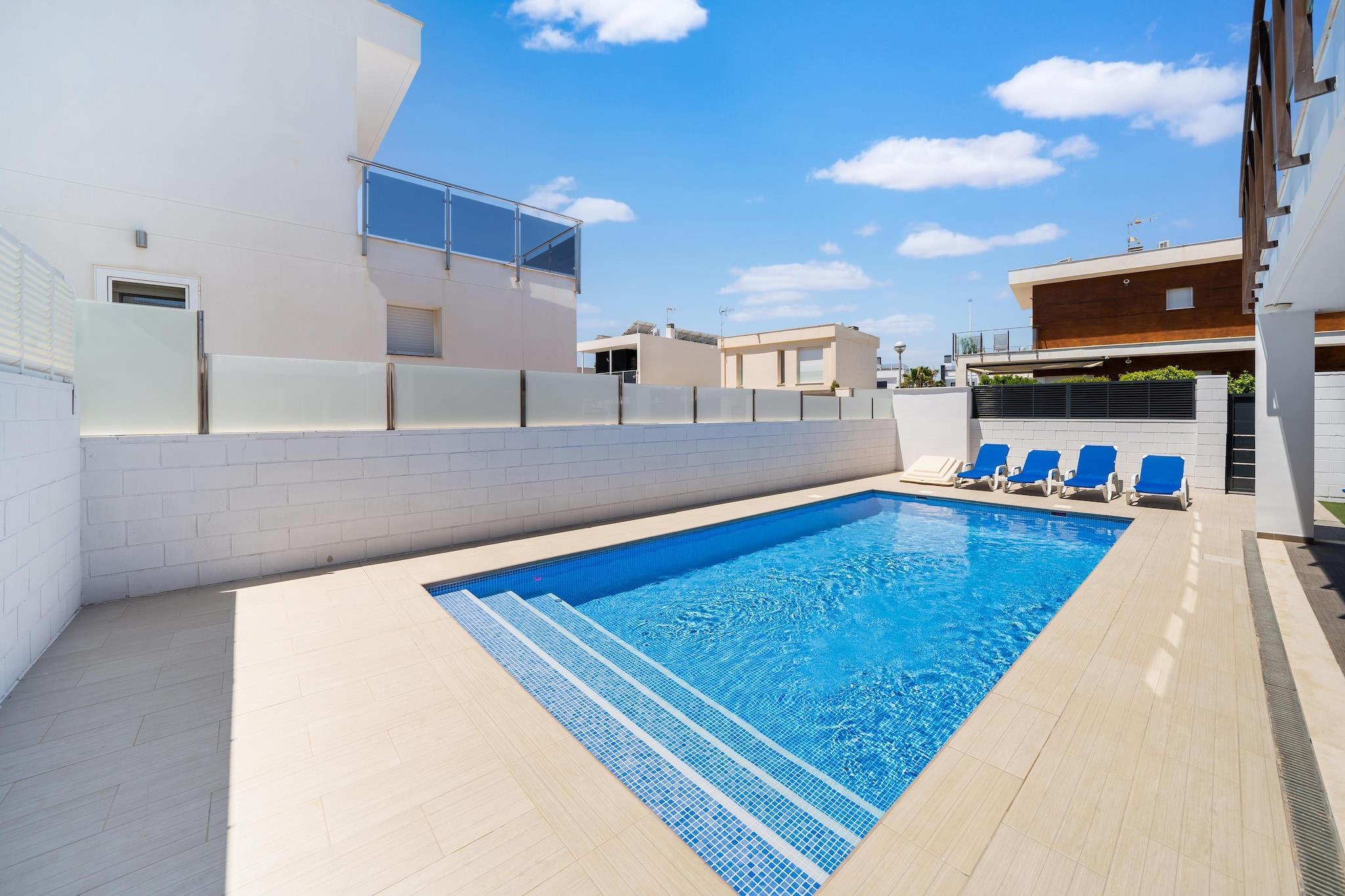 Entspannung am Pool Betreten Sie diese einladende Villa in Gran Alacant. Der private Pool bietet einen erfrischenden Rückzugsort unter der spanischen Sonne. Mit vier Schlafzimmern für bis zu acht Gäste ist sie ideal für Familien oder Gruppen, die Platz und Komfort suchen. Genießen Sie sonnige Morgen am Pool oder entspannen Sie nach einem erlebnisreichen Tag im möblierten Garten bei einem kühlen Getränk. Strände und Restaurants in der Nähe Der nur 5 km entfernte Strand Carabassi bietet weichen Sand und sanfte Wellen für einen perfekten Strandtag. Auch Santa Pola ist für weitere Küstenabenteuer leicht erreichbar. Der nächste Supermarkt und lokale Restaurants sind nur 900 Meter entfernt, sodass Sie frische Mahlzeiten und Vorräte bequem erhalten, ohne wertvolle Urlaubszeit zu verlieren. Komfortable Innenausstattung Die Villa verfügt über einen geräumigen, klimatisierten Wohnbereich mit TV und eine voll ausgestattete Küche für hausgemachte Mahlzeiten. Zwei Waschmaschinen erleichtern das Wäschewaschen. Zu den familienfreundlichen Annehmlichkeiten gehören ein Kinderbett und ein Hochstuhl. Parkplätze stehen vor Ort zur Verfügung. Der Flughafen Alicante ist nur 10 km entfernt, was eine reibungslose An- und Abreise ermöglicht.