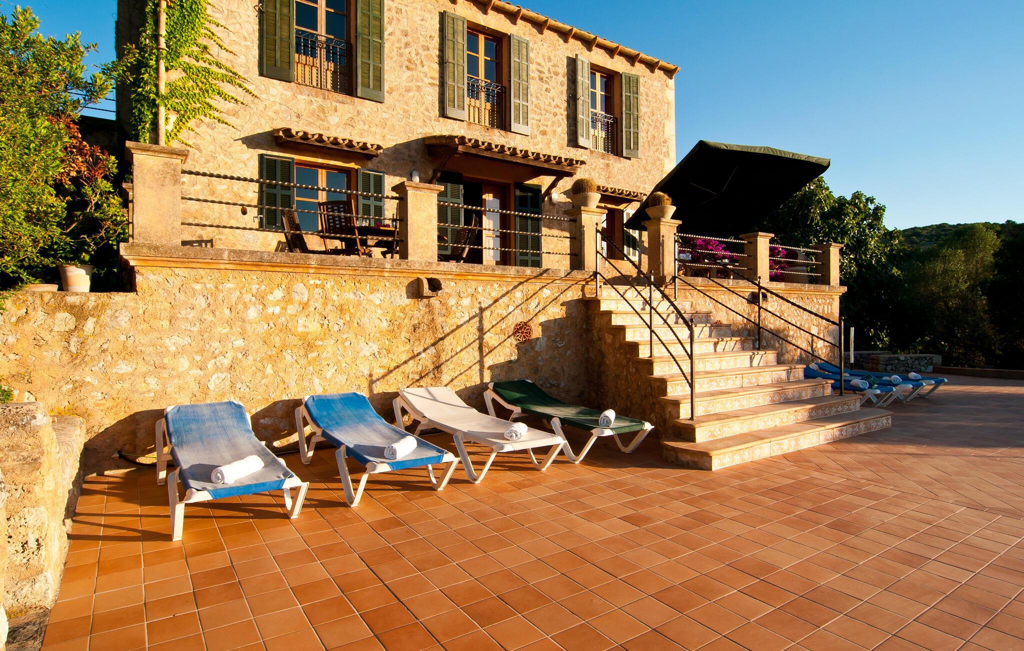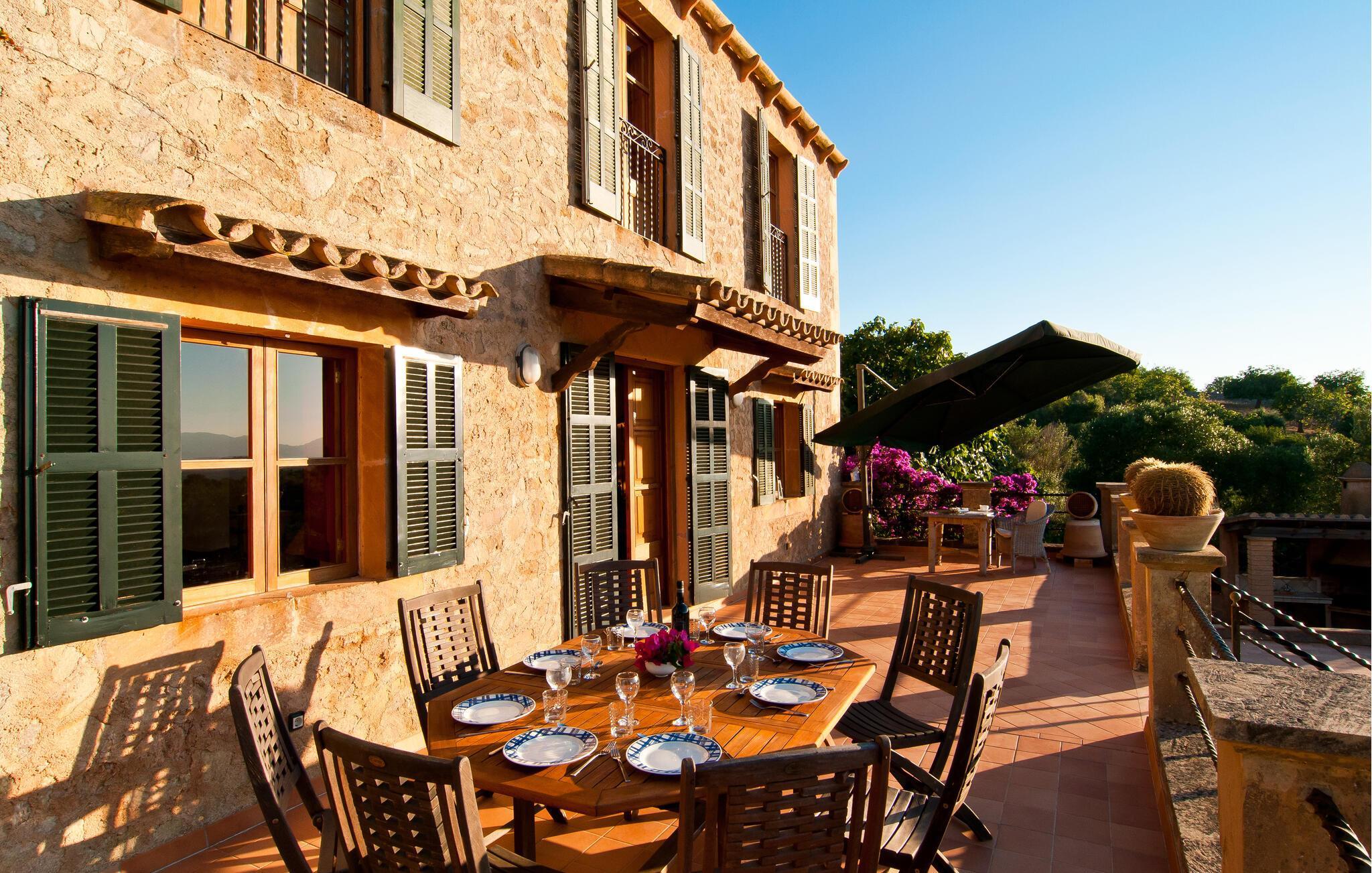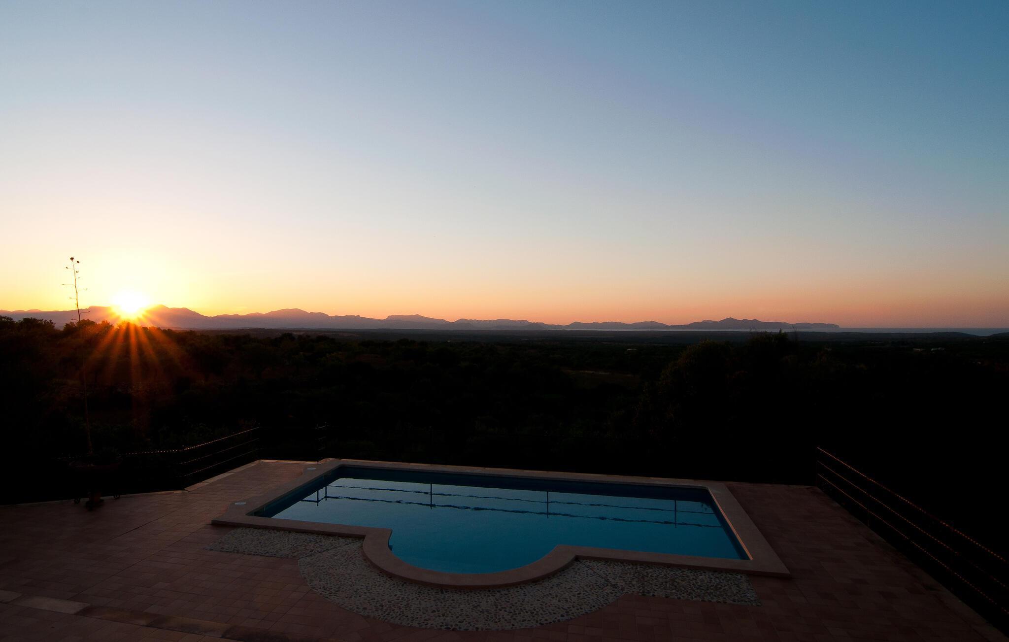 Wer seinen Villenurlaub gerne in stilvollem, mediterranem und ruhigem Ambiente verbringt, ist hier genau richtig. Die komfortable Villa „Grandiosa“ liegt in besonders exponierter Lage auf einem riesigen Grundstück. Aufgrund der erhöhten Lage genießt man von hier aus einen wirklich grandiosen Ausblick, mit dem die Villa ihrem Namen alle Ehre macht. Mehrere Zonen des Gartenbereichs wurden im mediterranen Stil gestaltet, der Rest der Villa besticht durch üppige Vegetation und besticht durch seine wunderschöne natürliche Reinheit. Eine 300 m² große Terrassenfläche, verteilt auf verschiedene Ebenen und ansprechend möbliert, bietet vielfältige Möglichkeiten zum Verweilen im Freien. Wenn Sie möchten, finden Sie immer wieder einen neuen Lieblingsplatz. Selbst an sehr warmen und sonnigen Tagen finden Sie immer ein Plätzchen mit luftigem Schatten. Der Pool hat die Maße 9 x 4,5 m und ist dekorativ in den Terrassenbereich eingebettet. Der Pool ist sehr bequem über breite, halbrunde Treppen erreichbar. Eine ausreichende Anzahl bequemer Liegen bietet ideale Voraussetzungen für Sonnenliebhaber, um unter dem tiefblauen Mittelmeerhimmel ausgiebig zu entspannen. In der stilvollen Grillecke können Sie nach Herzenslust grillen und dabei kulinarische Köstlichkeiten aus der Region probieren. Die abendlichen Sonnenuntergänge und der Panoramablick über die Gegend bis hin zum Tramuntana-Gebirge sowie die Küste der Bucht von Alcúdia sind ein wahrer Traum und stellen eine unvergleichliche Form von Luxus dar.