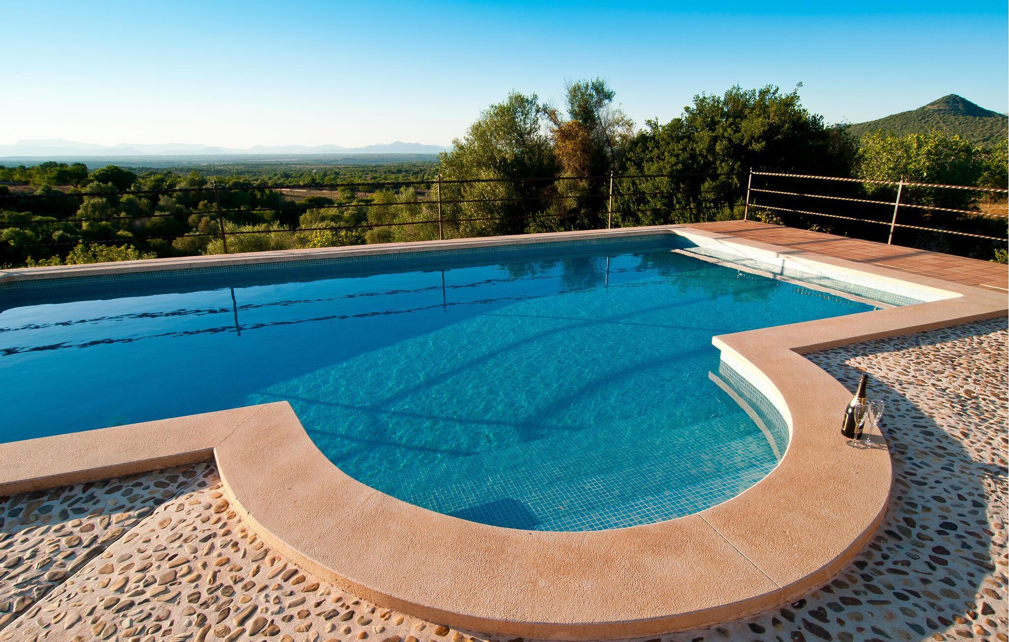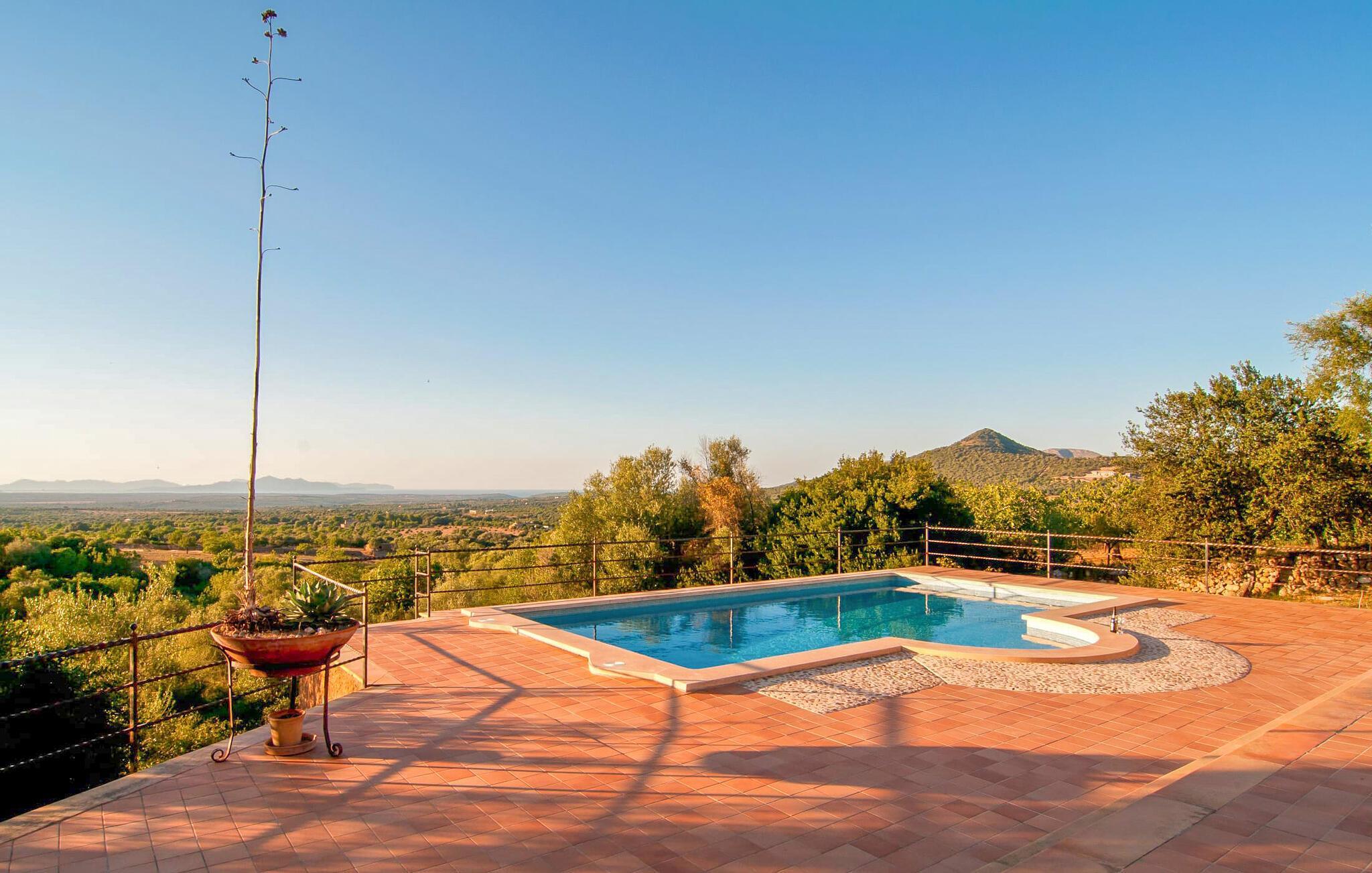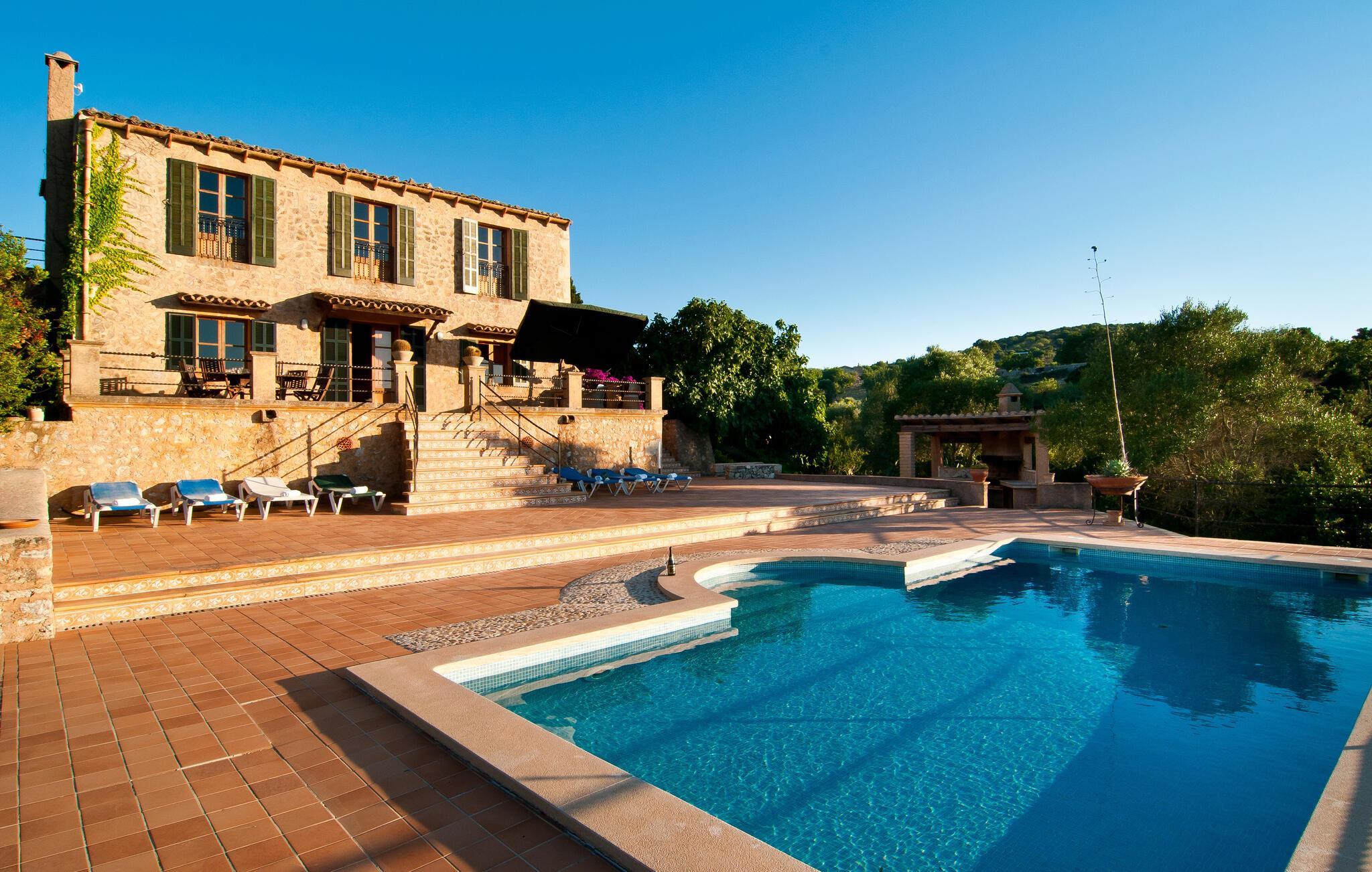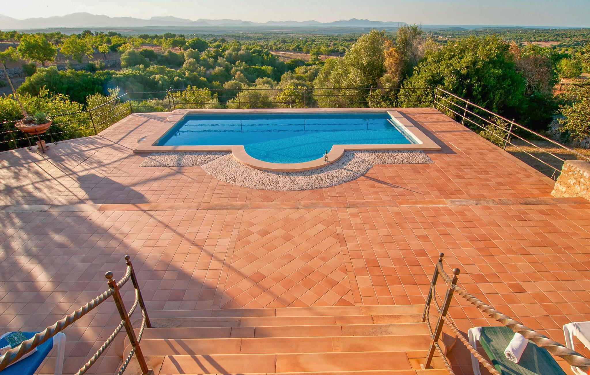 Wer seinen Villenurlaub gerne in stilvollem, mediterranem und ruhigem Ambiente verbringt, ist hier genau richtig. Die komfortable Villa „Grandiosa“ liegt in besonders exponierter Lage auf einem riesigen Grundstück. Aufgrund der erhöhten Lage genießt man von hier aus einen wirklich grandiosen Ausblick, mit dem die Villa ihrem Namen alle Ehre macht. Mehrere Zonen des Gartenbereichs wurden im mediterranen Stil gestaltet, der Rest der Villa besticht durch üppige Vegetation und besticht durch seine wunderschöne natürliche Reinheit. Eine 300 m² große Terrassenfläche, verteilt auf verschiedene Ebenen und ansprechend möbliert, bietet vielfältige Möglichkeiten zum Verweilen im Freien. Wenn Sie möchten, finden Sie immer wieder einen neuen Lieblingsplatz. Selbst an sehr warmen und sonnigen Tagen finden Sie immer ein Plätzchen mit luftigem Schatten. Der Pool hat die Maße 9 x 4,5 m und ist dekorativ in den Terrassenbereich eingebettet. Der Pool ist sehr bequem über breite, halbrunde Treppen erreichbar. Eine ausreichende Anzahl bequemer Liegen bietet ideale Voraussetzungen für Sonnenliebhaber, um unter dem tiefblauen Mittelmeerhimmel ausgiebig zu entspannen. In der stilvollen Grillecke können Sie nach Herzenslust grillen und dabei kulinarische Köstlichkeiten aus der Region probieren. Die abendlichen Sonnenuntergänge und der Panoramablick über die Gegend bis hin zum Tramuntana-Gebirge sowie die Küste der Bucht von Alcúdia sind ein wahrer Traum und stellen eine unvergleichliche Form von Luxus dar.