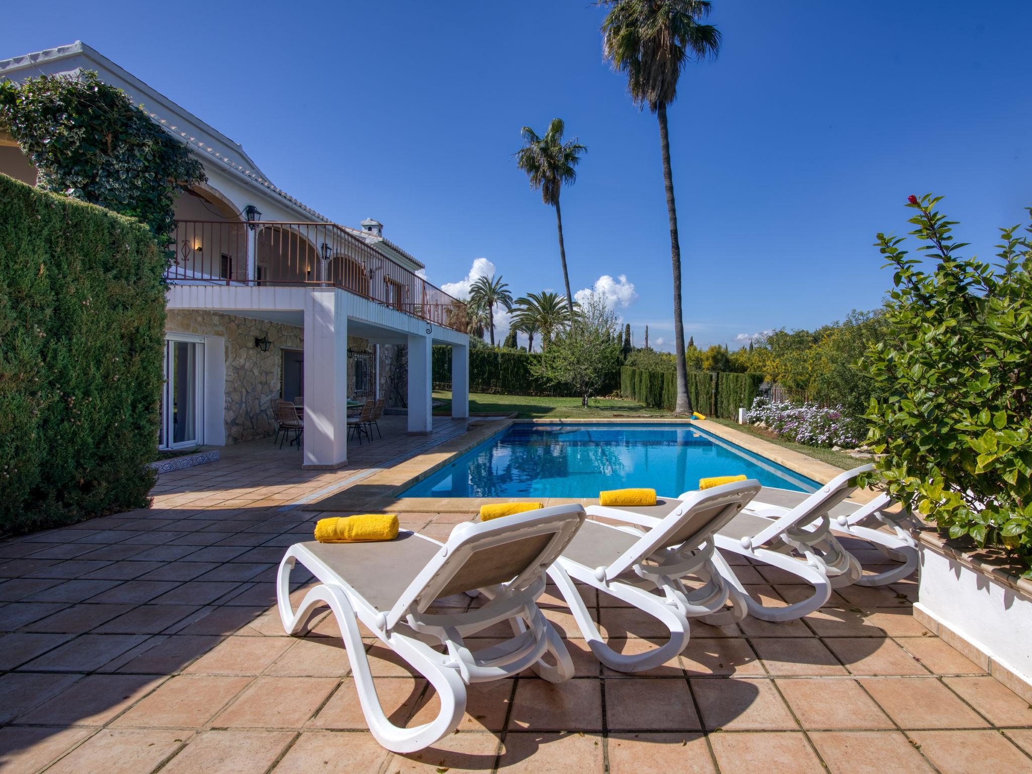 Sehr grosse, sehr schöne, luxuriöse Villa "Bellavista", auf 2 Stockwerken. 3 km vom Zentrum von Jávea - El Arenal, ruhige, sonnige Lage, 3 km vom Meer, 3 km vom Strand. Zur Alleinbenutzung: grosser, schöner, gepflegter Garten mit Rasen und Bäumen, Schwimmbad eckig (10 x 5 m, 80 - 210 cm tief, saisonale Verfügbarkeit: 01.Jan. - 31.Dez.) mit Innentreppe. Poolhaus mit Kühlschrank, Sitzplatz, Laube, Pergola, Gartenmöbel, Grillhaus, Parkplatz (für 3 Autos) auf dem Grundstück. Einkaufsgeschäft 850 m, Supermarkt 2 km, Restaurant 800 m, Bar 850 m, Bushaltestelle "Farmacia Salort" 2.5 km, Sandstrand "El Arenal" 3 km, Steinstrand "Portitxol" 5 km. Golfplatz (9 Loch) 5 km, Surfschule 3 km, Segelschule 3 km, Tennis 3 km. Bitte beachten: Fahrzeug empfohlen. Jugendgruppen nur auf Anfrage.