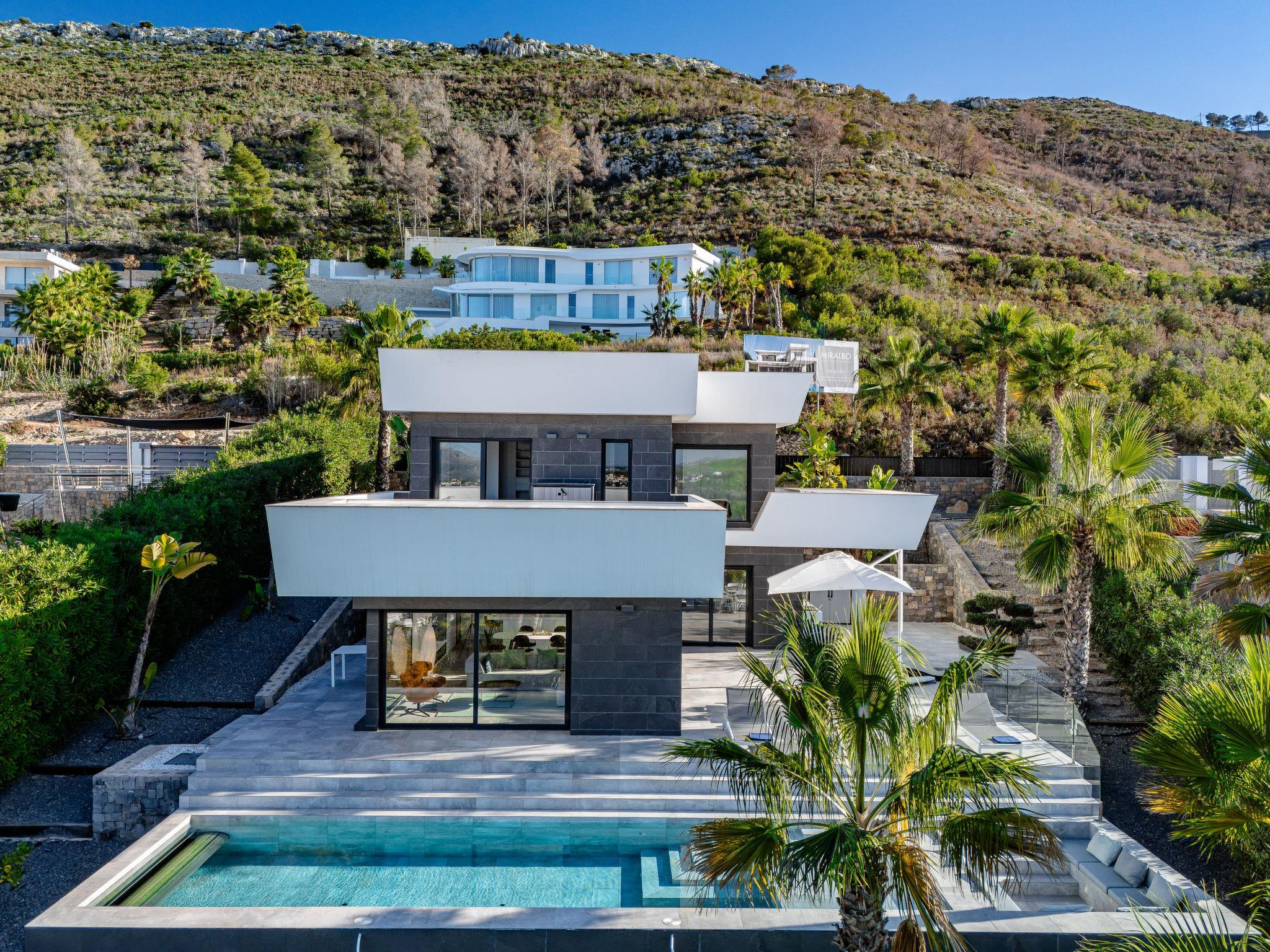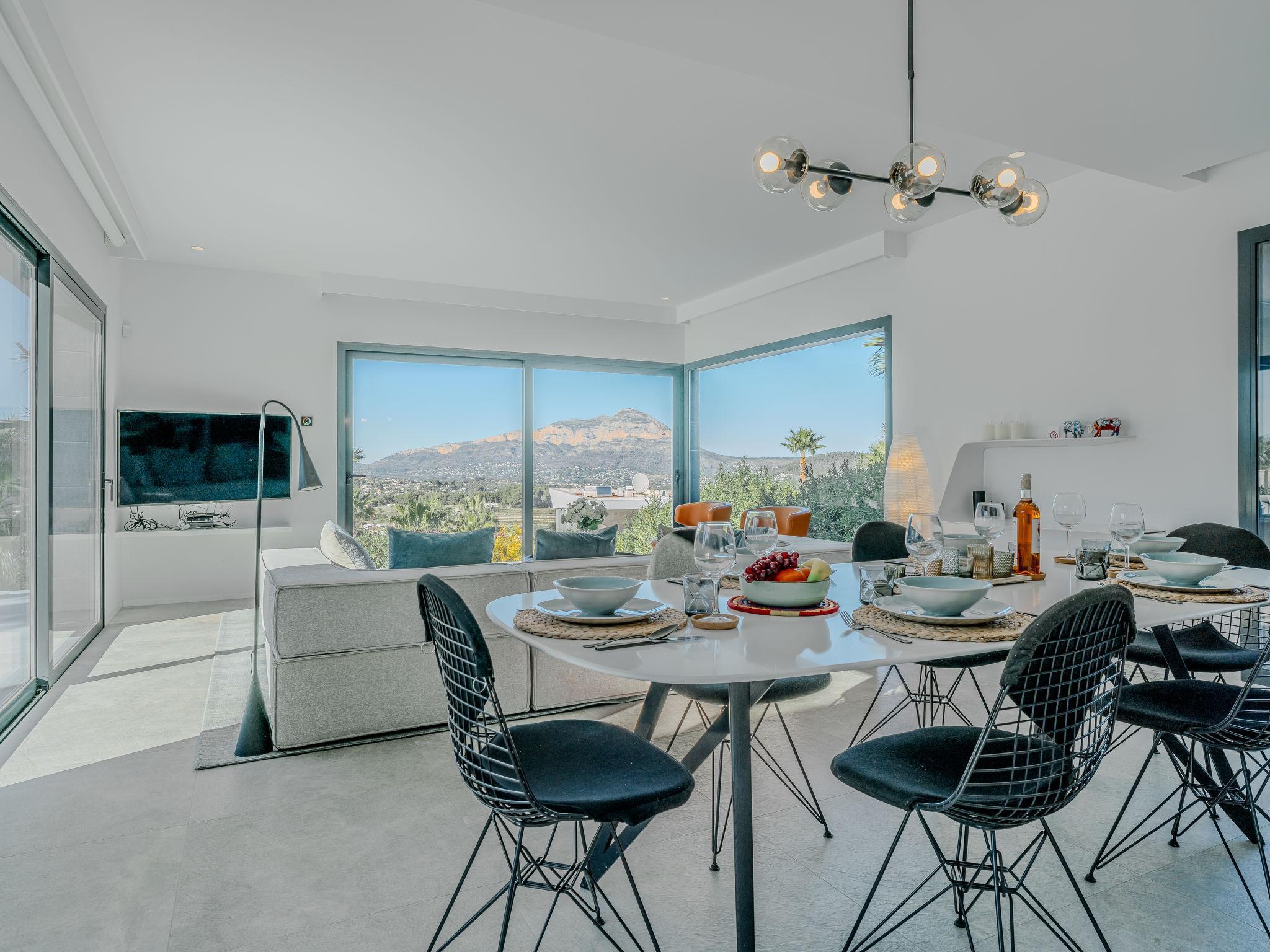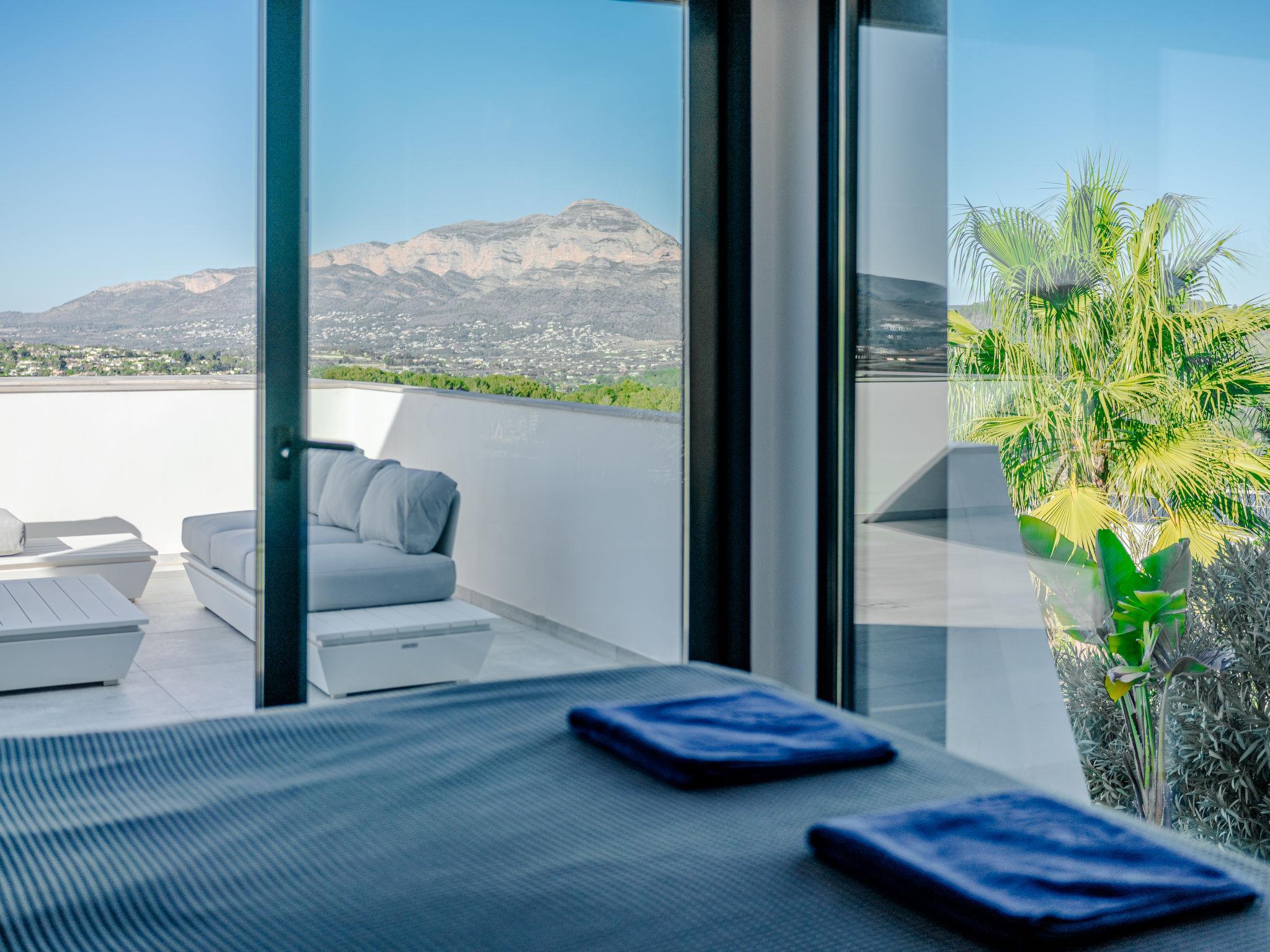 Sehr grosse, sehr moderne, luxuriöse Villa "Leda", auf 2 Stockwerken. Im Ortsteil Cansalades Park Monte Olimpo, 5 km vom Zentrum von Jávea - El Arenal, 8 km vom Zentrum von Moraira, ruhige, sonnige Lage, 5 km vom Meer, 5 km vom Strand. Zur Alleinbenutzung: grosser, schöner, gepflegter terrassierter Garten Pflanzen und Bäumen, Schwimmbad eckig, beheizt (12 x 3 m, 36 m2, 40 - 150 cm tief, saisonale Verfügbarkeit: 01.Jan. - 31.Dez.) mit Innentreppe und Rollladenabdeckung. WC im Poolbereich, Aussendusche, Pergola, Terrasse, Gartenmöbel. Im Hause: Zentralheizung, Klimaanlage, Alarmanlage. Parkplatz (für 2 Autos, überdacht) auf dem Grundstück. Supermarkt 2.5 km, Restaurant 1 km, Bar 2.5 km, Bäckerei 2.5 km, Café 2.5 km, Bushaltestelle 6.4 km, Sandstrand "El Arenal" 5 km, Steinstrand "La Granadella" 10 km. Sporthafen 6 km, Jacht-Hafen 6 km, Golfplatz (9 Loch) 3 km, Surfschule 5 km, Segelschule 5 km, Tennis 3 km. Bitte beachten: Fahrzeug empfohlen. Der Besitzer akzeptiert keine Jugendgruppen.