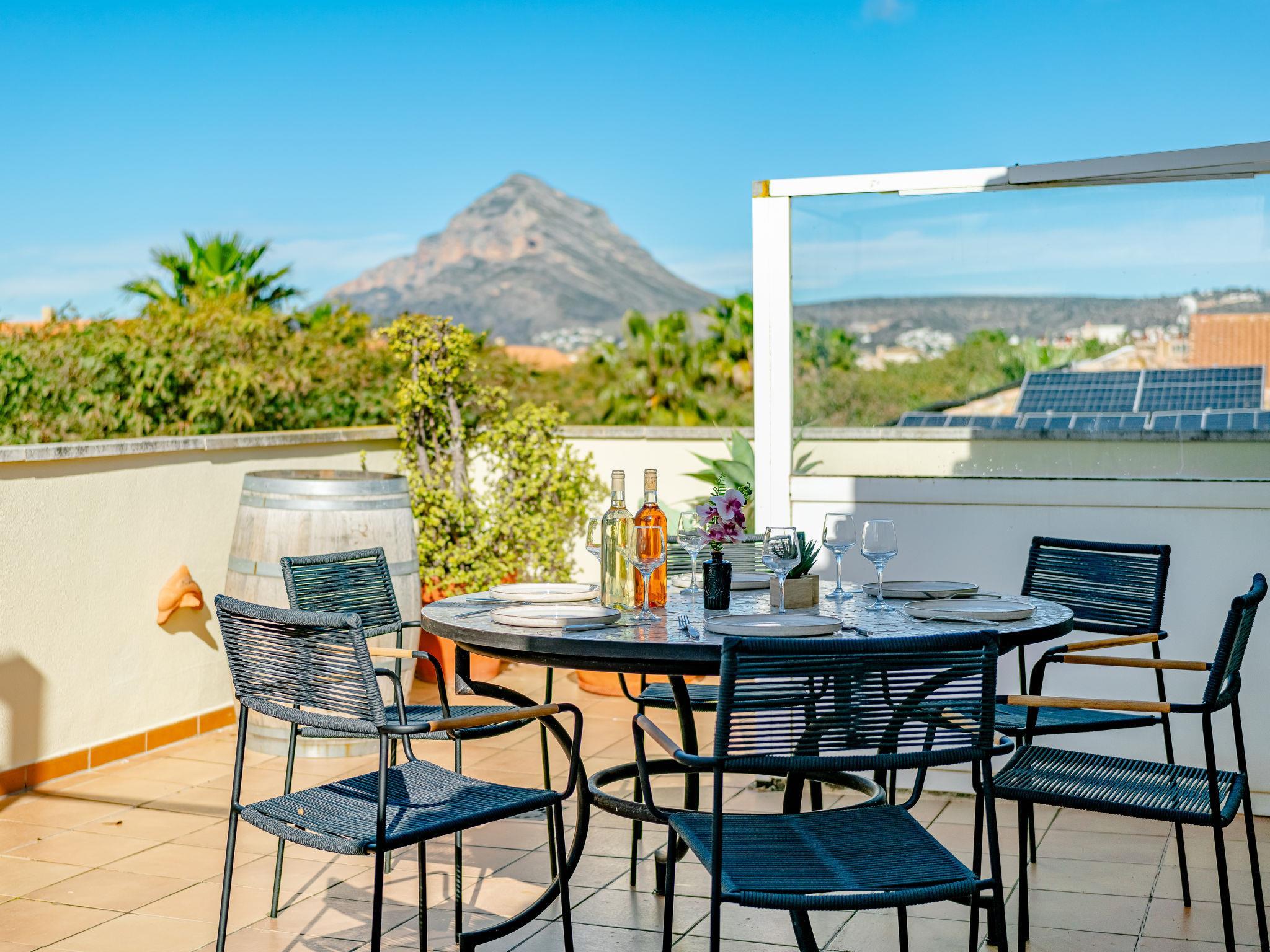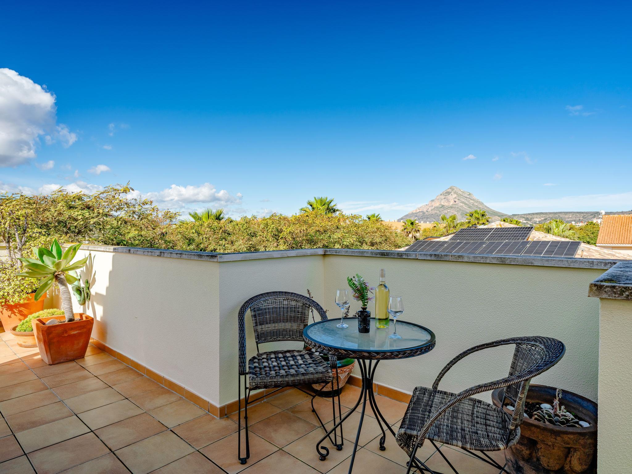 "Jardines del Pla", 4-Zimmer-Maisonette-Wohnung 180 m2 auf 2 Stockwerken. Geräumig und hell, sehr schön und stilvoll eingerichtet: Wohn-/Esszimmer mit Digital-TV, Klimaanlage und Warmluftheizung. Ausgang zur Terrasse. 1 Zimmer 12 m2 mit 1 franz. Bett (180 cm, Länge 200 cm), Dusche/Bidet/WC, Klimaanlage und Warmluftheizung. 1 Zimmer mit 2 Betten (80 cm, Länge 200 cm), Klimaanlage und Warmluftheizung. Grosse Küche (Backofen, Geschirrspüler, 4 Glaskeramikplatten, Toaster, Mikrowelle, Tiefkühler, elektrische Kaffeemaschine, Kapseln für die Kaffeemaschine (Nespresso Not.Incl.)). Dusche/WC. Bodenheizung. Obergeschoss: 1 Zimmer mit 1 franz. Bett (2 x 90 cm, Länge 200 cm), Klimaanlage und Warmluftheizung. Ausgang zur Terrasse. Bad/Bidet/WC. Bodenheizung. Grosse Terrasse 45 m2, überdacht, Ostlage, grosse Terrasse 60 m2, Südlage. Terrassenmöbel, Liegestühle, Loggia. Sehr schöne Sicht auf die Berge, das Tal, das Schwimmbad und den Garten. Zur Verfügung: Waschmaschine, Bügeleisen, Haartrockner. Internet (WLAN, gratis). Garage. Bitte beachten: Nichtraucher-Haus. TV nur ES. AT-502454-A // Reg. Nr.: ESFCTU00000307100061367200000000000000000AT-502454-A6