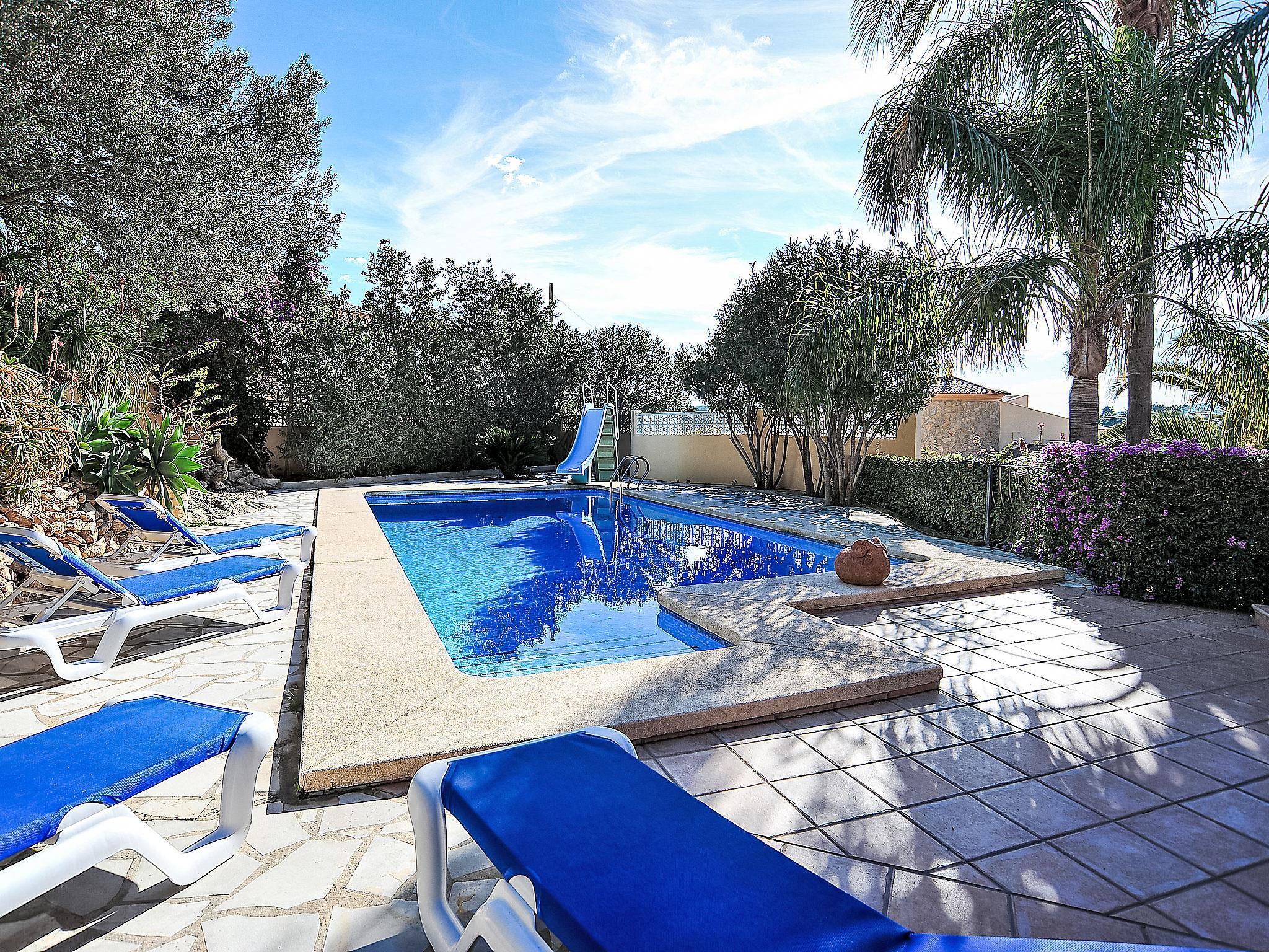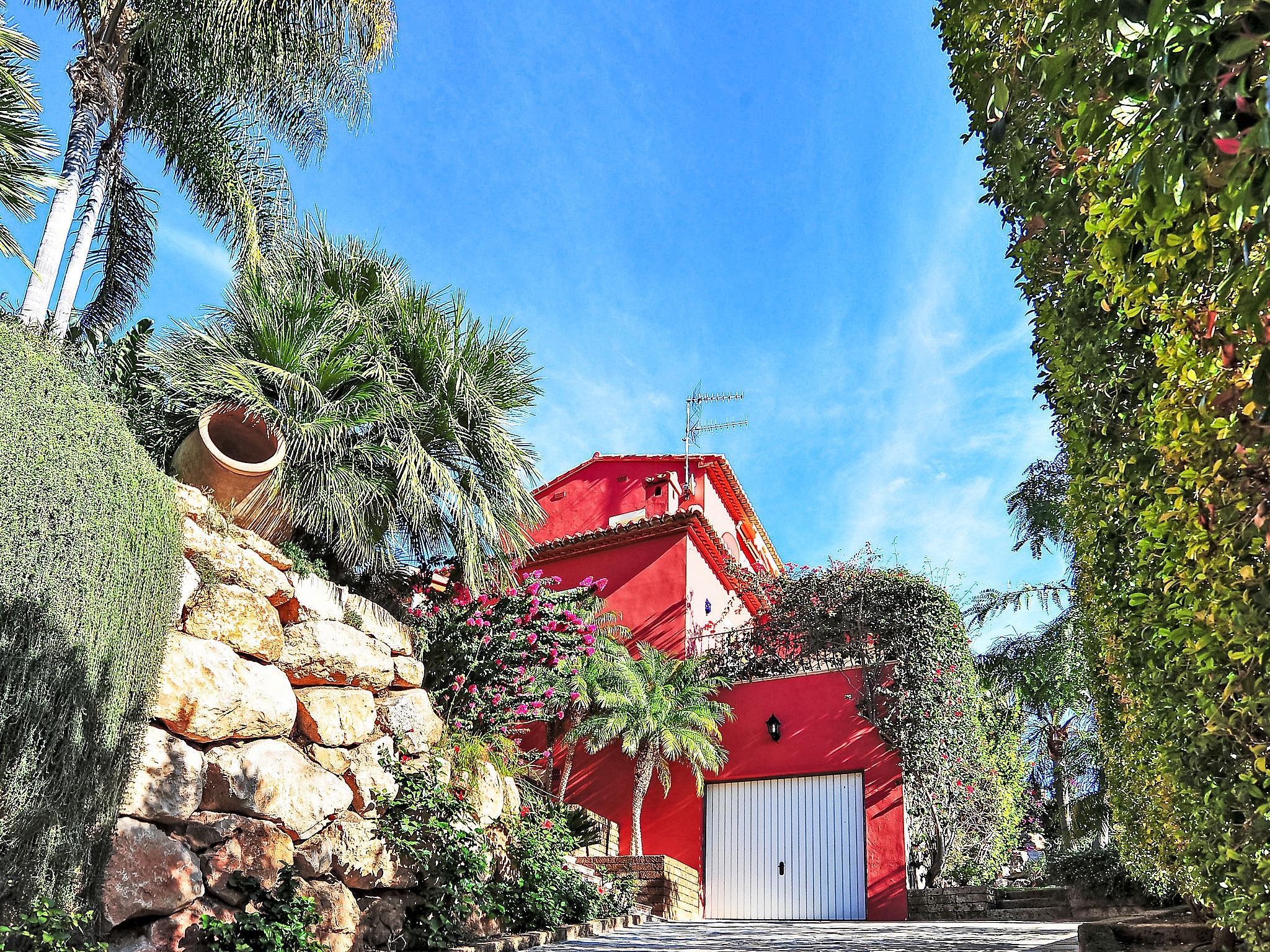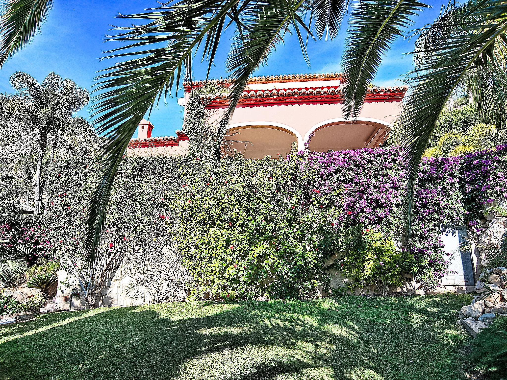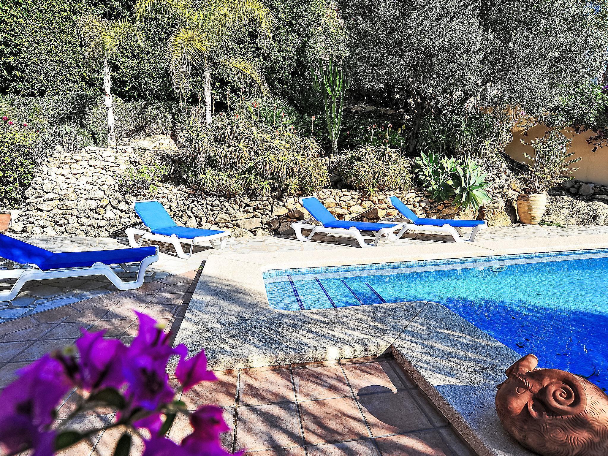 Schöne Villa "Aviles", auf 2 Stockwerken. Im Ortsteil Castellans, ruhige, sonnige Lage, 9 km vom Meer, in einer Sackgasse. Zur Alleinbenutzung: schöner, gepflegter Garten 1'800 m2 (eingezäunt) mit Rasen und Pflanzen, Schwimmbad nicht einsehbar, eingezäunt (4 x 9 m, saisonale Verfügbarkeit: 01.Jan. - 31.Dez.) mit Innentreppe. Rutschbahn. Treppenweg (23 Stufen) bis zum Haus. Supermarkt 2 km, Restaurant 1 km, Bushaltestelle "Estacion de autobuses Javea" 2 km, Sandstrand "Arenal" 9 km. Jugendgruppen nur auf Anfrage.