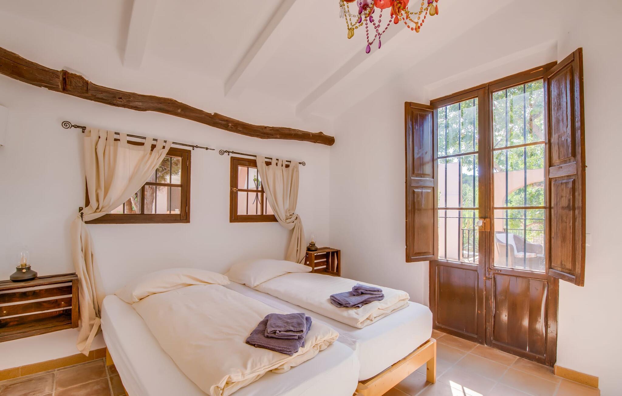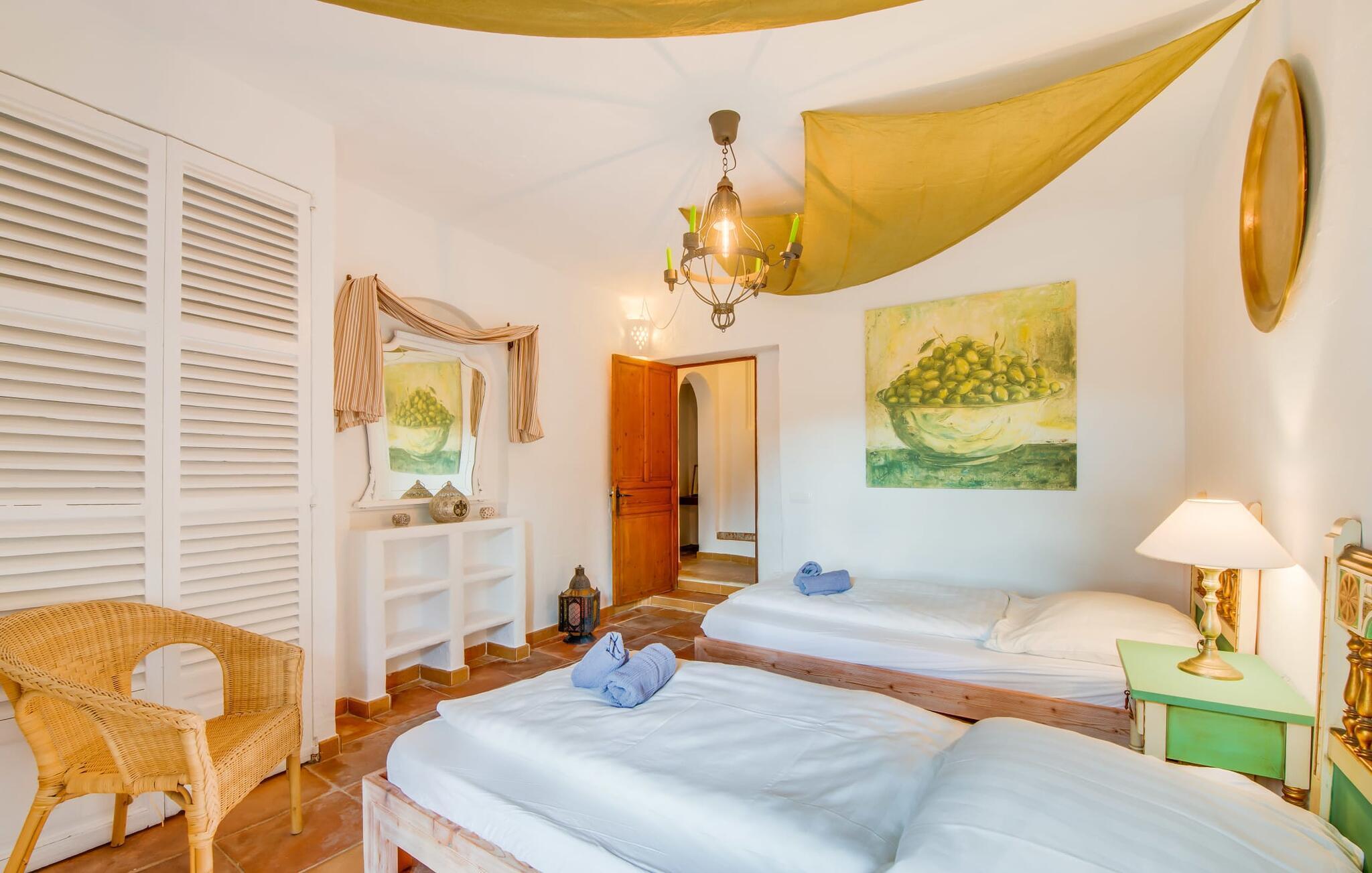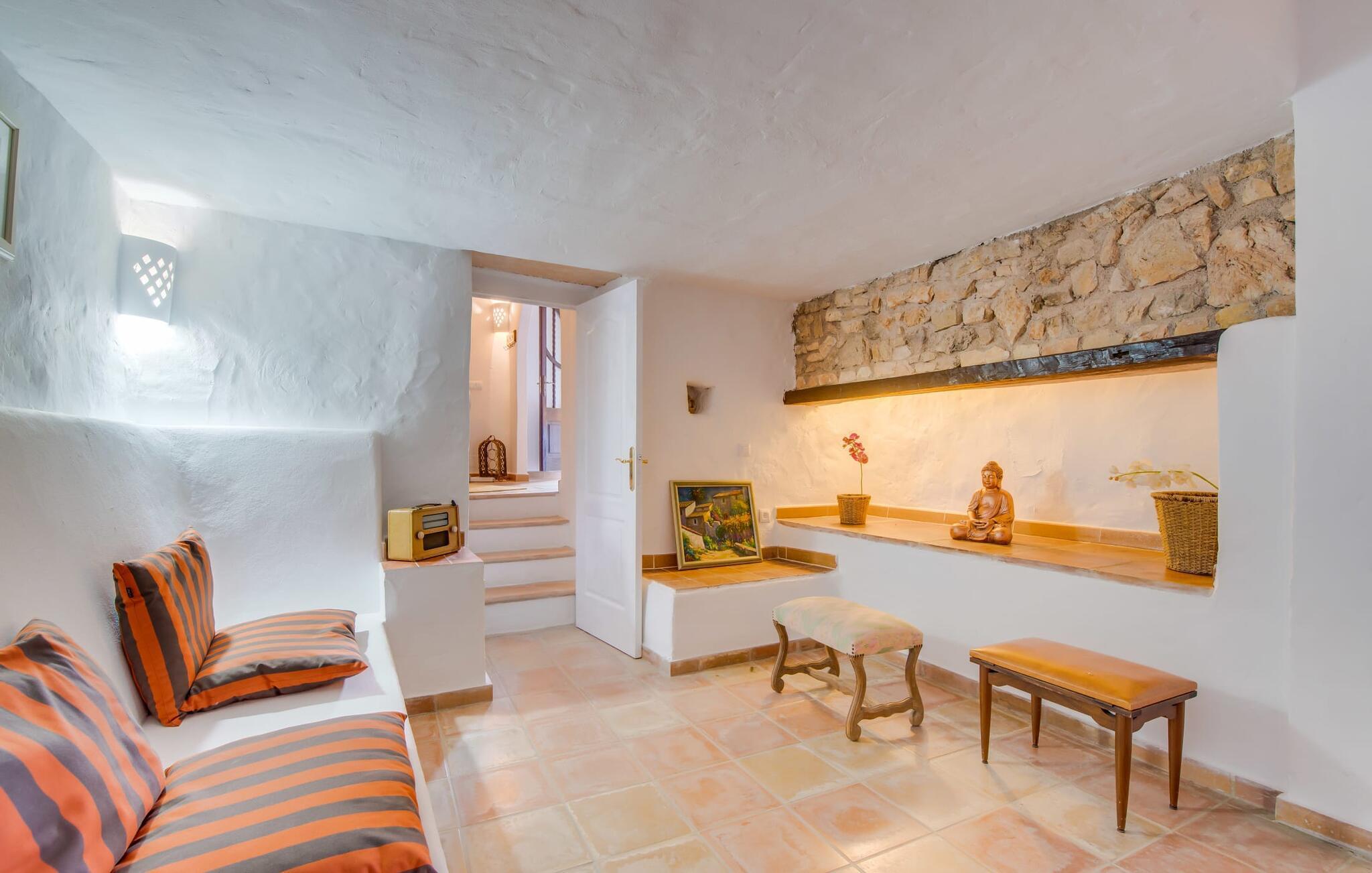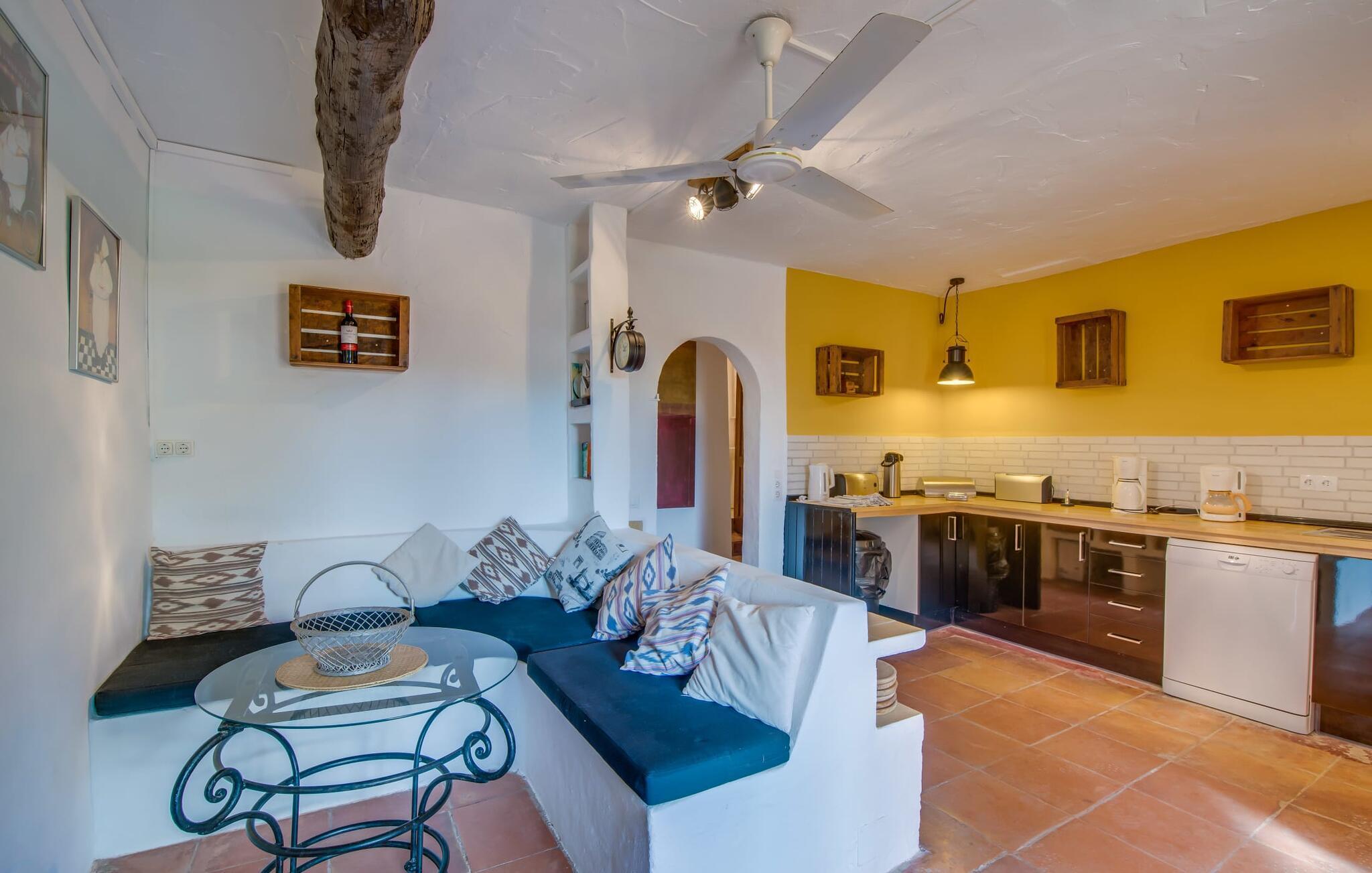 „Jordi d Cas Concos“ ist keine Finca „von der Stange“: Sie wurde sehr individuell und originell mit viel Liebe zum Detail eingerichtet und gestaltet. Helle Farben, teilweise knallbunte Wände und großformatige Bilder verbreiten ein sommerliches Flair, rustikale Elemente wie Holzbalken und grob verputzte Decken unterstreichen den ländlichen Charakter. Im Erdgeschoss gibt es neben dem Eingangsbereich und einem großen Wohnzimmer mit zwei Sofas viele weitere gemütliche Sitzecken, wie zum Beispiel verschiedene gemauerte Bänke mit gemütlichen Kissen. Im Speisesaal können Sie gemeinsam am Tisch schlemmen. Ihre Mahlzeiten können Sie in der schicken, sonnengelben Küche nebenan zubereiten. Auch hier finden Sie eine gemauerte Sitzbank um einen hübschen Glastisch herum, sodass Sie wunderbar gemeinsam frühstücken können. Insgesamt drei geräumige Doppelschlafzimmer, eines davon mit Bad en Suite, und zwei weitere moderne Badezimmer runden den Wohnkomfort im Erdgeschoss ab, während im Obergeschoss zwei weitere Schlafzimmer mit Bad en Suite auf Sie warten. In einem zweiten Gebäude befindet sich praktischerweise ein weiteres Doppelschlafzimmer mit Bad en Suite, das von außen zugänglich ist, so dass die hier lebende Gruppe völlig unabhängig ist. Zur Finca gehört außerdem ein Gästehaus mit zwei weiteren Schlafzimmern, das auf Anfrage vermietet werden kann.