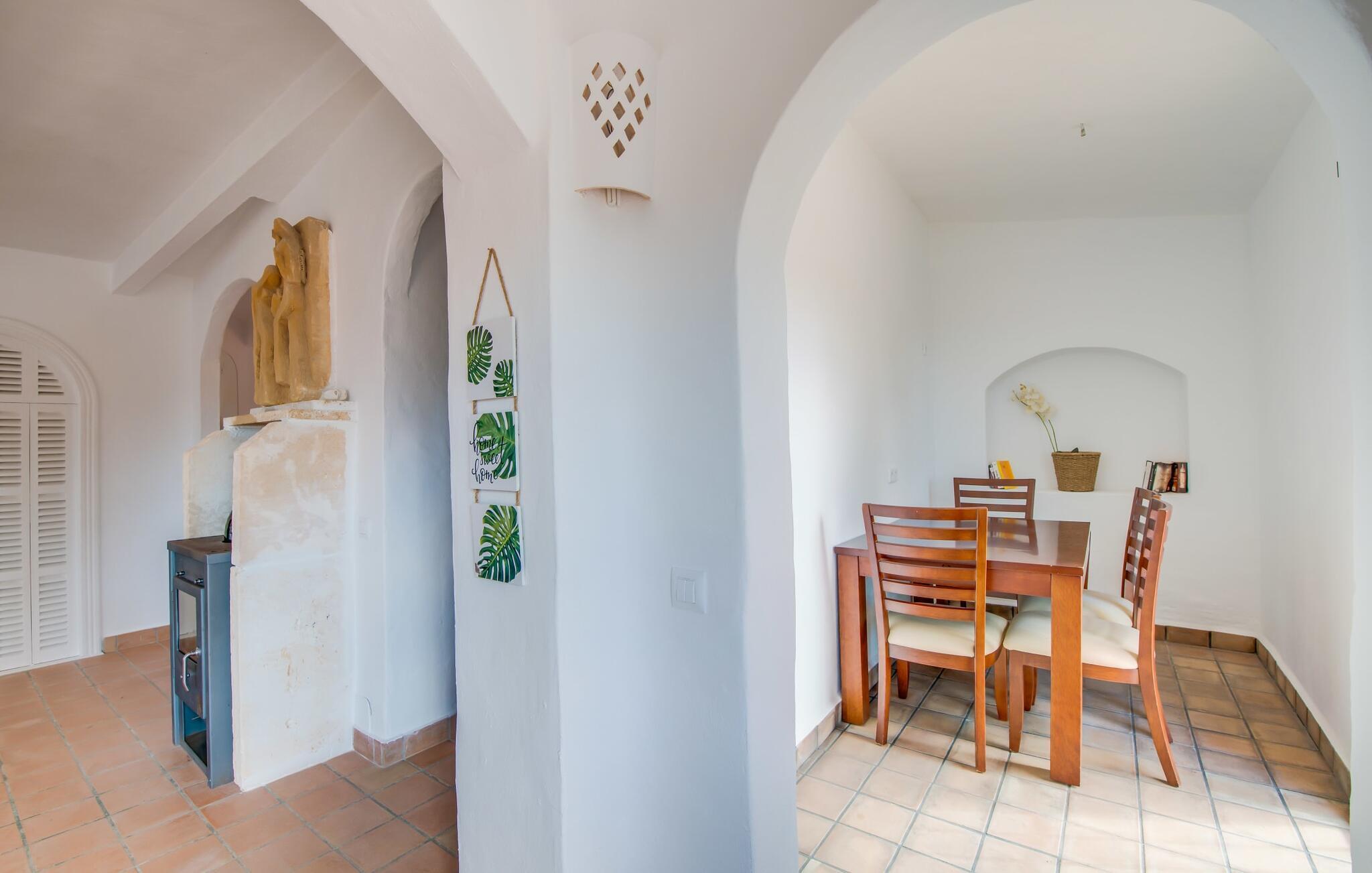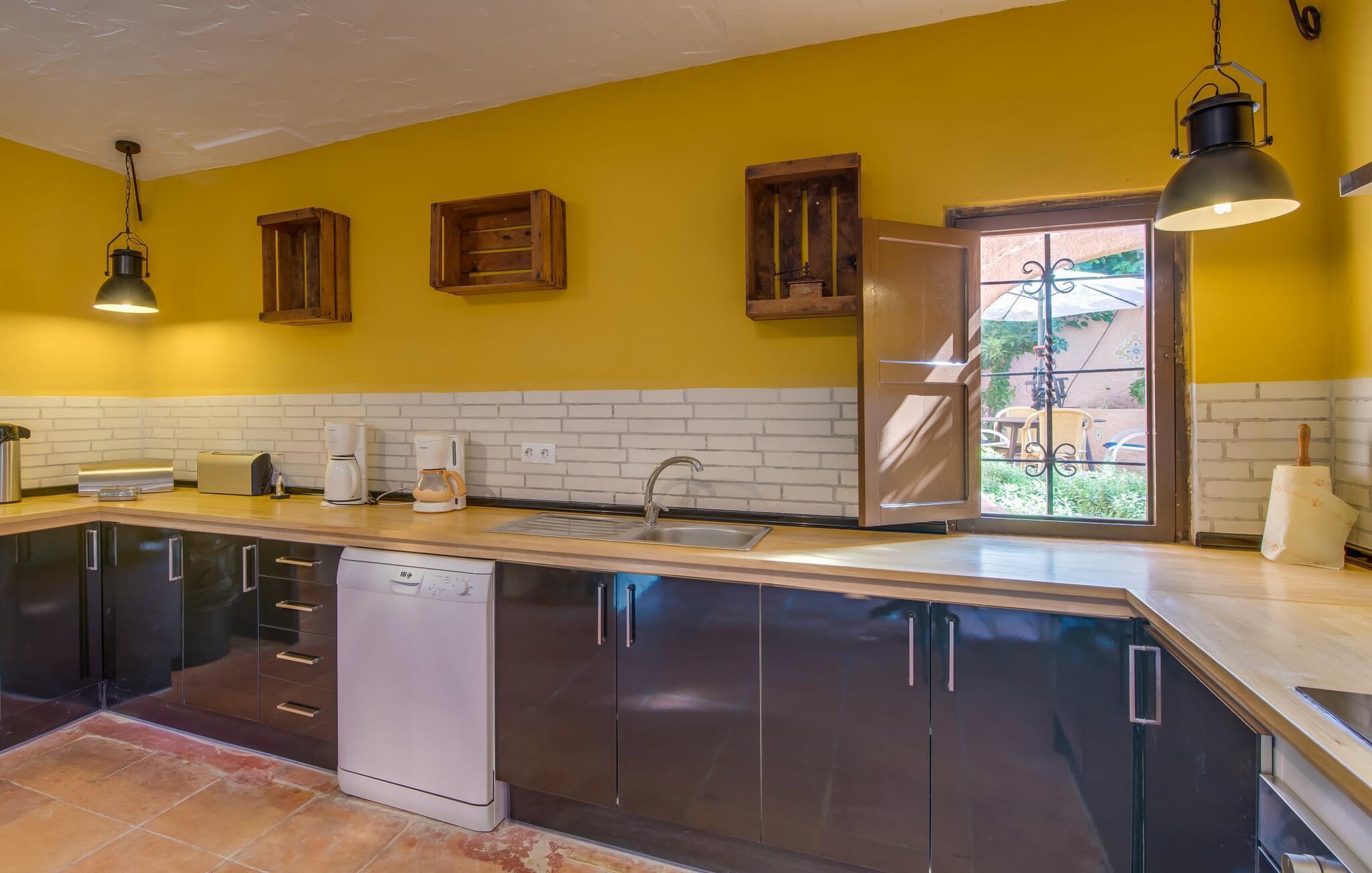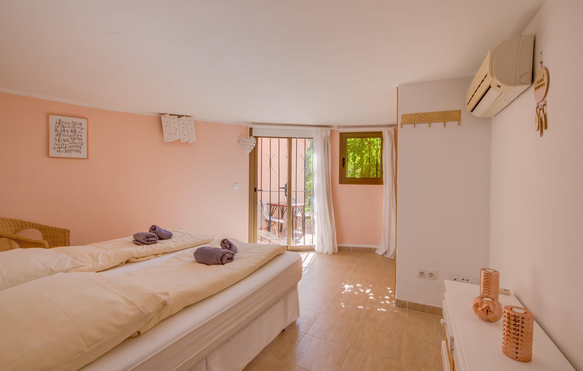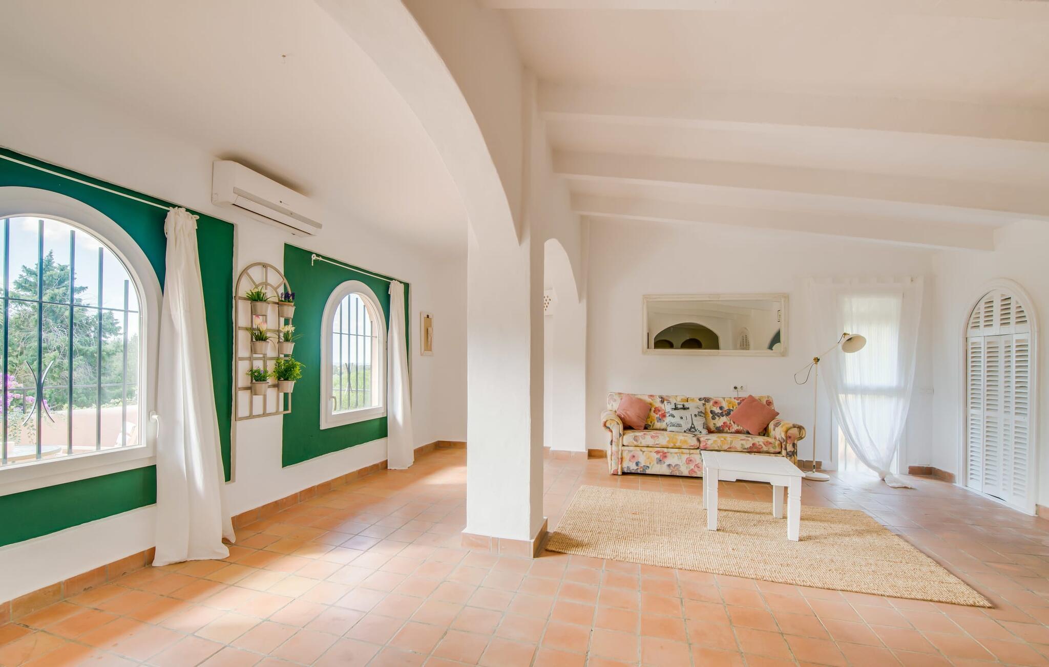 „Jordi d Cas Concos“ ist keine Finca „von der Stange“: Sie wurde sehr individuell und originell mit viel Liebe zum Detail eingerichtet und gestaltet. Helle Farben, teilweise knallbunte Wände und großformatige Bilder verbreiten ein sommerliches Flair, rustikale Elemente wie Holzbalken und grob verputzte Decken unterstreichen den ländlichen Charakter. Im Erdgeschoss gibt es neben dem Eingangsbereich und einem großen Wohnzimmer mit zwei Sofas viele weitere gemütliche Sitzecken, wie zum Beispiel verschiedene gemauerte Bänke mit gemütlichen Kissen. Im Speisesaal können Sie gemeinsam am Tisch schlemmen. Ihre Mahlzeiten können Sie in der schicken, sonnengelben Küche nebenan zubereiten. Auch hier finden Sie eine gemauerte Sitzbank um einen hübschen Glastisch herum, sodass Sie wunderbar gemeinsam frühstücken können. Insgesamt drei geräumige Doppelschlafzimmer, eines davon mit Bad en Suite, und zwei weitere moderne Badezimmer runden den Wohnkomfort im Erdgeschoss ab, während im Obergeschoss zwei weitere Schlafzimmer mit Bad en Suite auf Sie warten. In einem zweiten Gebäude befindet sich praktischerweise ein weiteres Doppelschlafzimmer mit Bad en Suite, das von außen zugänglich ist, so dass die hier lebende Gruppe völlig unabhängig ist. Zur Finca gehört außerdem ein Gästehaus mit zwei weiteren Schlafzimmern, das auf Anfrage vermietet werden kann.
