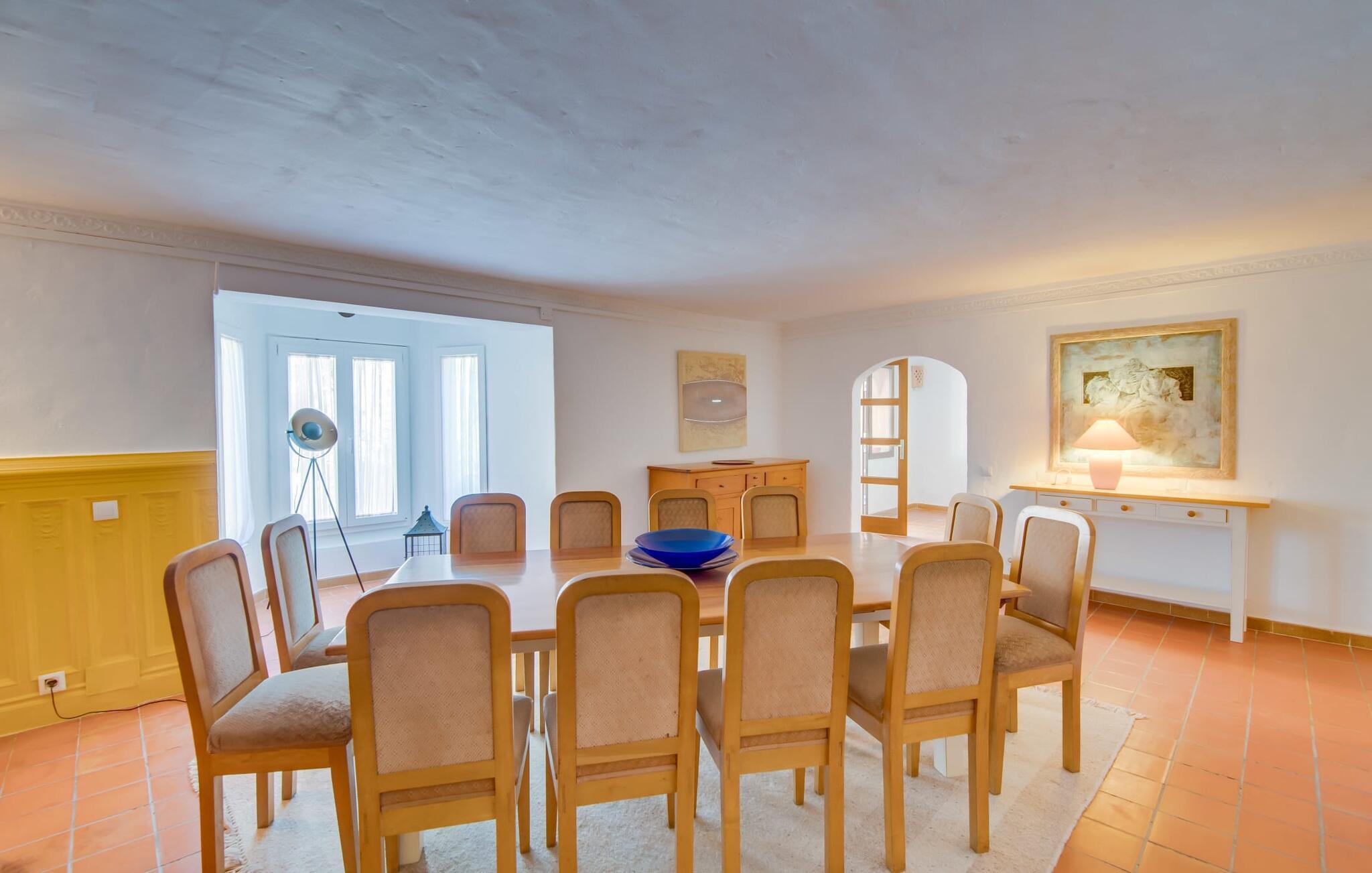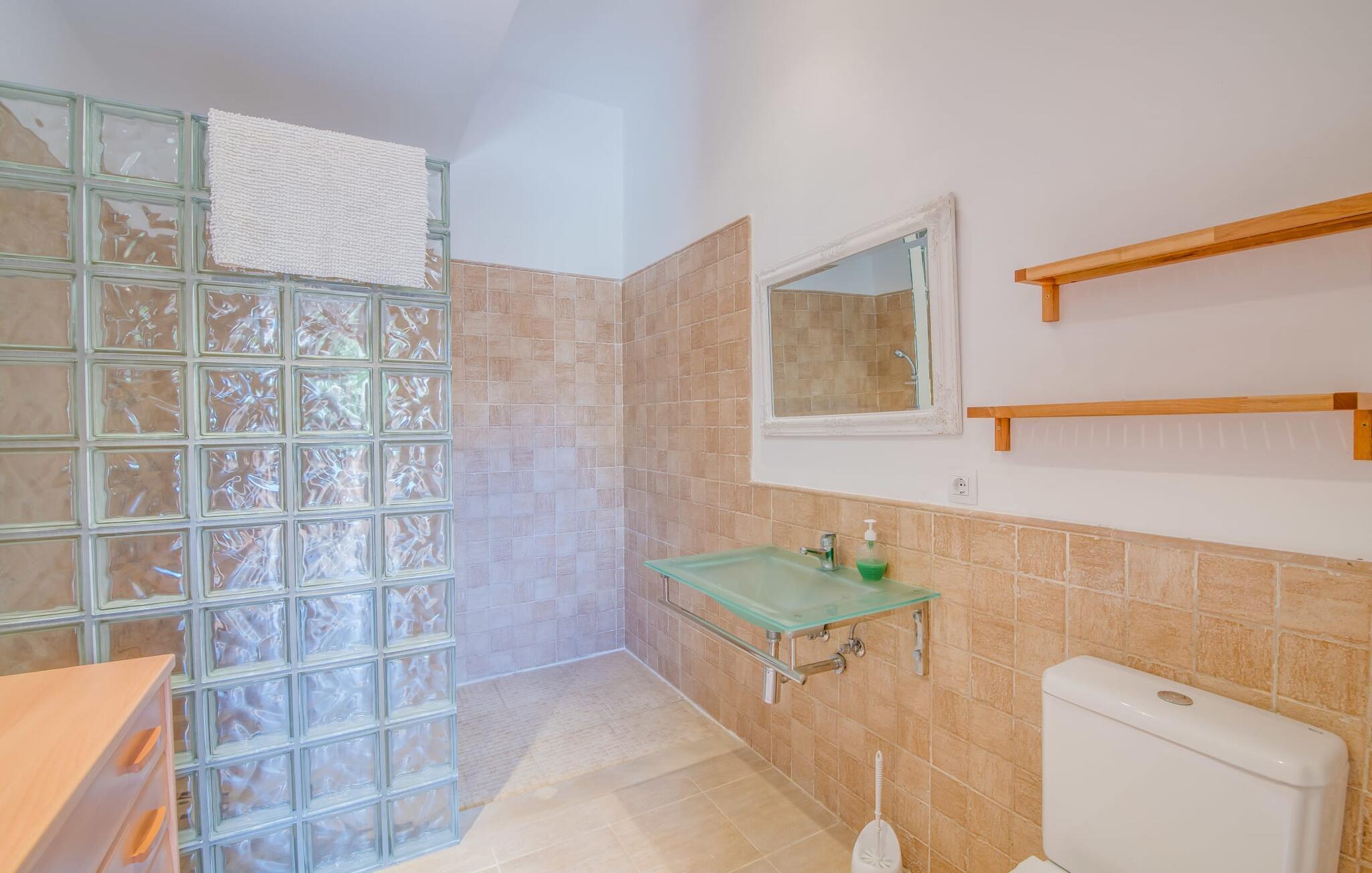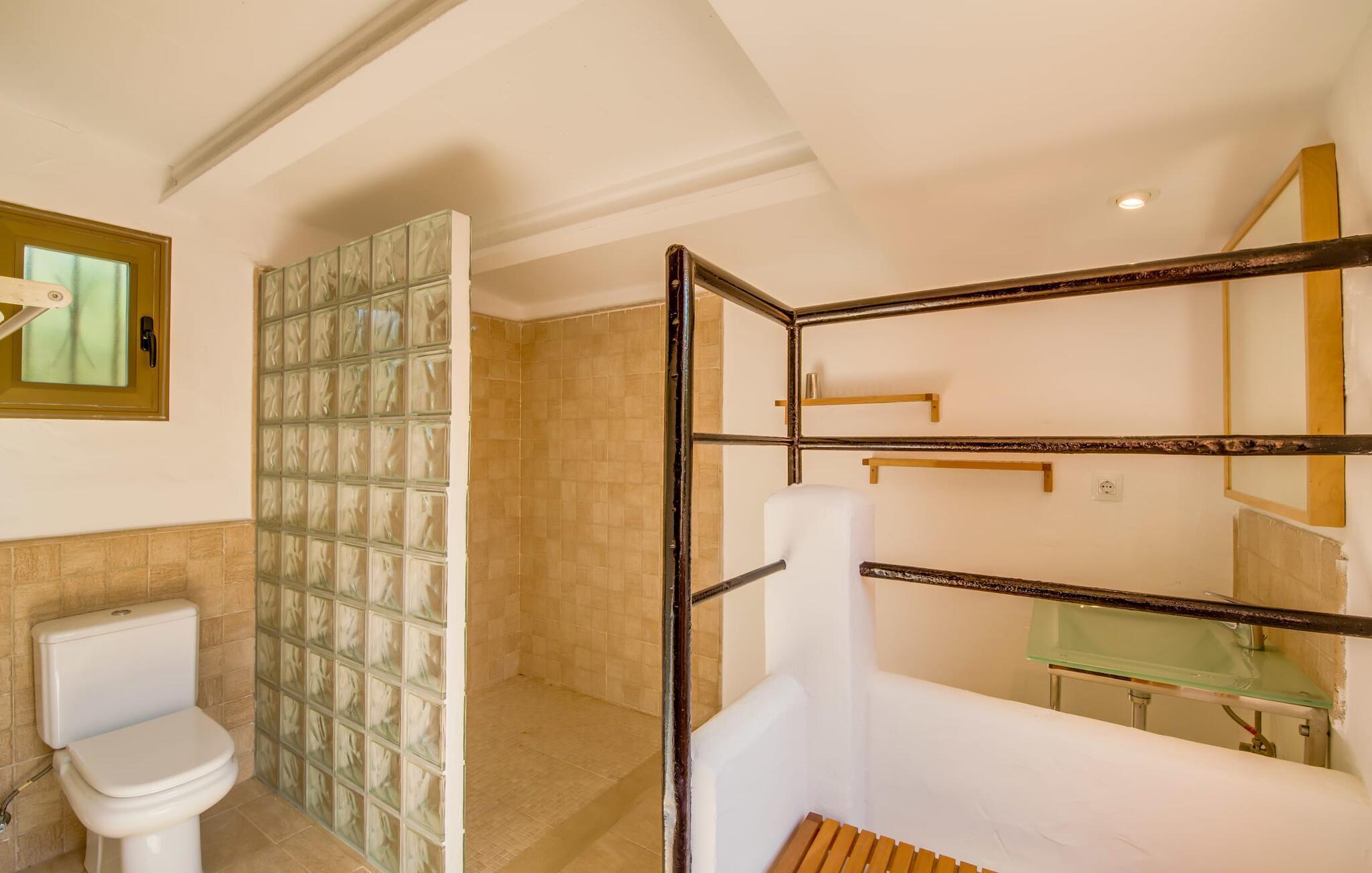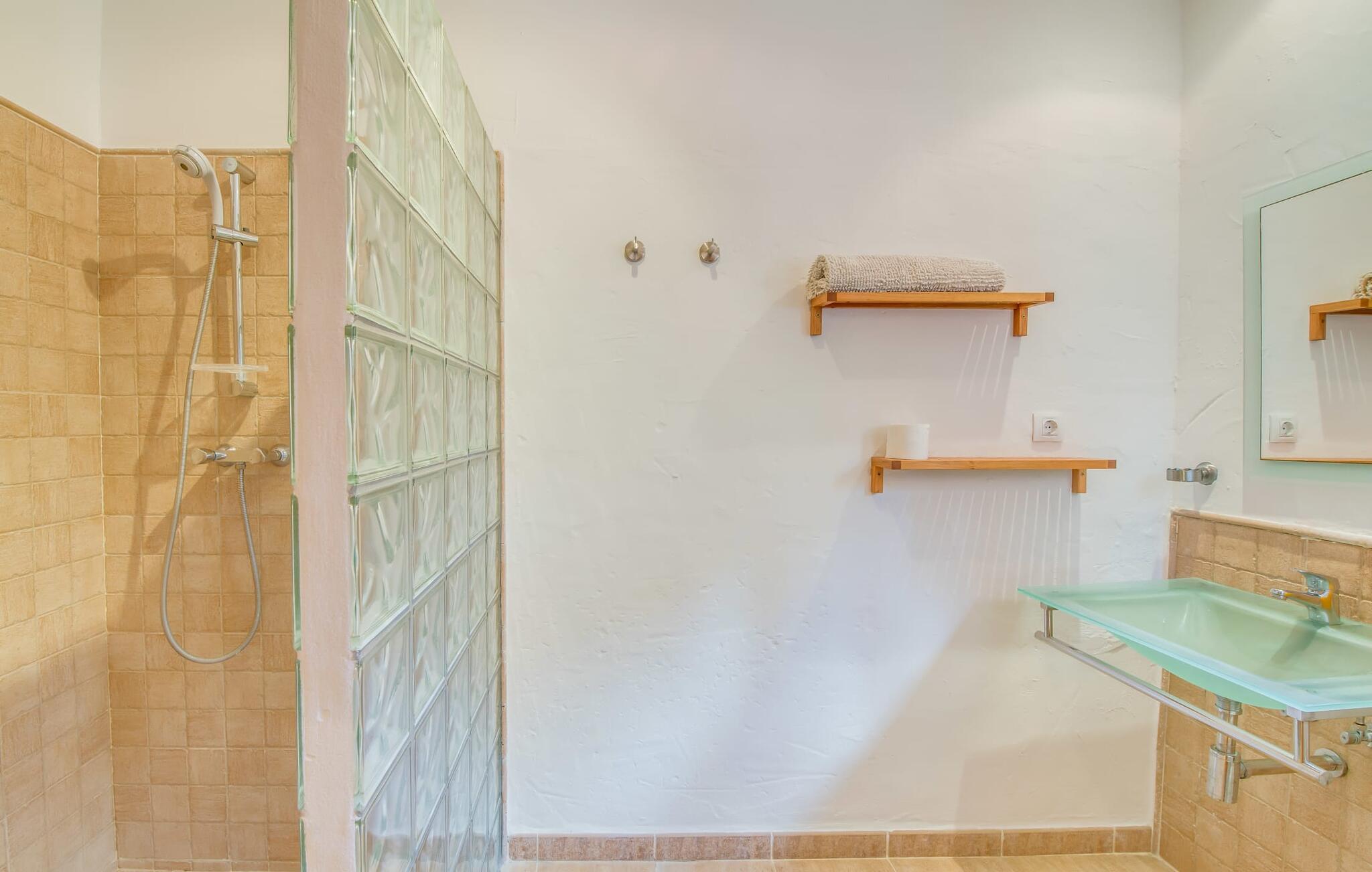 „Jordi d Cas Concos“ ist keine Finca „von der Stange“: Sie wurde sehr individuell und originell mit viel Liebe zum Detail eingerichtet und gestaltet. Helle Farben, teilweise knallbunte Wände und großformatige Bilder verbreiten ein sommerliches Flair, rustikale Elemente wie Holzbalken und grob verputzte Decken unterstreichen den ländlichen Charakter. Im Erdgeschoss gibt es neben dem Eingangsbereich und einem großen Wohnzimmer mit zwei Sofas viele weitere gemütliche Sitzecken, wie zum Beispiel verschiedene gemauerte Bänke mit gemütlichen Kissen. Im Speisesaal können Sie gemeinsam am Tisch schlemmen. Ihre Mahlzeiten können Sie in der schicken, sonnengelben Küche nebenan zubereiten. Auch hier finden Sie eine gemauerte Sitzbank um einen hübschen Glastisch herum, sodass Sie wunderbar gemeinsam frühstücken können. Insgesamt drei geräumige Doppelschlafzimmer, eines davon mit Bad en Suite, und zwei weitere moderne Badezimmer runden den Wohnkomfort im Erdgeschoss ab, während im Obergeschoss zwei weitere Schlafzimmer mit Bad en Suite auf Sie warten. In einem zweiten Gebäude befindet sich praktischerweise ein weiteres Doppelschlafzimmer mit Bad en Suite, das von außen zugänglich ist, so dass die hier lebende Gruppe völlig unabhängig ist. Zur Finca gehört außerdem ein Gästehaus mit zwei weiteren Schlafzimmern, das auf Anfrage vermietet werden kann.