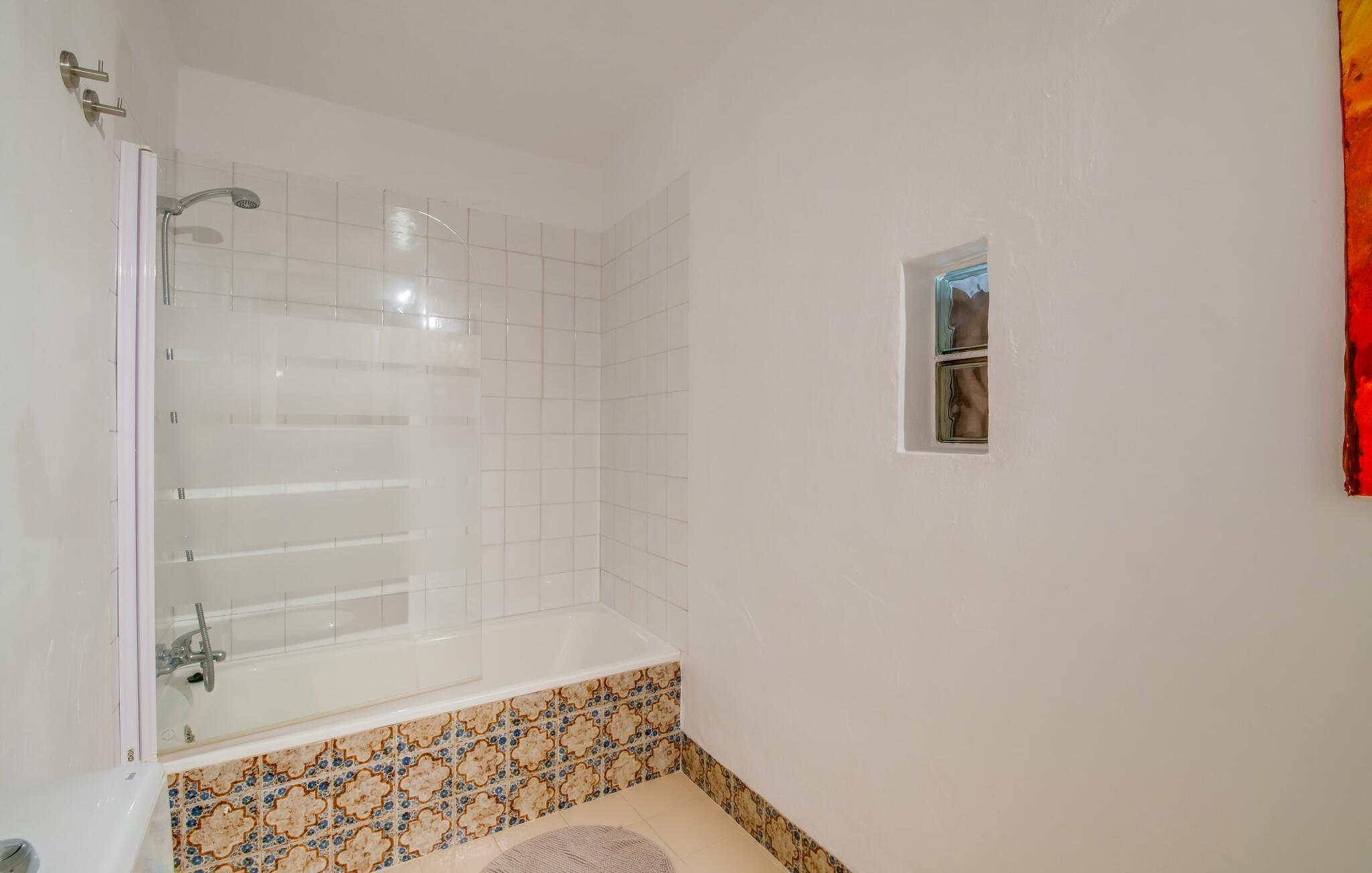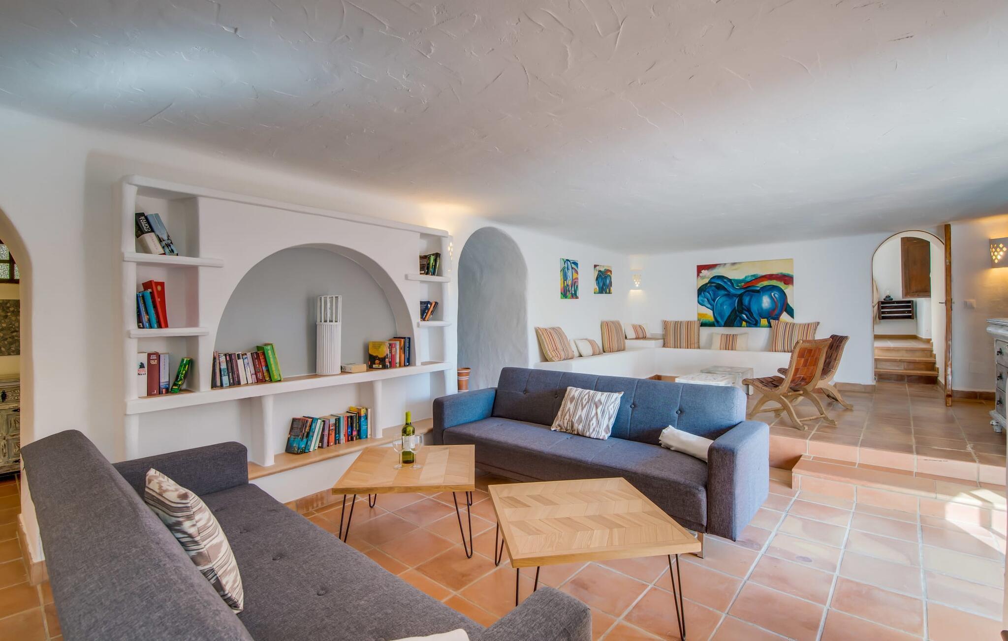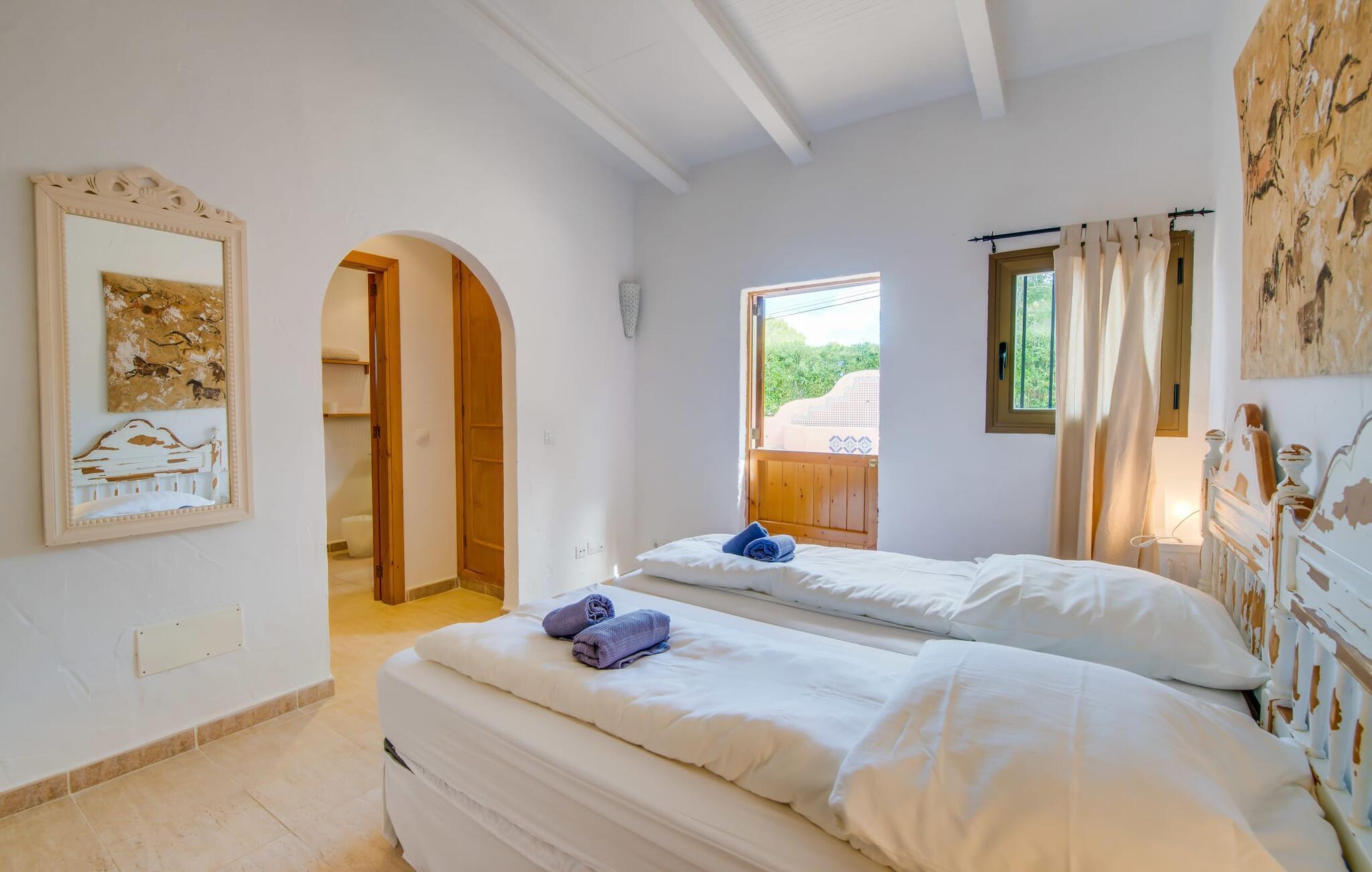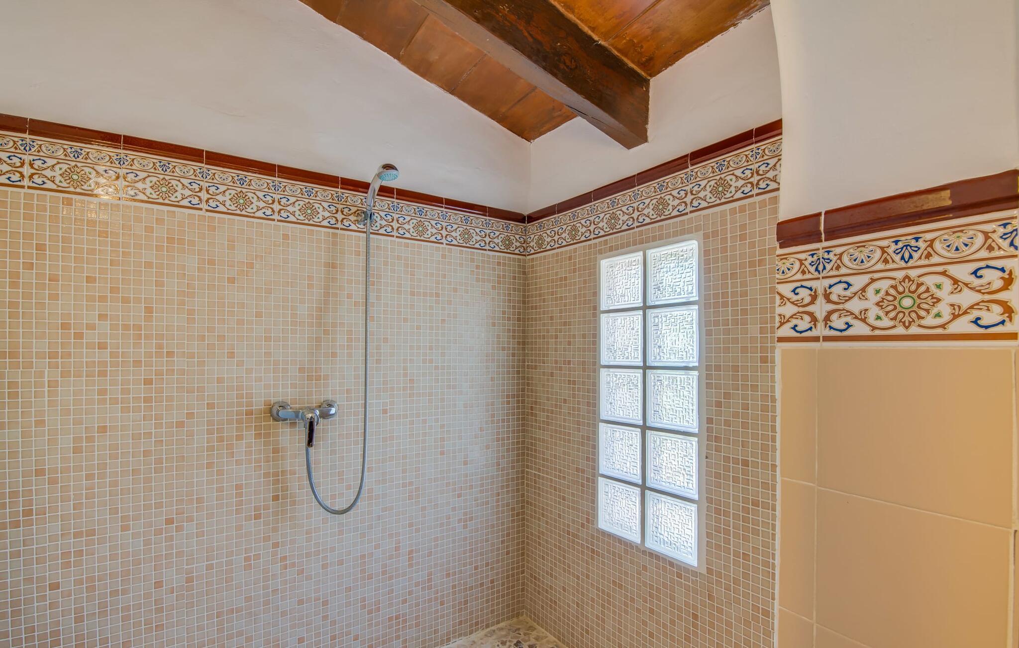 „Jordi d Cas Concos“ ist keine Finca „von der Stange“: Sie wurde sehr individuell und originell mit viel Liebe zum Detail eingerichtet und gestaltet. Helle Farben, teilweise knallbunte Wände und großformatige Bilder verbreiten ein sommerliches Flair, rustikale Elemente wie Holzbalken und grob verputzte Decken unterstreichen den ländlichen Charakter. Im Erdgeschoss gibt es neben dem Eingangsbereich und einem großen Wohnzimmer mit zwei Sofas viele weitere gemütliche Sitzecken, wie zum Beispiel verschiedene gemauerte Bänke mit gemütlichen Kissen. Im Speisesaal können Sie gemeinsam am Tisch schlemmen. Ihre Mahlzeiten können Sie in der schicken, sonnengelben Küche nebenan zubereiten. Auch hier finden Sie eine gemauerte Sitzbank um einen hübschen Glastisch herum, sodass Sie wunderbar gemeinsam frühstücken können. Insgesamt drei geräumige Doppelschlafzimmer, eines davon mit Bad en Suite, und zwei weitere moderne Badezimmer runden den Wohnkomfort im Erdgeschoss ab, während im Obergeschoss zwei weitere Schlafzimmer mit Bad en Suite auf Sie warten. In einem zweiten Gebäude befindet sich praktischerweise ein weiteres Doppelschlafzimmer mit Bad en Suite, das von außen zugänglich ist, so dass die hier lebende Gruppe völlig unabhängig ist. Zur Finca gehört außerdem ein Gästehaus mit zwei weiteren Schlafzimmern, das auf Anfrage vermietet werden kann.