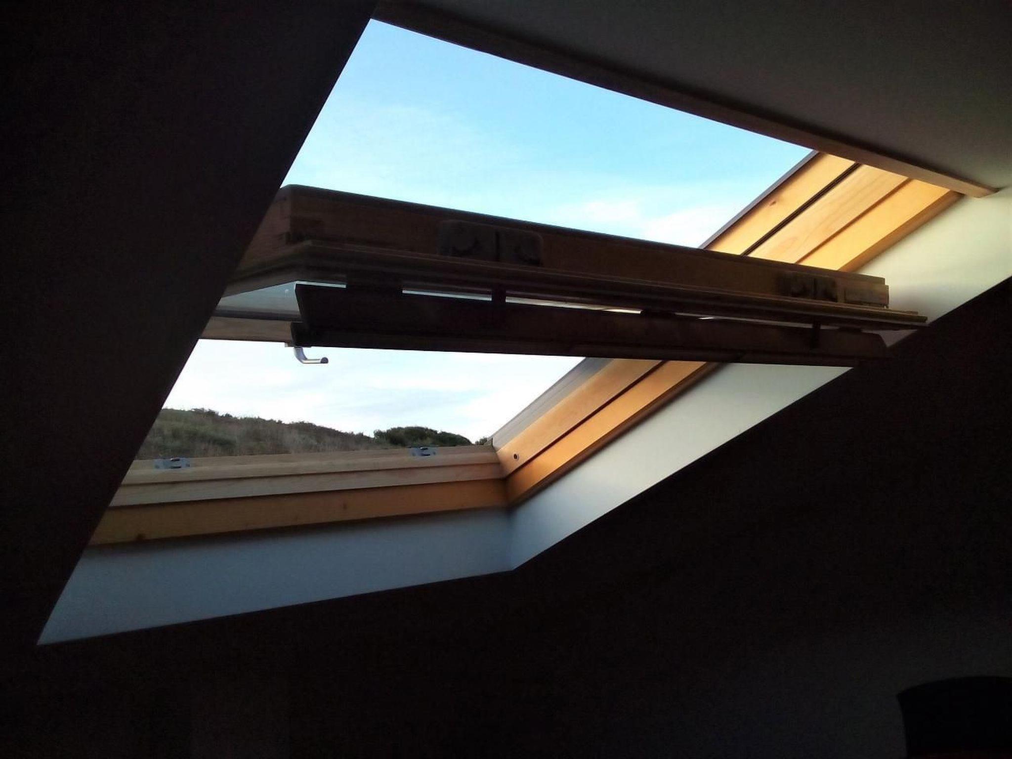 Ferienwohnung mit einem grossen Schlafzimmern (1 Doppelbett) und einem kleinen Schlafzimmer (zwei Einzelbette) mit Bürotisch und Regal unter der Dachschräge mit Dachfenstern. Je ein Kleiderschrank in beiden Schlafzimmern.