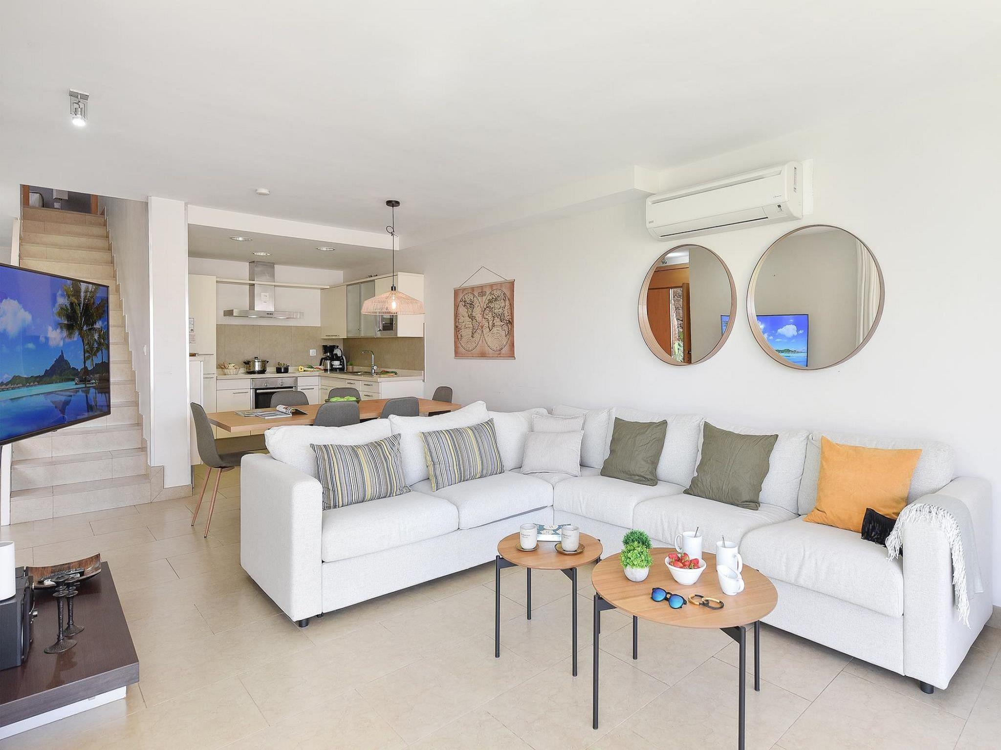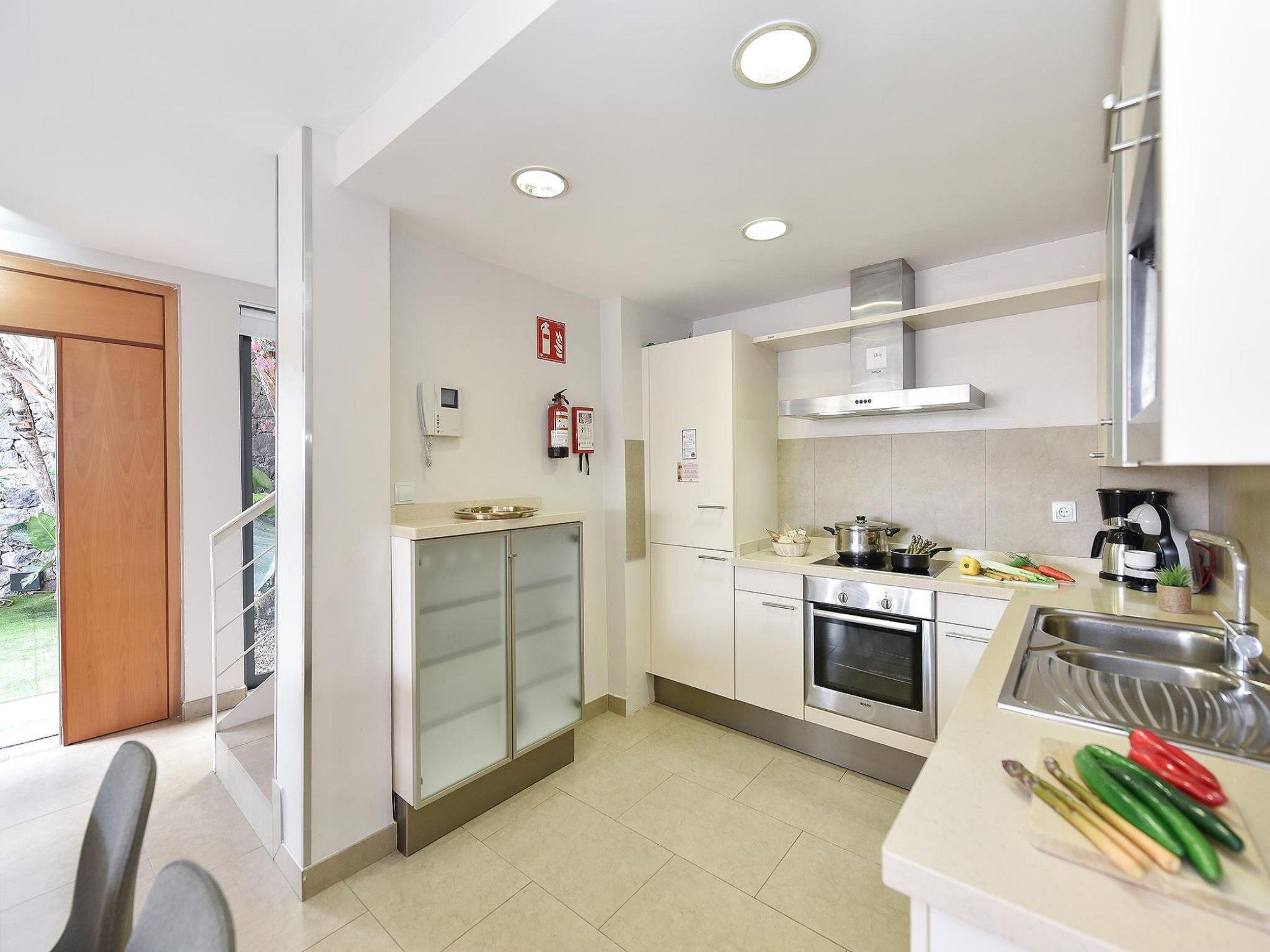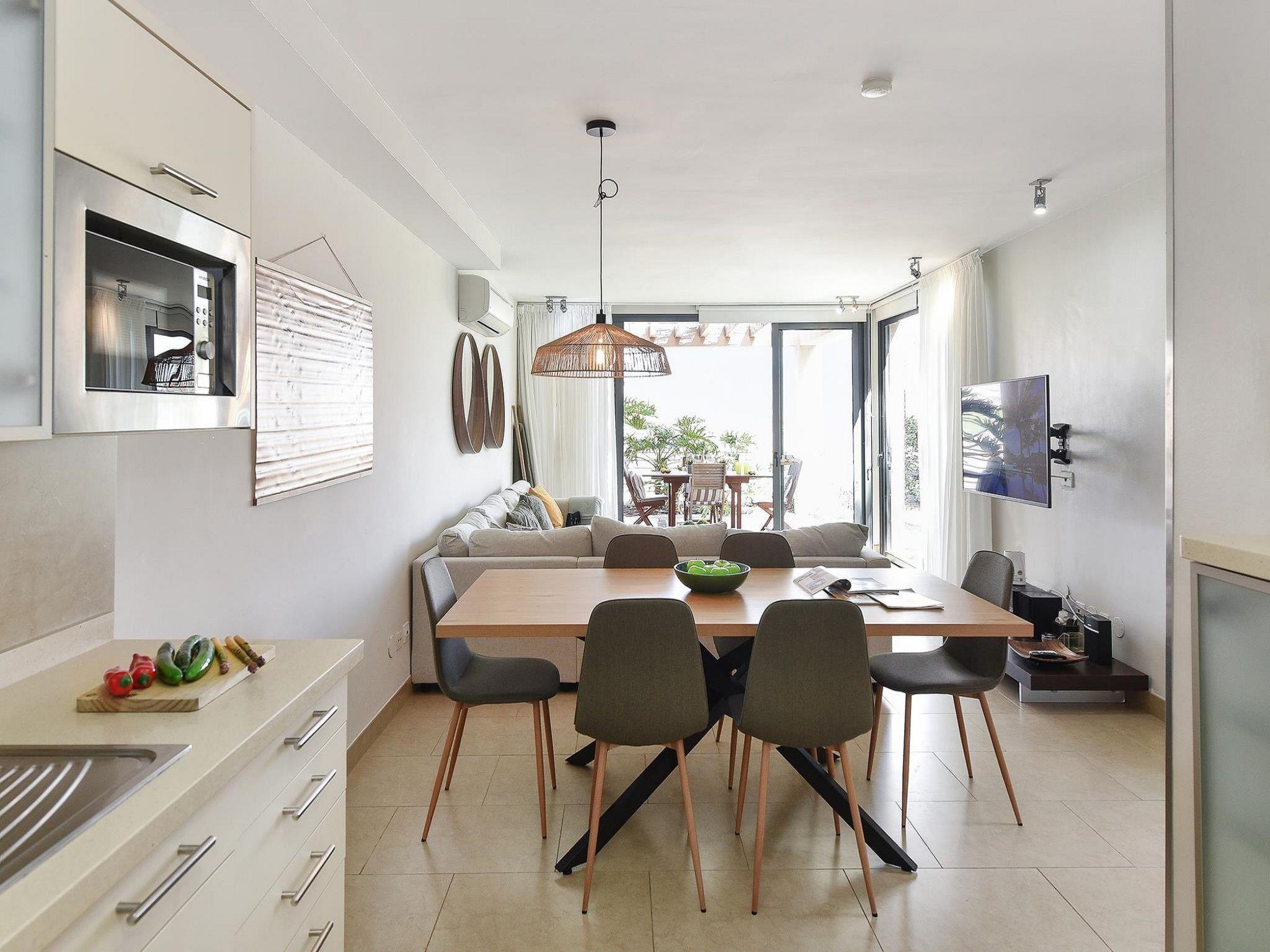 "Las Terrazas 13", 3-Zimmer-Villa 105 m2 auf 2 Stockwerken, im Erdgeschoss. Hell, sehr komfortabel eingerichtet: Salon mit Sat-TV, Digital-TV, DVD und Klimaanlage. Ausgang zum Gartensitzplatz, zum Schwimmbad mit 2 Betten, Dusche/WC und Klimaanlage. Ausgang zum Gartensitzplatz mit 2 Betten, Dusche/WC und Klimaanlage. Ausgang zur Terrasse. Offene Küche (Backofen, 4 Glaskeramikplatten, Toaster, Wasserkocher, Mikrowelle, Tiefkühler, elektrische Kaffeemaschine) mit Esstisch. Gartensitzplatz. Terrassenmöbel, Liegestühle (4). Zur Verfügung: Waschmaschine, Kinderhochstuhl, Babybett bis 2 Jahre (extra), Haartrockner. Internet (WLAN). Parkplatz. Bitte beachten: geeignet für Familien. Nichtraucher-Haus. Maximal 1 Haustier/Hund erlaubt. 2020-T3247 // Reg. Nr.: ESFCTU0000350120003181970000000000000VV-35-1-00145417