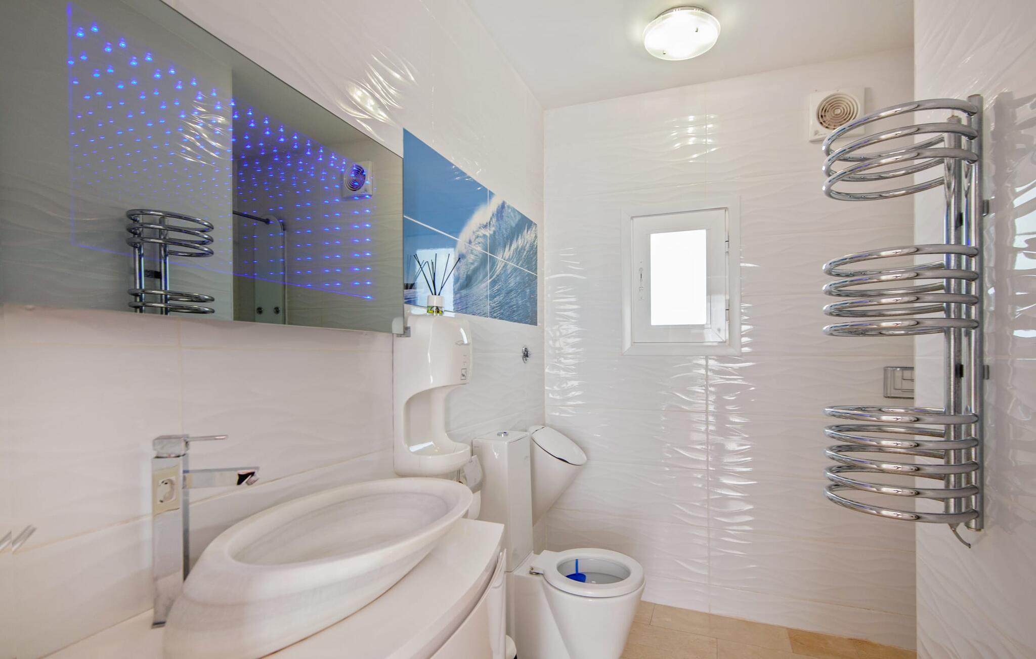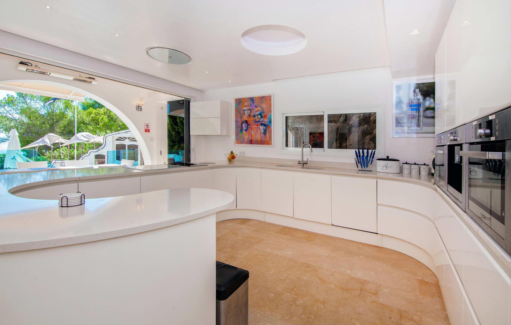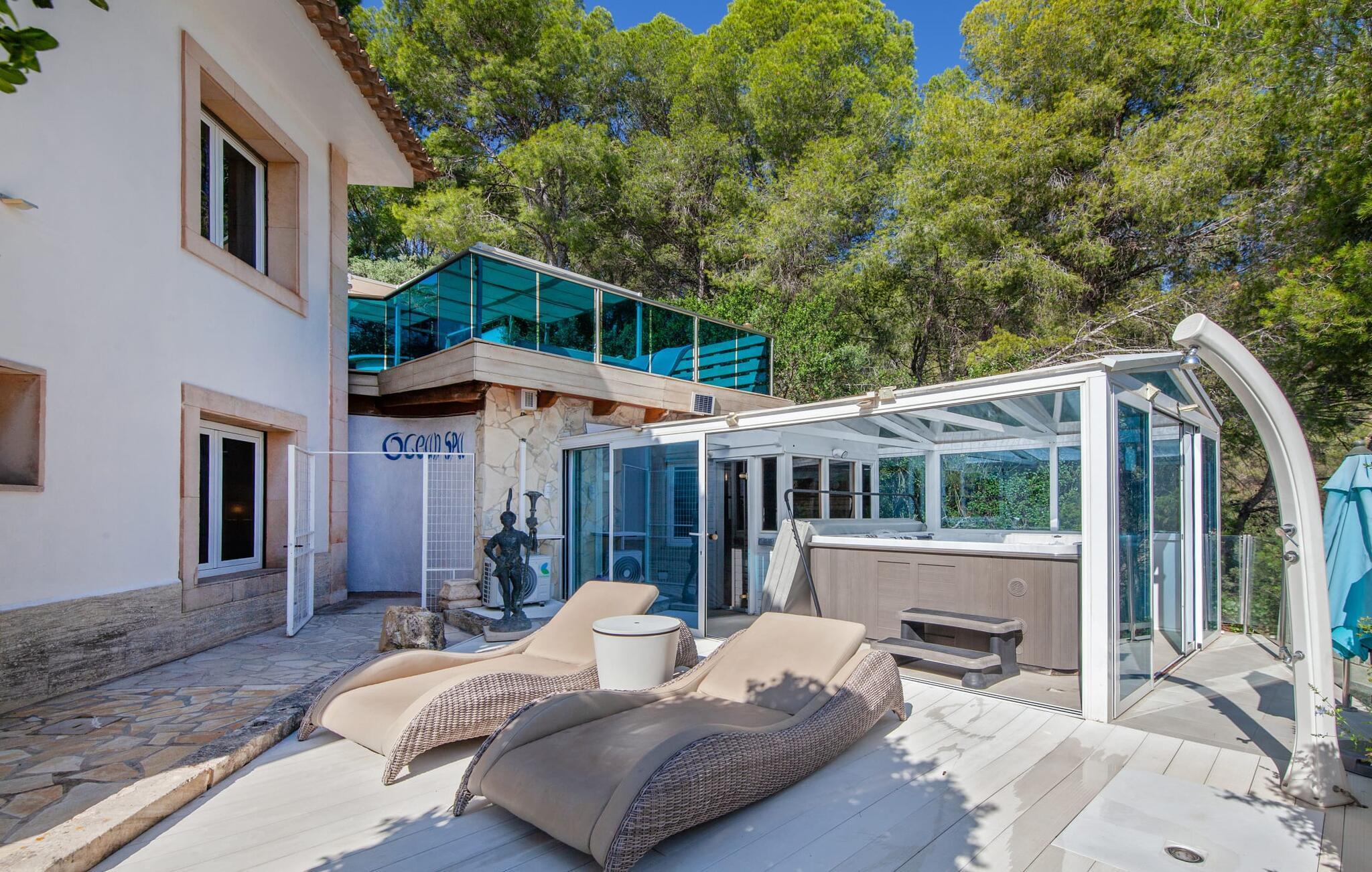 Das Luxus-Urlaubsgefühl setzt sich auch in den Innenräumen der edlen Villa fort. Es erwartet Sie ein überdachter Whirlpool. Wer im Urlaub gerne Sport treibt, kann im hauseigenen Fitnesscenter trainieren. Anschließend finden Sie Wärme und Entspannung in der privaten Sauna. Die traumhafte Villa „Ocean View“ ist somit bestens für die ganzjährige Nutzung geeignet. Neben den Sporträumen überzeugt auch das exklusive Design der überwiegend weißen Möbel. Die weiße Hochglanzküche wird jeden Hobbykoch begeistern. Die fünf Schlafzimmer unterscheiden sich zwischen der Nutzung durch Kinder oder Erwachsene, was die Familienfreundlichkeit dieses fantastischen Ferienhauses unterstreicht. Drei Badezimmer stehen in tollem Design zur Verfügung. Klimaanlage, Downlights, Soundsystem, WLAN mit Home-Office-Fähigkeit und diverse Smart-TVs katapultieren diese erstklassige Familienvilla in das Premium-Segment. Diese elegante und familienfreundliche Ferienvilla bietet sowohl innen als auch außen puren Luxus. Das hochwertige Anwesen liegt in den Hügeln des Dorfes Portal Nous zwischen Palma und Calvià im Südwesten der Insel. Einkaufsmöglichkeiten erreichen Sie in den umliegenden Orten wie Palmanova, Palma oder Calvià. Die Villa liegt 700 m von Cala Bendinat und anderen Sandstränden entfernt.