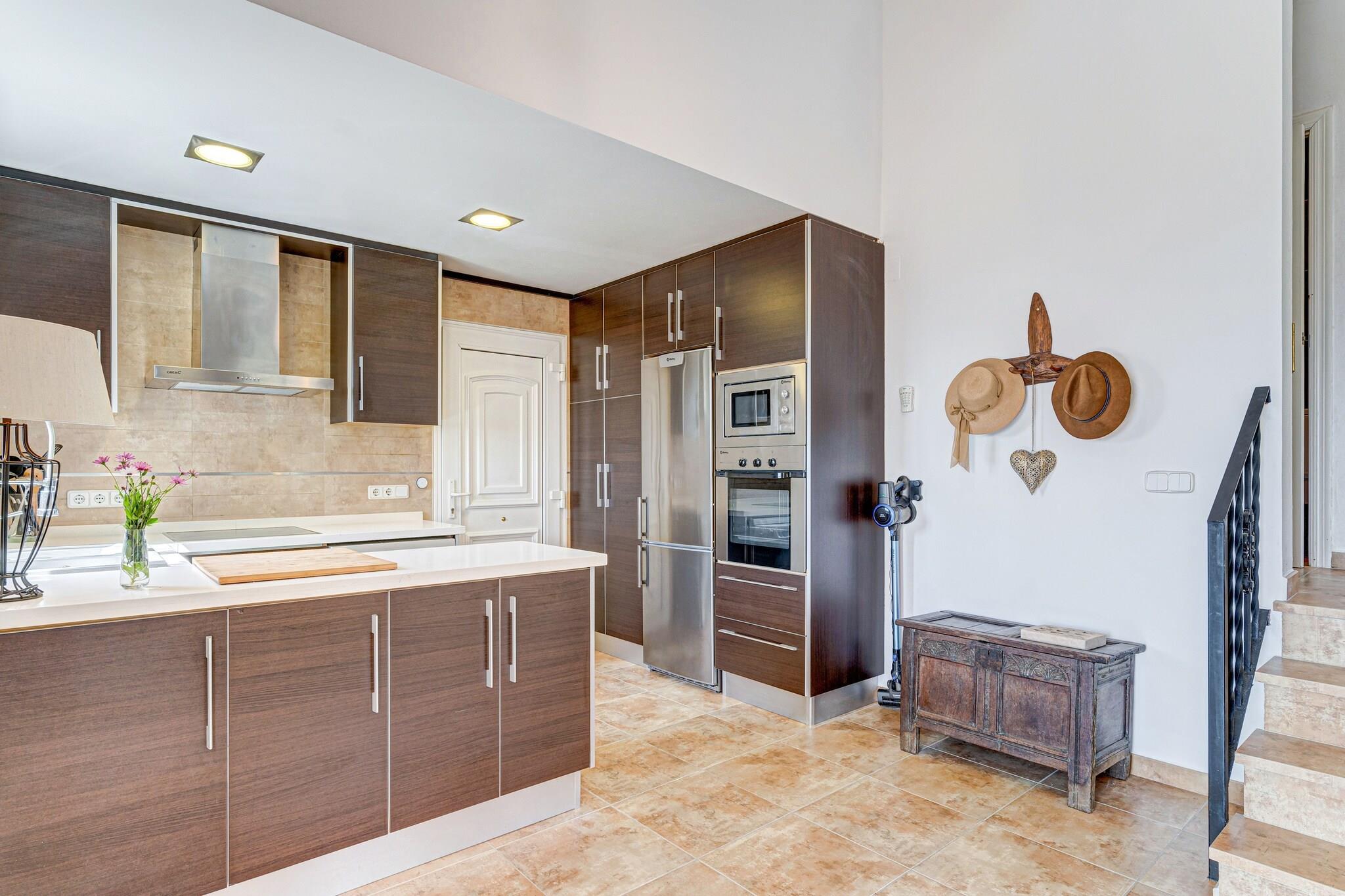 Parterre: (Wohnzimmer(TV(smart TV), Esstisch, Sitzecke, Heizung), Küche(Kochplatte, Wasserkocher, Dunstabzugshaube, Kaffeemaschine, Backofen, Kombi-Mikrowelle, Mikrowelle, Spülmaschine, Kühl-/Gefrierkombination), Schlafzimmer(Doppelbett), Schlafzimmer(Doppelbett oder 2 Einzelbetten), Badezimmer(Badewanne mit Dusche, Waschbecken), Toilette(Waschbecken, Toilette), Veranda(Sitzecke)) Gästeunterkunft Parterre: (Wohnzimmer(TV, Sitzecke), Küche(Kochplatte, Dunstabzugshaube, Kaffeemaschine, Backofen, Kühlschrank), Schlafzimmer(Einzelbett, Einzelbett), Badezimmer(Dusche, Waschbecken, Toilette)) Außenküche, Dusche, Waschmaschine, Heizung, Klimaanlage, Innenhof(alleinige Nutzung, umzäunt), Terrasse(überdacht), Garten, Gartenmöbel, Liegen, Grill(Gas), Liegestühle, Sonnenschirm, Pool(alleinige Nutzung, 7 x 4 m.)