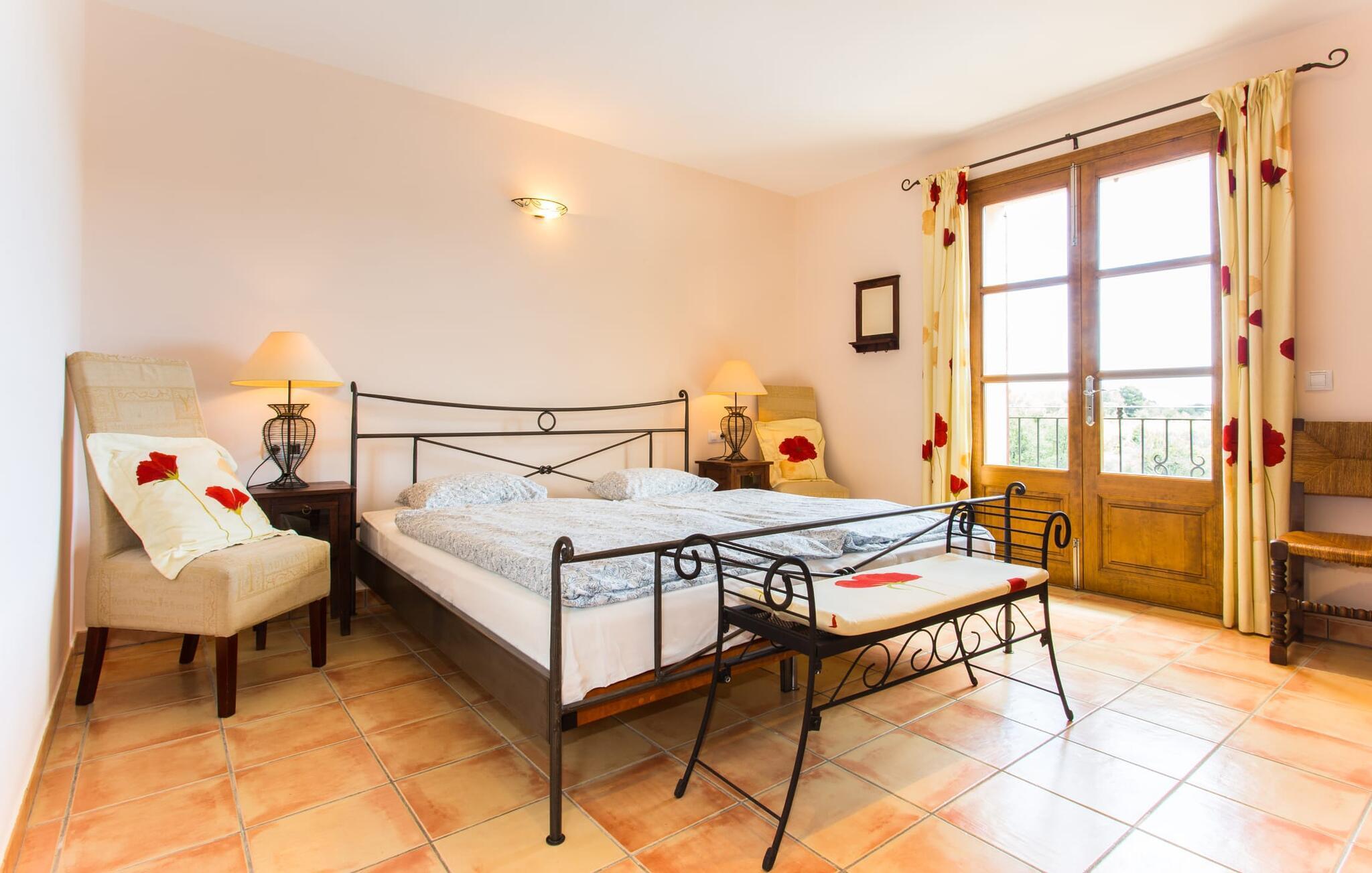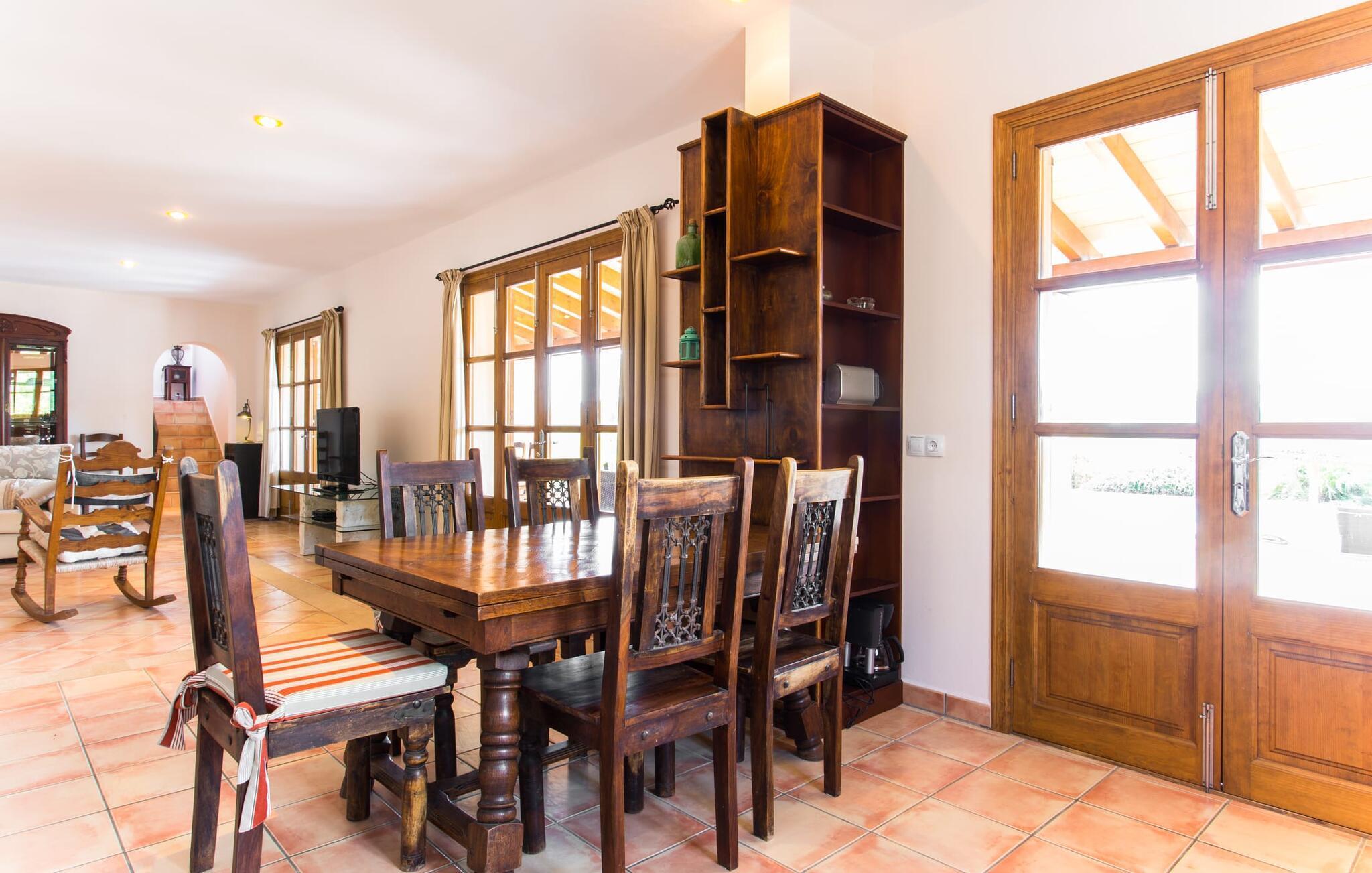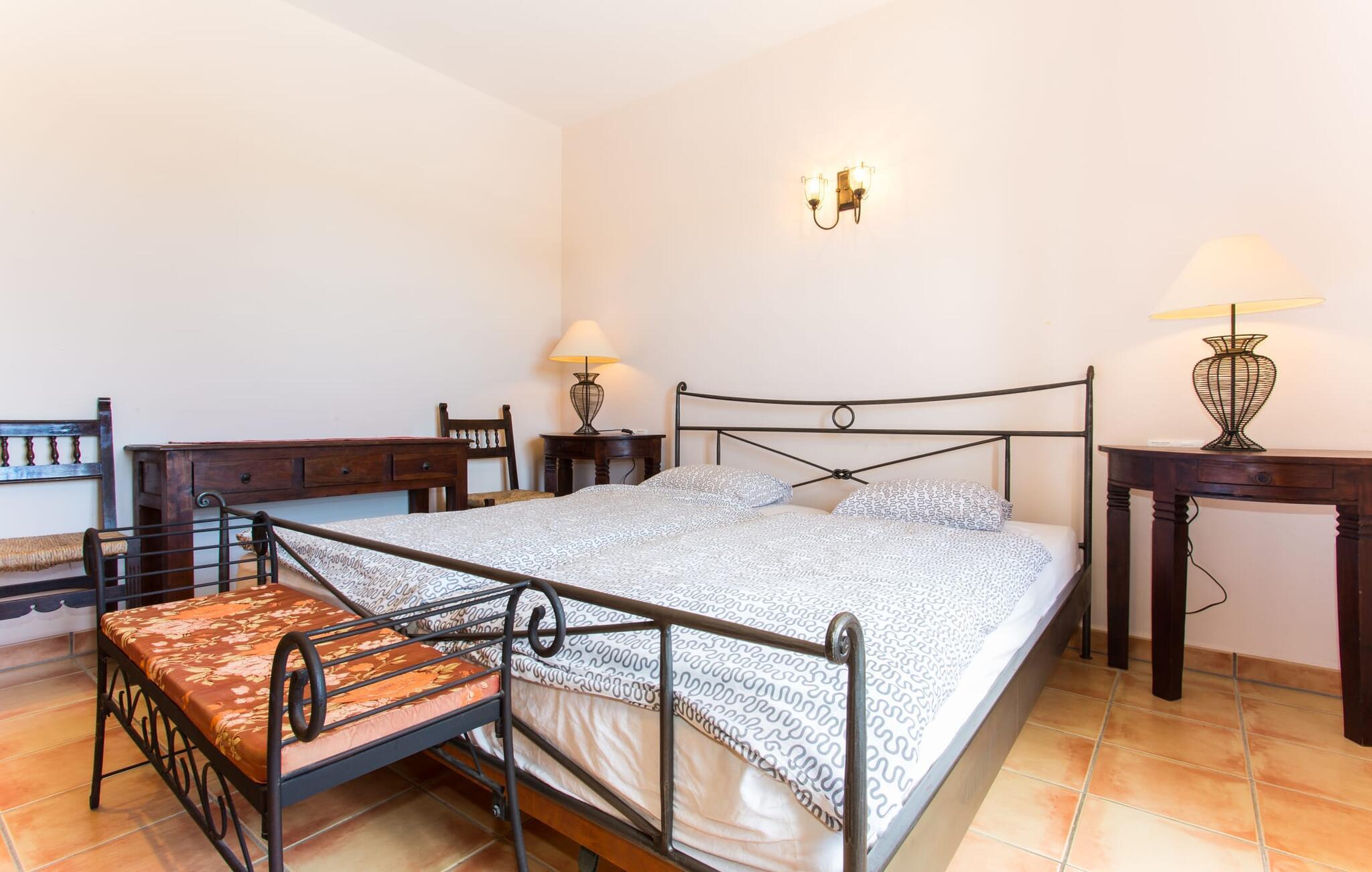 Der Boden des Hauses ist komplett gefliest; Das gesamte Anwesen fängt die Sonne sehr gut ein und wirkt dadurch sehr hell und einladend. Im Erdgeschoss des Gebäudes finden Sie das offene Wohnzimmer, das komfortabel mit einer Mischung aus modernen und traditionellen Möbeln ausgestattet wurde. Auf der kuscheligen Sofalandschaft, am Kamin oder vor dem Fernseher werden Sie garantiert eine schöne Zeit verbringen! Daran schließt sich die offene Küche mit Essbereich an, deren Ausstattung keine Wünsche offen lässt. Auf dieser Etage befinden sich zwei weitere Schlafzimmer sowie zwei Badezimmer – eines davon enthält auch die Waschmaschine. Im Obergeschoss befinden sich zwei weitere Doppelzimmer, ein Badezimmer und als besonderes Highlight eine kleine Terrasse, auf der Sie viele schöne Stunden in der Sonne genießen können. Alle Schlafzimmer sind funktional eingerichtet und bieten Ihnen dank Einbauschränken viel Stauraum. Die Bäder sind mit Badewannen und Duschen ausgestattet. Die rustikalen Spiegel, schönen Accessoires und hellen Lichter werden alle Ihre Erwartungen mehr als erfüllen.