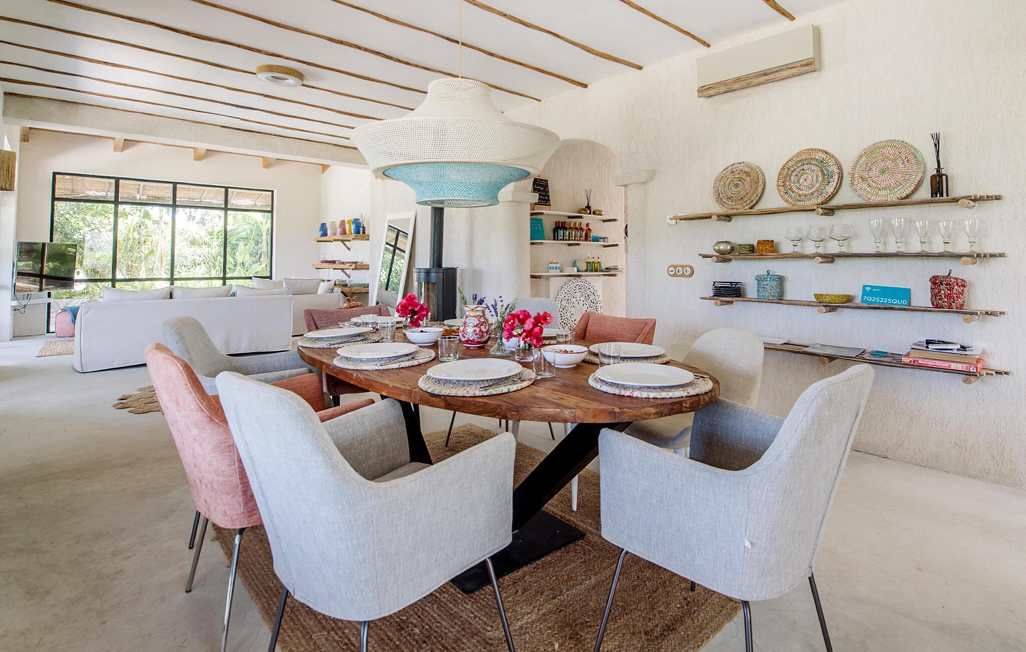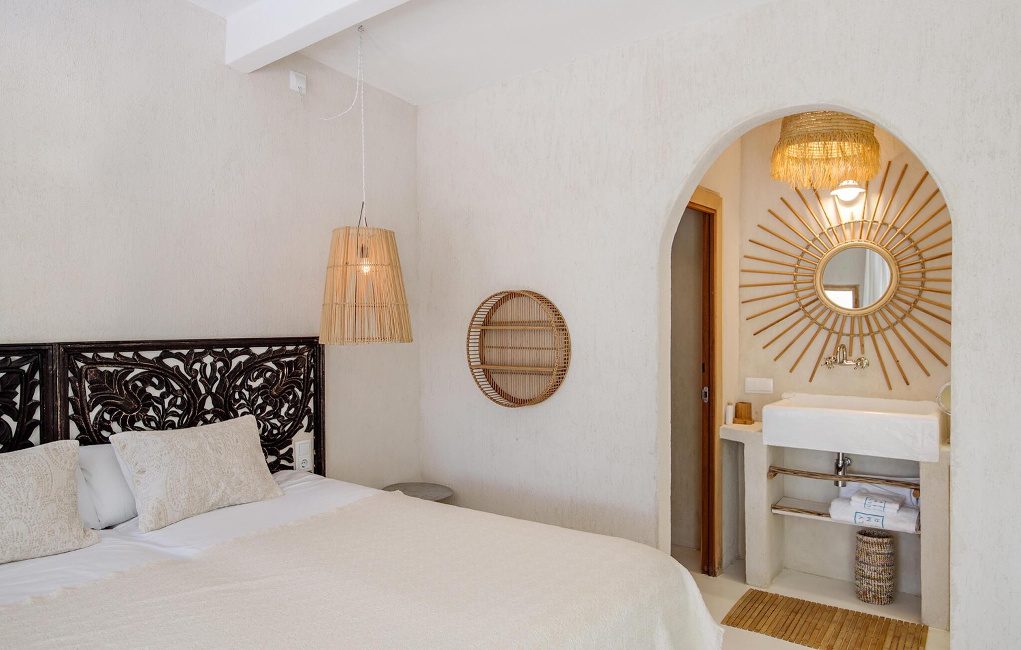 Auch von innen präsentiert sich „Only Summer“ mit viel Stil: „Schöner Wohnen“ lässt grüßen! Auf einer Ebene finden Sie vier schicke Schlafzimmer mit Bädern en Suite, den großzügigen Wohn- und Essbereich, die mit hochwertigen Geräten ausgestattete Küche und ein Gäste-WC. Alles ist wunderbar harmonisch und verspielt romantisch eingerichtet: Sanfte Naturfarben, rustikale Putzwände und Holzelemente verbreiten ein entspanntes, ländliches Flair und schicke Wohnaccessoires wie geflochtene Lampenschirme, bunte Vasen, gemütliche Sitzpoufs, silberfarbene Teller und Kerzenständer, stimmungsvolle Laternen, Teppiche, Kissen und Decken mit glitzernden Pailletten sowie Spiegel sorgen für eine große Portion Bohemian-Flair. Es sind die liebevoll ausgewählten Details in allen Räumen, die dieses Haus so besonders machen Umgeben von wunderschönen bunten Samtsesseln hat eines der Betten eine kunstvoll geschnitzte Rückwand, während ein weiteres Schlafzimmer ganz in Weiß gehalten ist, mit einer gemauerten Bank und einem luftigen Himmel über dem einfachen Doppelbett. Auch die Waschbecken in den Badezimmern sind teilweise gemauert und grob verputzt, gekonnt kombiniert entweder mit modernen schwarzen Armaturen oder mit einer nostalgisch anmutenden Armatur. Freuen Sie sich auf folgende inklusiven Leistungen: Champagnerempfang, Flughafentransfer, exklusive Mietwagen, unbegrenzte Reinigung, Concierge-Service, Einkaufsservice, luxuriöse Badezimmerartikel, kontinentales Frühstück, Fahrradverleih.