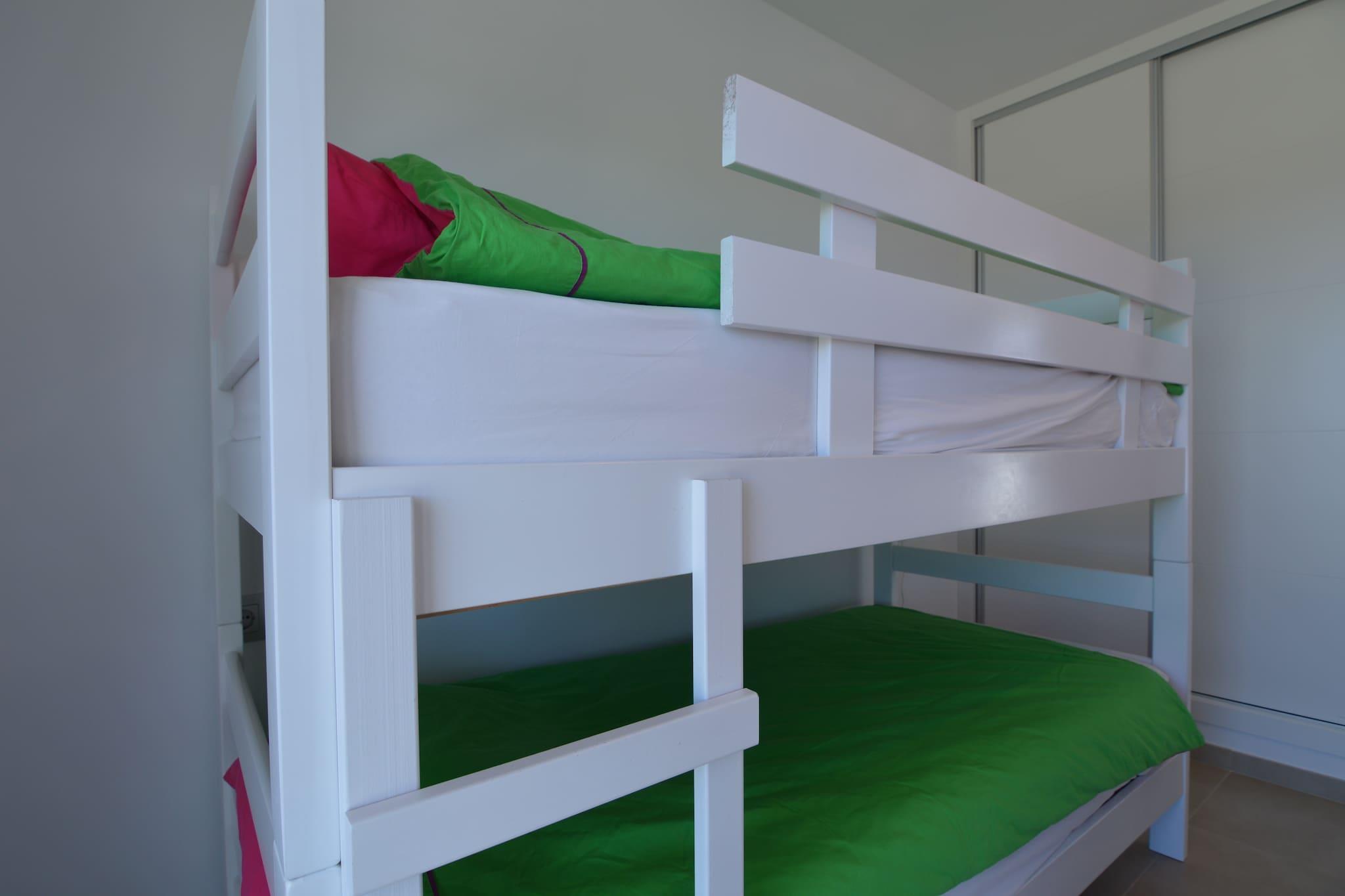 Parterre: (Wohnzimmer(TV), Küche(Kochherd(3 Kochplatten, Ceranfeld), 2x Kaffeemaschine(cups, Filter), Backofen, Mikrowelle, Spülmaschine), Schlafzimmer(Doppelbett(160 x 200 cm)), Badezimmer(Dusche, Waschbecken, Toilette), Klimaanlage) In der 1. Etage: (Schlafzimmer(Doppelbett(180 x 200 cm), Balkon), Schlafzimmer(2x Hochbett 2 Pers.), Badezimmer(Dusche, Waschbecken, Toilette), Klimaanlage) Terrasse, Garten(umzäunt), Grill(Gas), Pool(alleinige Nutzung, beheizbar, 6 x 3 m.), Überwachungskameras