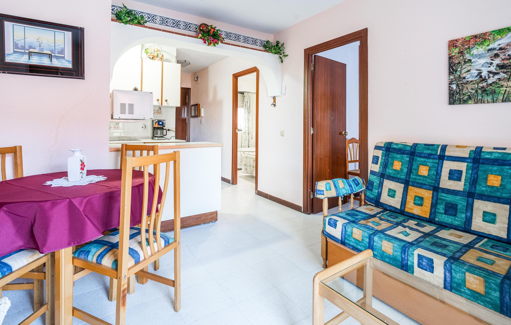 Lassen Sie den Alltag hinter sich und genießen Sie einen entspannten Urlaub in Ihrer einfachen Ferienwohnung, die Ihnen die Möglichkeit bietet, eine angenehme Zeit in einer schönen Küstenregion zu verbringen. Der Wohnbereich ist hell und freundlich gestaltet, mit einem gemütlichen Sofa und einem Esstisch, an dem Sie Ihre Mahlzeiten genießen können. Beginnen Sie Ihren Tag mit einem Kaffee auf dem Balkon und genießen Sie die ruhige Atmosphäre sowie den Blick in die Umgebung.