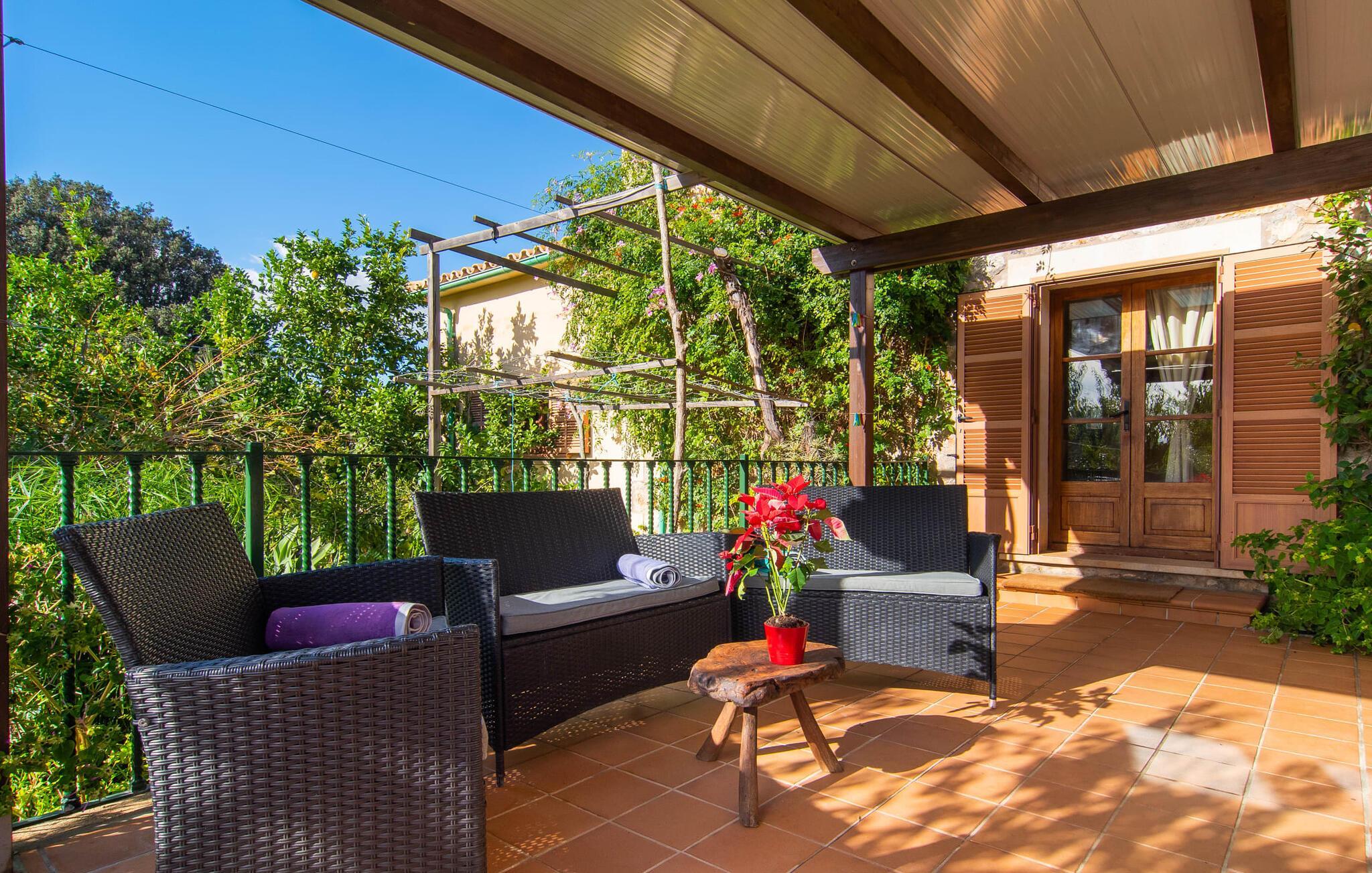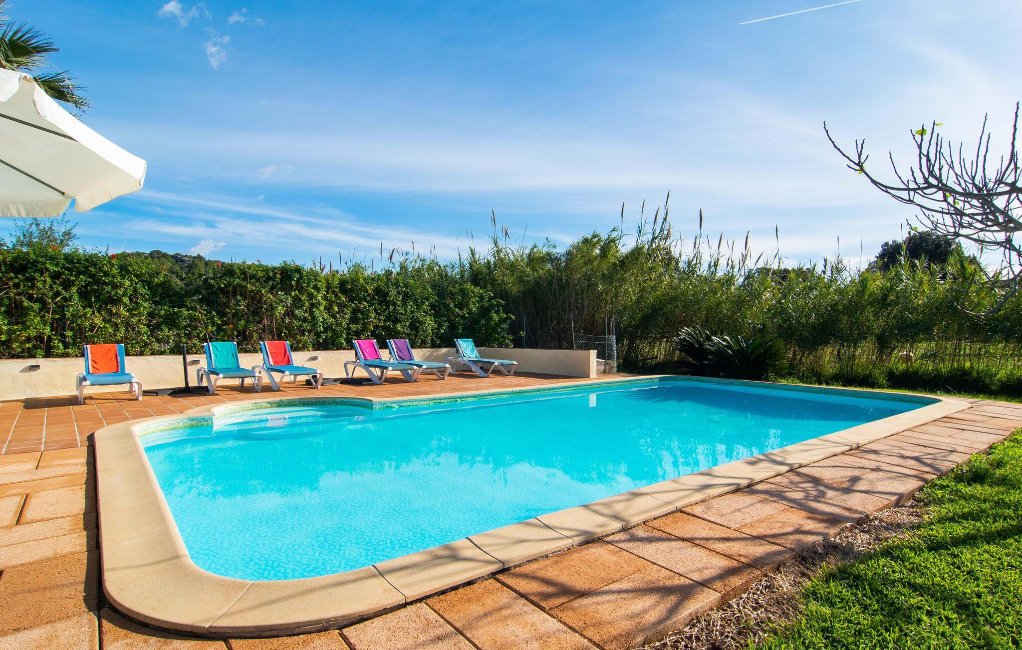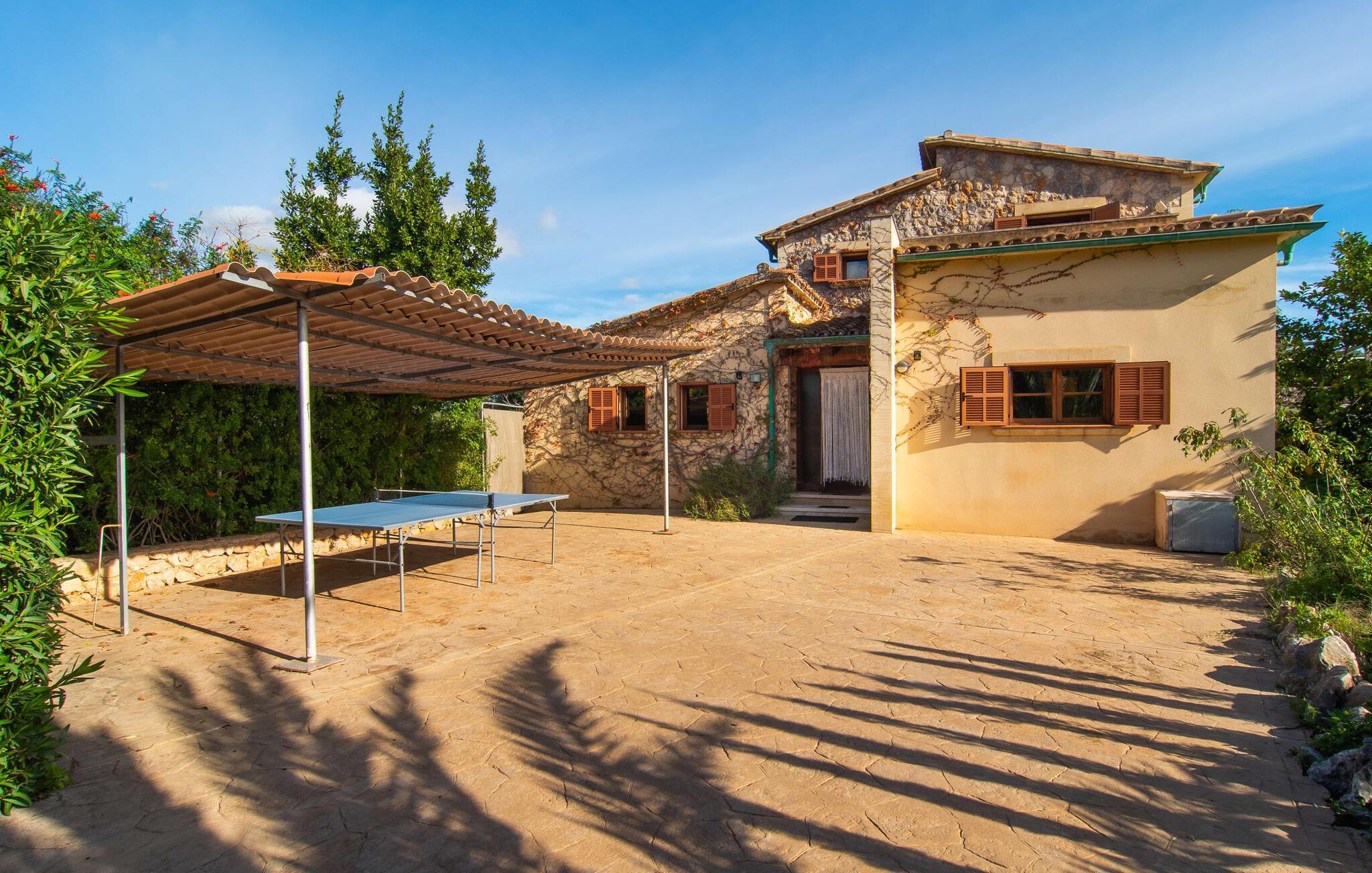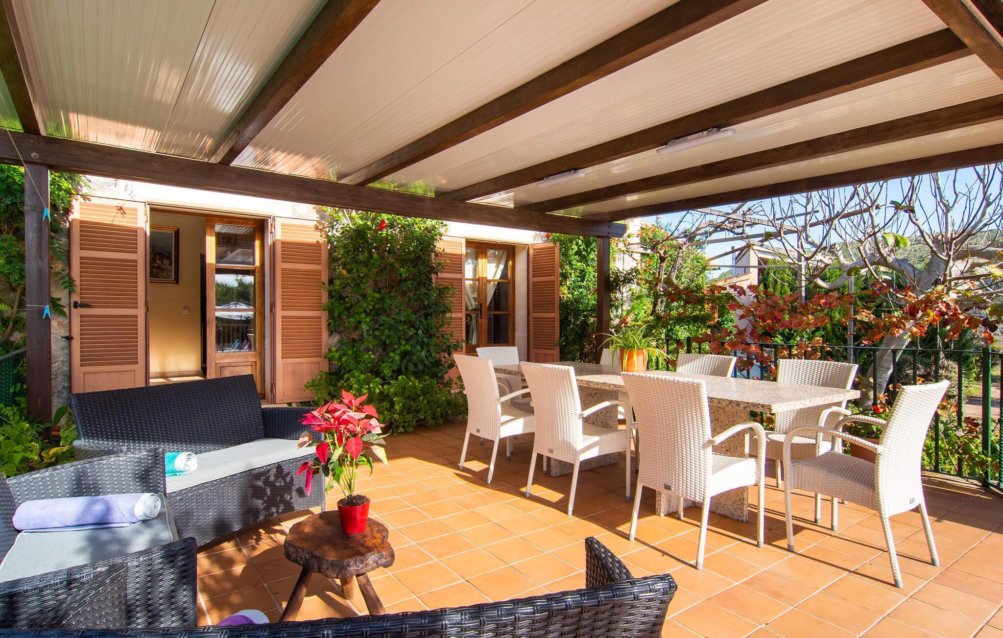 Dieses schöne, gut ausgestattete Landhaus auf Mallorca ist ideal für Familien, die Ruhe suchen und das Meer in unmittelbarer Nähe haben möchten. Sie wohnen hier in einer abwechslungsreichen Landschaft und genießen ein eingewachsenes Anwesen mit mediterraner Vegetation und teilweise altem Baumbestand. Für mitreisende Kinder ist die Liegewiese eine attraktive Spiel- und Tobefläche. Ebenso steht der Pool natürlich nicht nur für sportliche Bahnen, sondern auch für ausgelassenes Planschen zur Verfügung. Bei Bedarf kann der Zugang kindersicher verschlossen werden. Der Pool ist besonders bequem über eine Treppe zu erreichen. Auf der angrenzenden Terrasse stehen genügend Liegen für entspannte Stunden unter mediterranem Himmel bereit. Die teilweise überdachte Veranda liegt leicht erhöht und lädt mit einem Esstisch und einer Lounge zum geselligen Beisammensein ein. Der Grill lädt dazu ein, in der warmen Jahreszeit die meiste Zeit draußen zu verbringen.