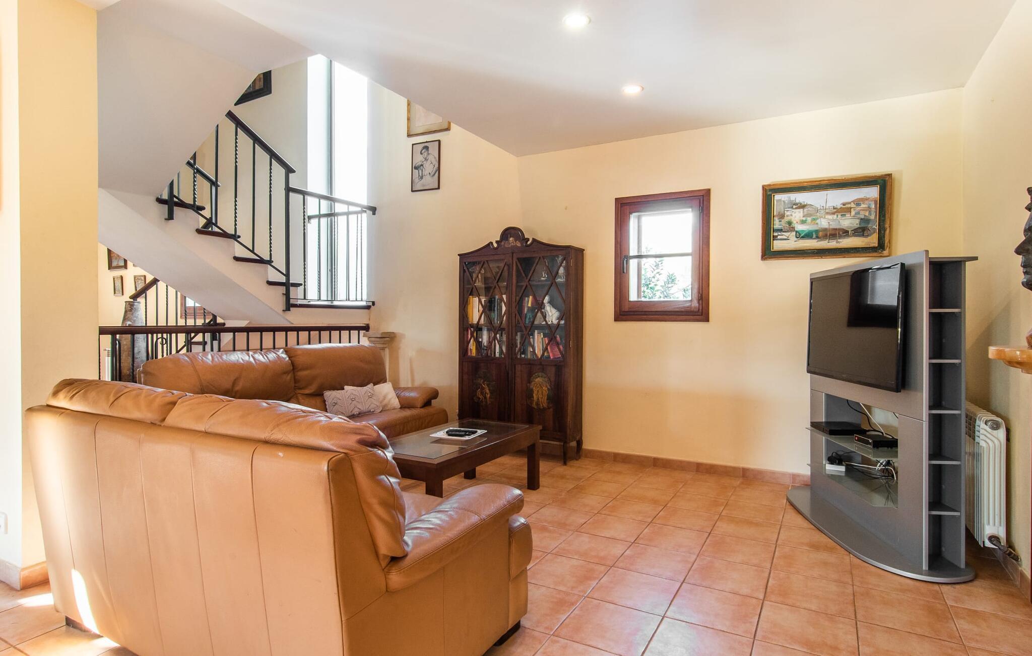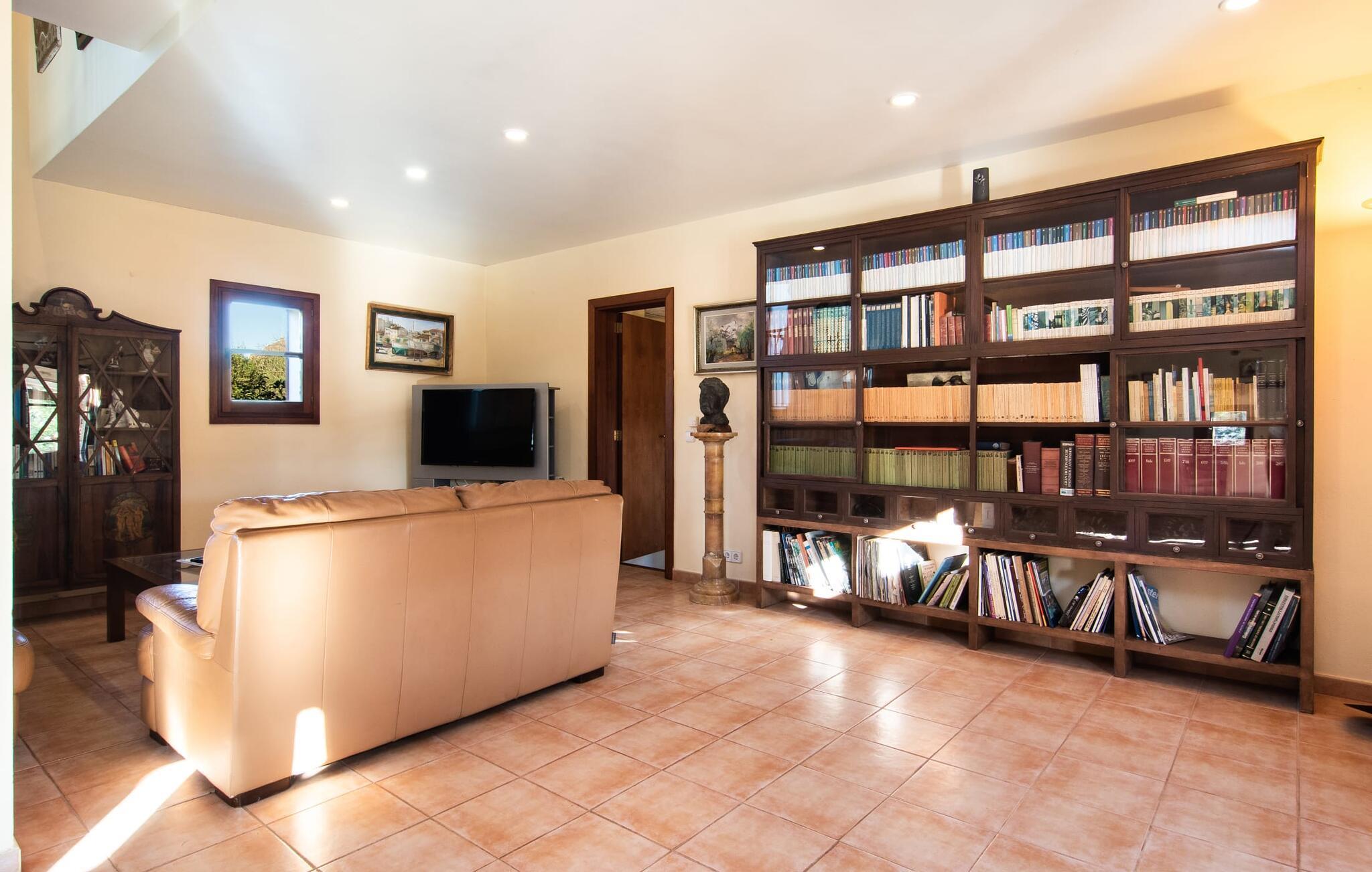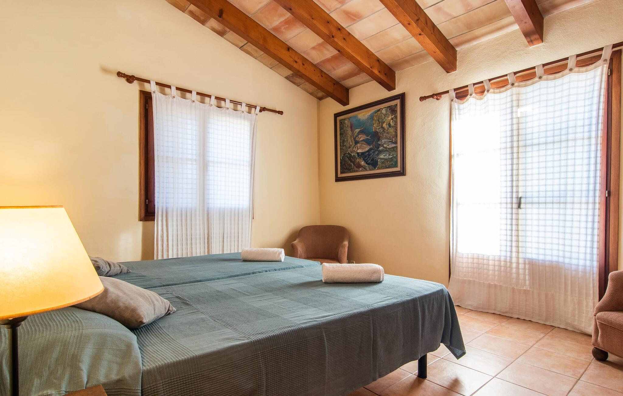 Das Innere des Hauses bietet eine Vielzahl an Annehmlichkeiten. Teracotta-Fliesen, helle Wände, eine teilweise offene Raumgestaltung und liebevoll arrangierte Accessoires sorgen für ein hohes Maß an Gemütlichkeit. Die Wohn- und Essbereiche gehen fließend ineinander über. Der Kamin ist zentral zwischen diesen Bereichen platziert und sorgt für zusätzliche Behaglichkeit an kühlen Abenden. Die voll ausgestattete Küche ist ideal zur Selbstversorgung und bietet sogar Platz für einen weiteren Tisch. Besonders praktisch ist die Durchreiche zum anderen Essbereich. Im Erdgeschoss befinden sich außerdem zwei Doppelschlafzimmer und zwei Badezimmer, eines davon en suite. Im Obergeschoss befinden sich zwei weitere Doppelschlafzimmer und zwei Badezimmer. Somit genießt man im Bauernhaus „Osfort“ ein Höchstmaß an Privatsphäre. Alle Schlafzimmer sind mit einer Klimaanlage ausgestattet, so dass auch im Hochsommer angenehm warme Nächte garantiert sind. Für Abwechslung sorgt der Billardtisch im Obergeschoss. Das ländliche und ruhige Bauernhaus „Osfort“ liegt zwischen Pollença und Port de Pollença im attraktiven Norden Mallorcas. Es ist von einem wunderbar grünen, privaten Bereich umgeben. Port de Pollença mit seinem schönen Yachthafen und dem weißen Sandstrand ist nur etwa 8 Autominuten entfernt. Dort finden Sie auch mehrere Restaurants, Bars und viele Freizeitaktivitäten.