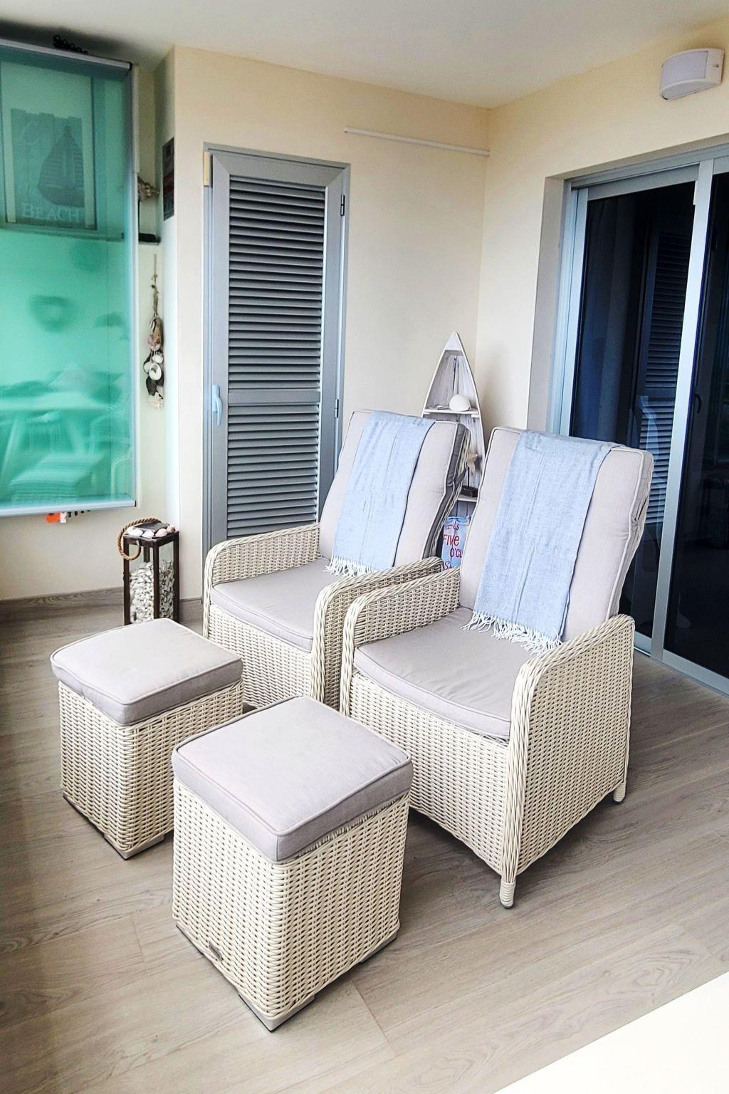 Die Terrasse ist modern und komfortabel ausgestattet, die beiden Relax-Sessel laden geradezu ein, zum Sonnenuntergang einen Cocktail in der Hand auf das Meer zu schauen. Am grossen Gemeinschaftspool haben wir extra für unsere Gäste zwei private Sonnenliegen mit Sonnenschirm gekauft, diese sind mit der Apartmentnummer M15 beschriftet. Der Padel-Tennisplatz kann jederzeit und kostenlos benutzt werden. Unseren Gästen steht kostenlos ein Tiefgaragenstellplatz zur Verfügung, Aufzug vorhanden und rollstuhlgerecht.