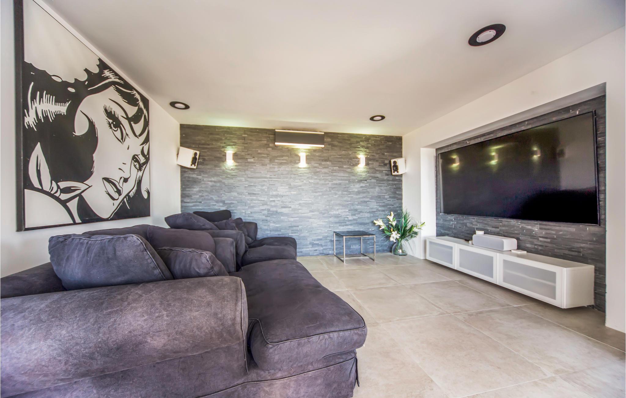 Die hohen Decken, großen Fensterfronten und spannender Deckenkonstruktion gibt dem Raum eine ganz besondere freie Atmosphäre. Selbige ist in einem modernen und stilvollem Design eingerichtet und bestens für Ihren entspannten Urlaub ausgestattet. Der Wohnraum mit großer Küche, Esszimmer und gemütlichen Sofagarnituren befindet sich im Erdgeschoss, mit einer Treppe gelangen Sie in den zweiten Stock, wo sich die drei Schlafzimmer und ein offenes Büro befinden. Hier können Sie die Treppen direkt in den Garten nehmen, oder durch den Haupteingang hinaus gelangen. Auf der Grünfläche und dem mit Stein ausgelegten Sonnendeck finden Sie einen teilweise überdachten schattigen Bereich, eventuell für ein gemeinsames Frühstück umgeben von fabelhafter Landschaft. Anschließend können Sie zusammen in der Außenküche die Mahlzeiten für den Grill vorbereiten und Getränke einkühlen, um nicht immer durch das ganze Haus laufen zu müssen. Sollte es nun mal zu heiß werden, können Sie sich direkt in Ihrem Außenpool erfrischen und danach sich in der Sonne baden. Selbst Ihr Vierbeiner ist herzlich willkommen.