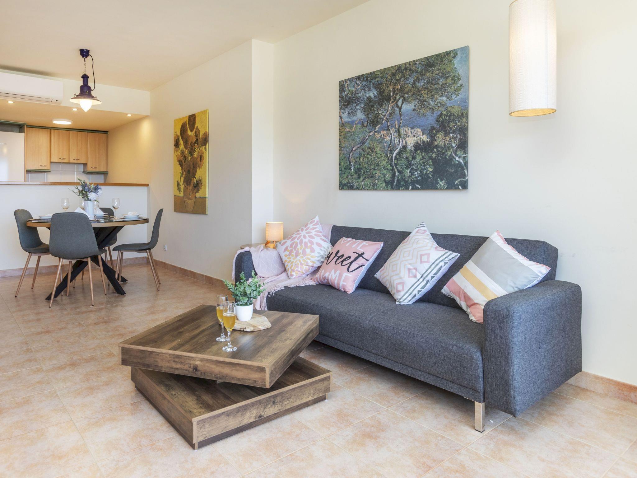 "Port Pals EIII", 3-Zimmer-Wohnung 90 m2 im 3. Stock. Zweckmässig eingerichtet: Wohn-/Esszimmer mit Digital-TV und Klimaanlage. Ausgang zur Terrasse. 1 Zimmer mit 1 franz. Bett (135 cm, Länge 190 cm), Dusche/WC. Ausgang zur Terrasse. 1 Zimmer mit 2 Betten (90 cm, Länge 190 cm). Ausgang zur Terrasse. Eingang mit Klimaanlage. Offene Küche (Backofen, Geschirrspüler, 4 Glaskeramikplatten, Toaster, Wasserkocher, Mikrowelle, elektrische Kaffeemaschine). Bad/WC. Boiler (150 Liter). Keine Heizmöglichkeit. 2 Terrassen. Terrassenmöbel. Herrliche Sicht auf das Meer und das Schwimmbad. Zur Verfügung: Waschmaschine, Bügeleisen, Kinderhochstuhl, Babybett, Haartrockner. Parkplatz Nr. 30 exterior. Bitte beachten: TV nur ES. HUTG-002897