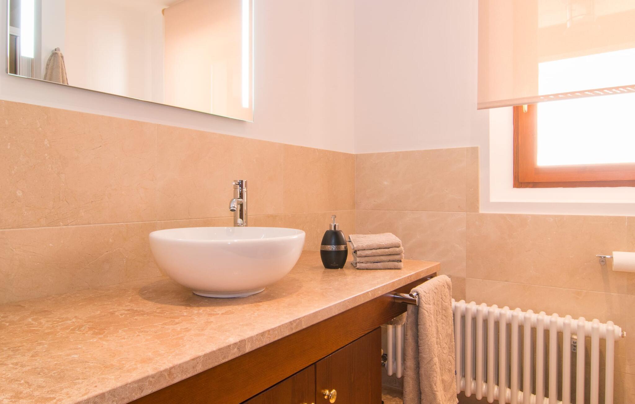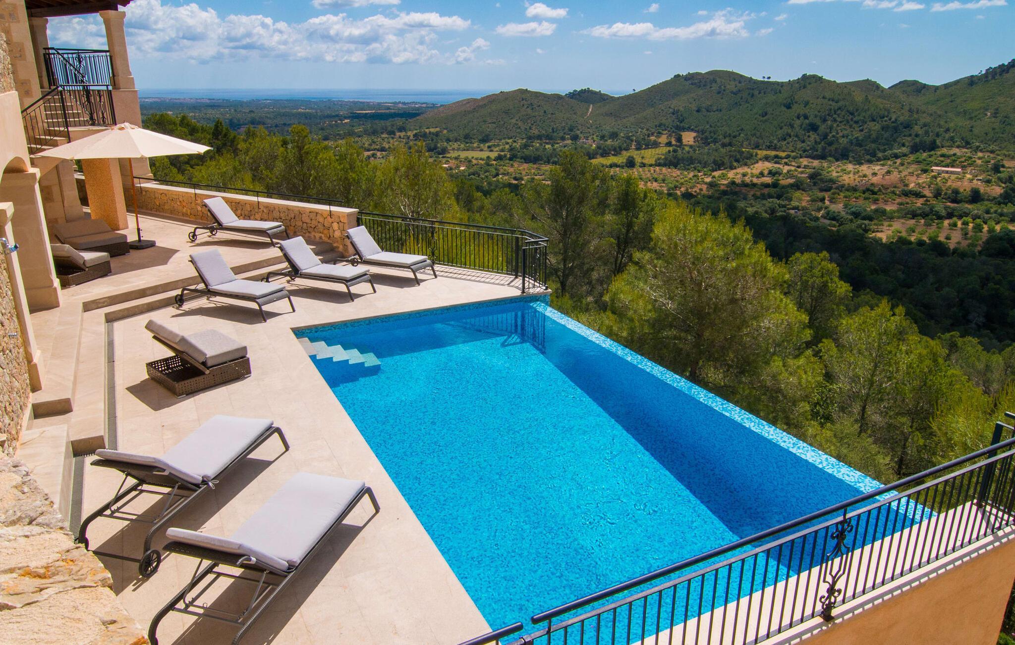 Moderner Wohnkomfort, ländliche Idylle sowie ein einzigartiger Blick in die Ferne – das sind die markanten Merkmale dieser ästhetischen Villa, die sich harmonisch an die hübsche Hanglage bei Son Macia anschließt und einen Ausblick eröffnet, der seinesgleichen sucht keiner. Bilder sagen mehr als Worte, dennoch möchten wir Ihnen die wichtigsten Merkmale dieses schönen Ferienhauses näher erläutern. Das architektonisch aufwendig und vielfältig gestaltete Haus steht auf einem riesigen, nach Südosten ausgerichteten Grundstück, das durch seine erhöhte Lage ein absolut außergewöhnliches Gefühl geprägt von Weite und Freiheit vermittelt. Der geschmackvolle Außenbereich, geprägt von offenen und überdachten Terrassenbereichen mit Meerblick auf verschiedenen Ebenen, bietet zahlreiche Sitzgelegenheiten im Freien. Die raffinierte Boden- und Wandgestaltung sowie die opulenten Säulen verleihen diesen Zonen ein sehr elegantes Flair. Hier finden Sie jeden Tag einen neuen, exklusiven Lieblingsplatz. Zum Verweilen im Freien stehen Ihnen lässige Lounge-Möbel zur Verfügung, ebenso hübsche Stühle am großen Tisch und bequeme Liegen am Pool, auf denen Sie nach Herzenslust die mediterrane Sonne genießen können. Der mit blauen Mosaiksteinen geflieste Infinity-Pool ist bequem über eine Treppe erreichbar und sorgt nicht nur für eine erfrischende Abkühlung, sondern auch für ein Badeerlebnis der besonderen Art, da man beim Gleiten durch das Wasser beeindruckend weit in die Ferne blicken kann. Bei warmem Wetter möchten Sie vielleicht einfach alle Ihre Mahlzeiten draußen einnehmen und die Einzigartigkeit des Ortes genießen. Die Outdoor-Küche eröffnet sogar die Möglichkeit, Mahlzeiten im Freien zuzubereiten. Der Gasgrill lädt zu kulinarischen Grillabenden in geselliger Runde ein.