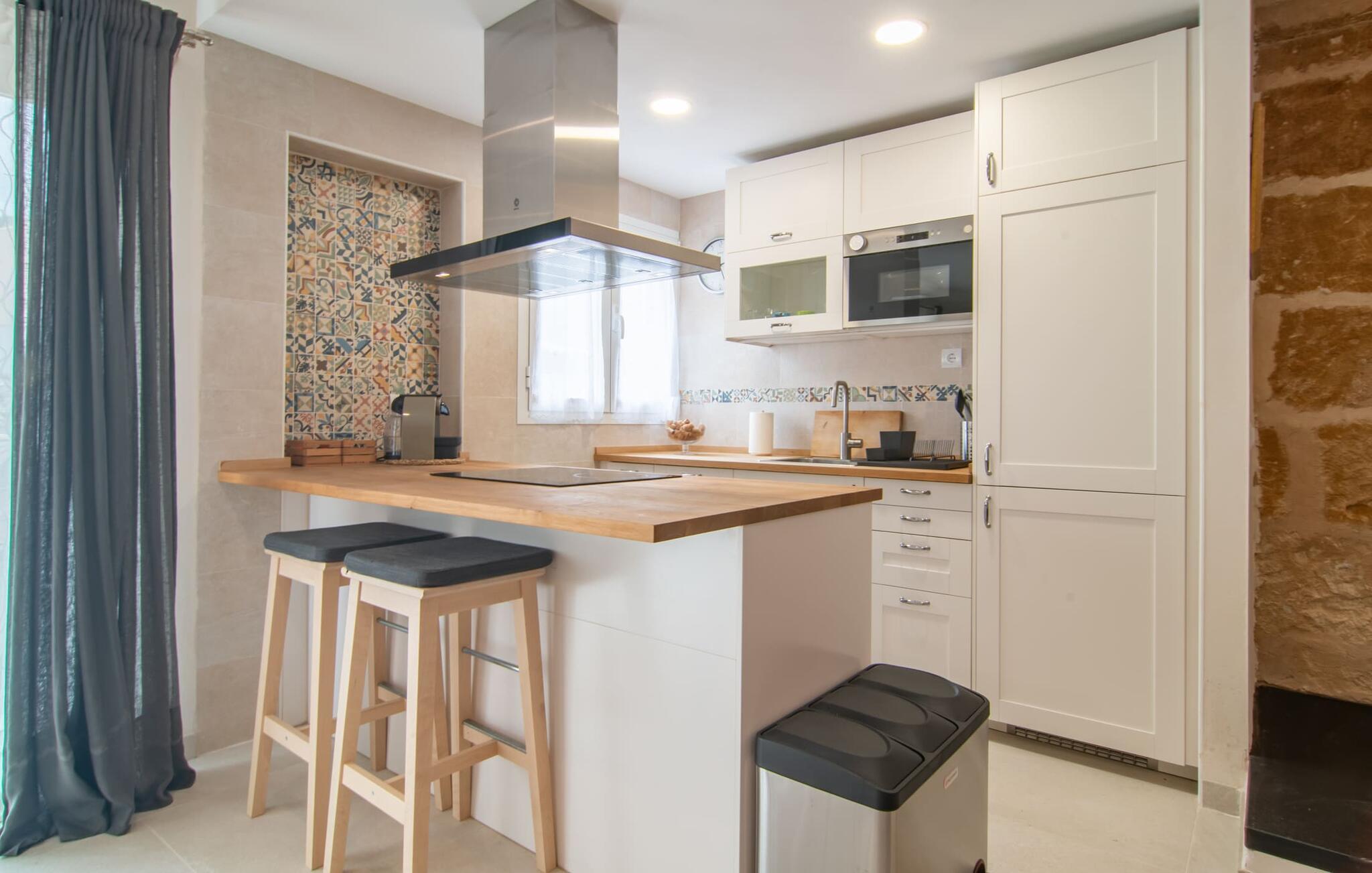 In Pollença, im Norden der Insel, finden Sie das schicke Stadthaus „Pare Vives“ – ein hervorragend ausgestattetes Juwel in hervorragender Lage. Von der Dachterrasse mit hübscher Außenküche und kleinem Pool genießen Sie den Blick über die Dächer der Stadt – und Ihre Privatsphäre zugleich. Das Haus liegt zentral an einer akustisch wahrnehmbaren Straße, je nach Windrichtung, sodass Sie Stadtbummel, Einkäufe und Restaurantbesuche bequem zu Fuß erledigen können. Der nächste Strand Platja de Port de Pollença ist etwas mehr als 6 km entfernt und Sie können Ihren Mietwagen in der privaten Garage parken.