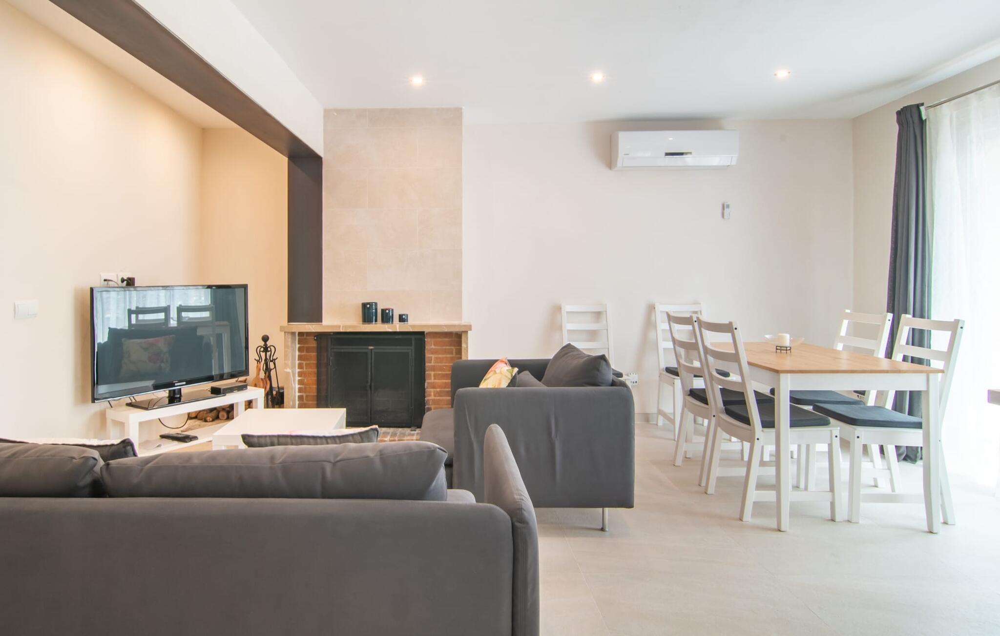„Pare Vives“ überzeugt auf ganzer Linie – auch im Hinblick auf die Inneneinrichtung. Dieses hübsche Ferienhaus wurde mit viel Geschmack und Liebe zum Detail gestaltet. Die gelungene Mischung aus Alt und Moderne strahlt eine angenehm heimelige Leichtigkeit aus, in der man sich sofort heimisch und wohl fühlen kann. Dank vieler Fenster, leuchtender Farben und geschickt platzierter Deckenbeleuchtung ist es überall schön hell. Dazwischen finden Sie rustikale Natursteinmauern, die dem Haus einen typisch mallorquinischen Touch verleihen. Im Erdgeschoss finden Sie das gemütliche Wohn- und Esszimmer, wo Sie sich rund um den gemütlichen Kamin versammeln können. Die offene Küche ist nur wenige Schritte entfernt – so gibt es mit vollem Tablett keine langen Wege vom Herd bis zum Tisch. Zwei Doppelschlafzimmer und zwei Badezimmer, eines davon en suite, runden das Wohnangebot auf dieser Etage ab, ein weiteres schönes Doppelschlafzimmer ist über die schicke offene Treppe zu erreichen.