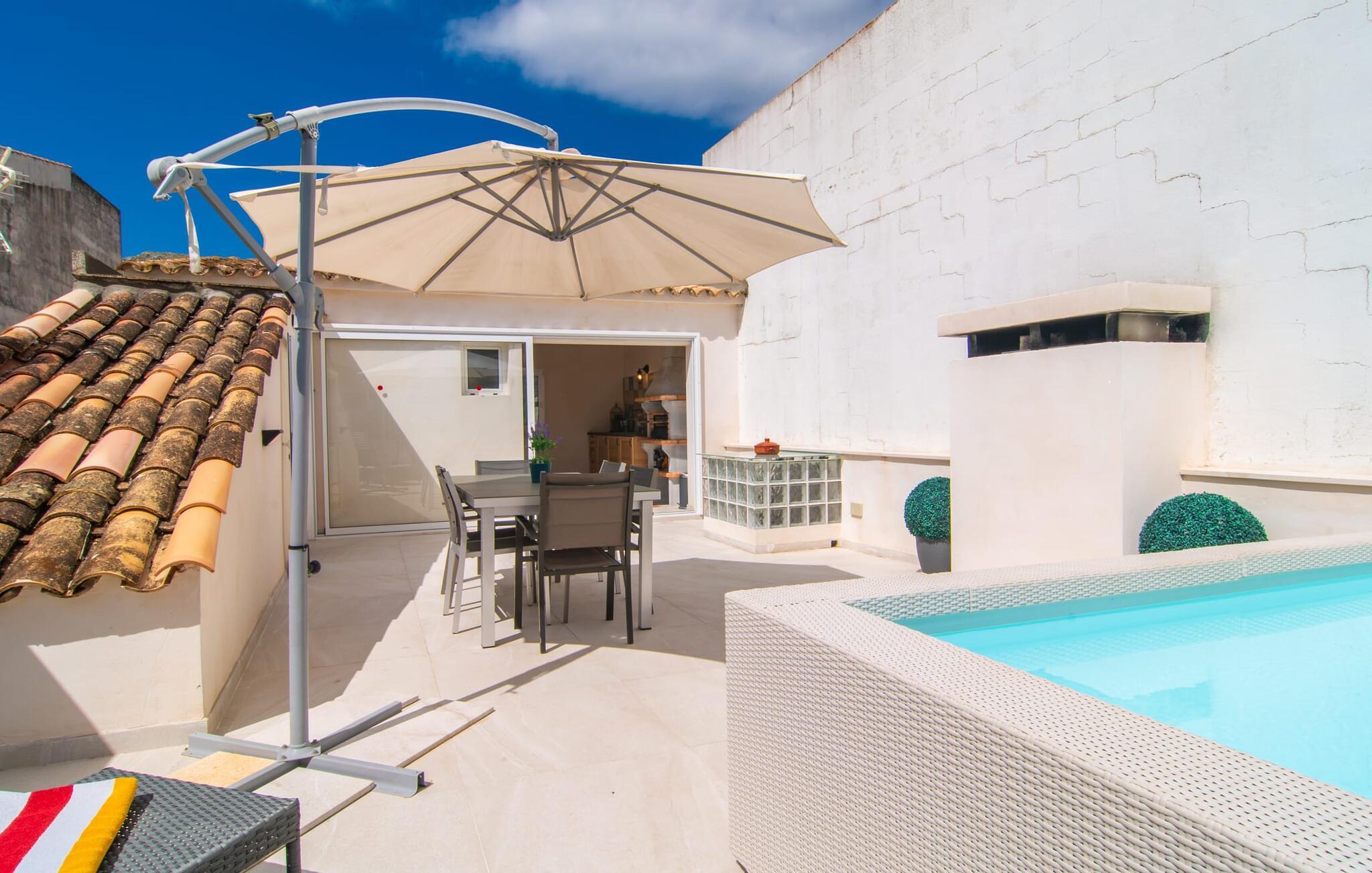Von hier aus können Sie fast alles zu Fuß erledigen – das schicke Ferienhaus „Pare Vives“ in Pollença ist einfach perfekt für einen erholsamen Urlaub auf Mallorca. Vor allem, wenn Sie nicht bei jedem Einkaufsbummel oder Restaurantbesuch mit dem Mietwagen durch die Gegend fahren möchten. Dank der zentralen Lage sind Sie praktisch mitten im Inselleben – können sich aber auch jederzeit in Ihre ganz privaten vier Wände zurückziehen. In diesem Fall wird es Ihnen an nichts fehlen: Das sehr gut ausgestattete Ferienhaus bietet nahezu jeden Komfort, den Sie sich während Ihres Urlaubs auf Mallorca wünschen können. Ein besonderes Highlight ist die wunderschöne Dachterrasse. Von dort aus hat man nicht nur einen wunderbaren Blick über die benachbarten Dächer des Dorfes. Sie können auch die Sonne genießen, sich im hauseigenen Minipool erfrischen und anschließend gemeinsam am großen Tisch verspeisen, was Sie auf dem Grill und in der kleinen, aber feinen Außenküche zubereitet haben.