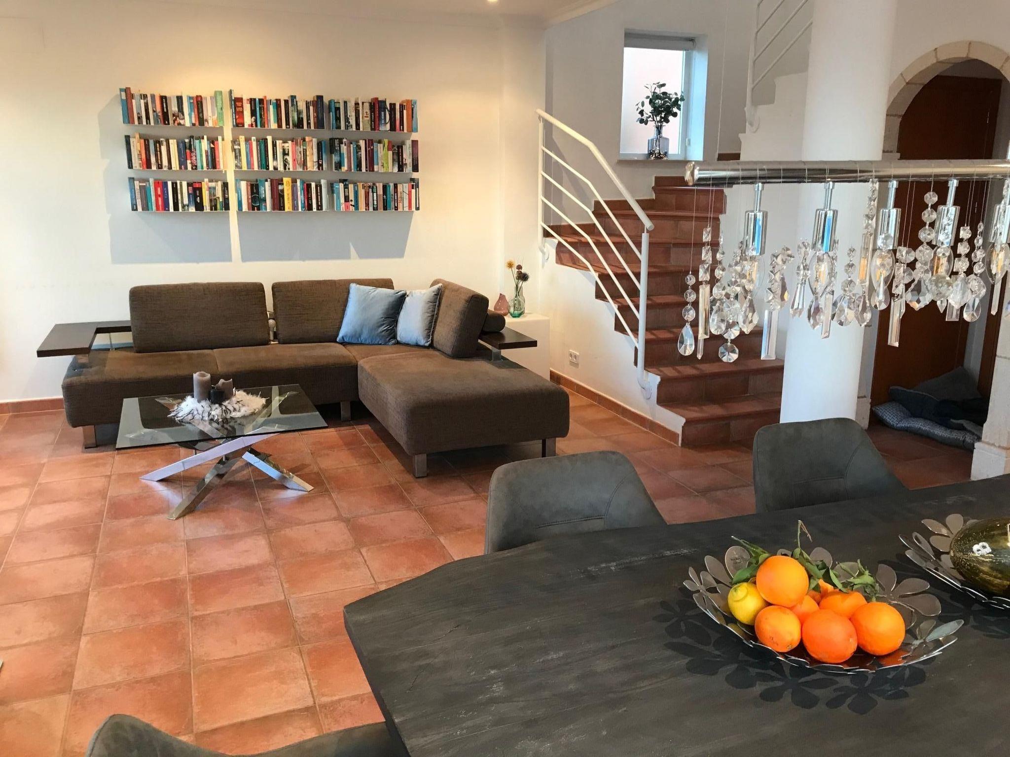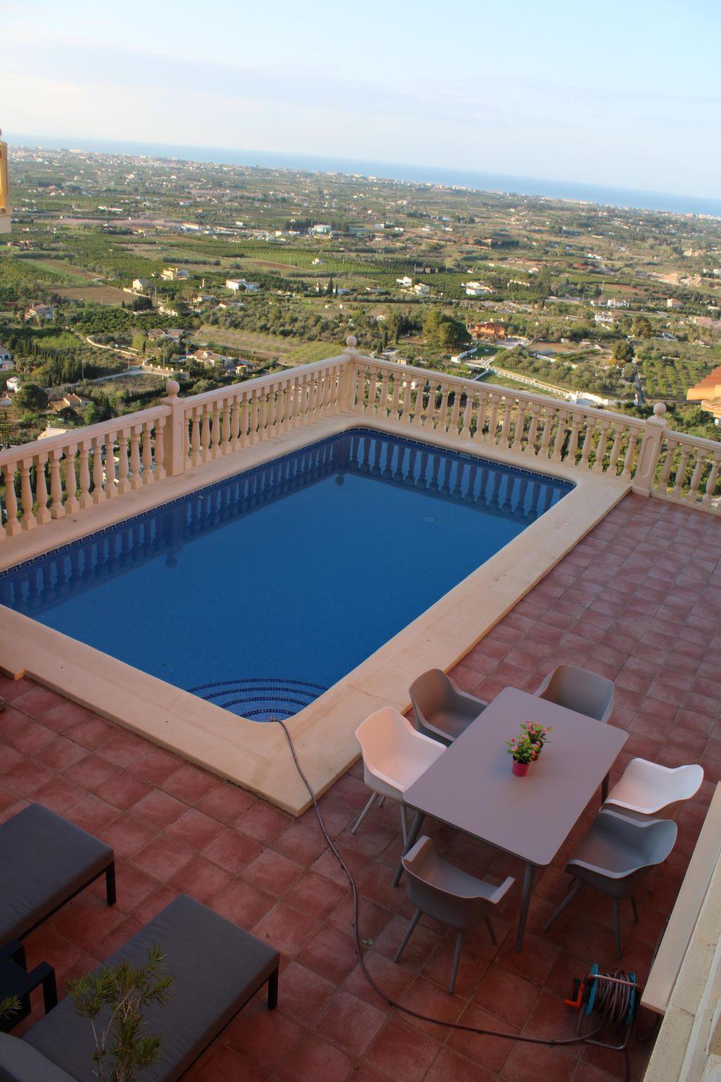 Der Außenbereich lädt mit einer großen, teilüberdachten Hauptterrasse mit 8 x 4 m Pool, Außendusche, Sonnenschirm und -liegen, sowie einer Sitzgruppe und Loungesesseln zum Entspannen ein. Auch ein Balkon, der von den Schlafzimmern zugänglich ist, und eine kleine Terrasse vor dem Haus mit Sitzplatz gibt es. Hier lässt sich das mediterrane Klima in vollen Zügen genießen.