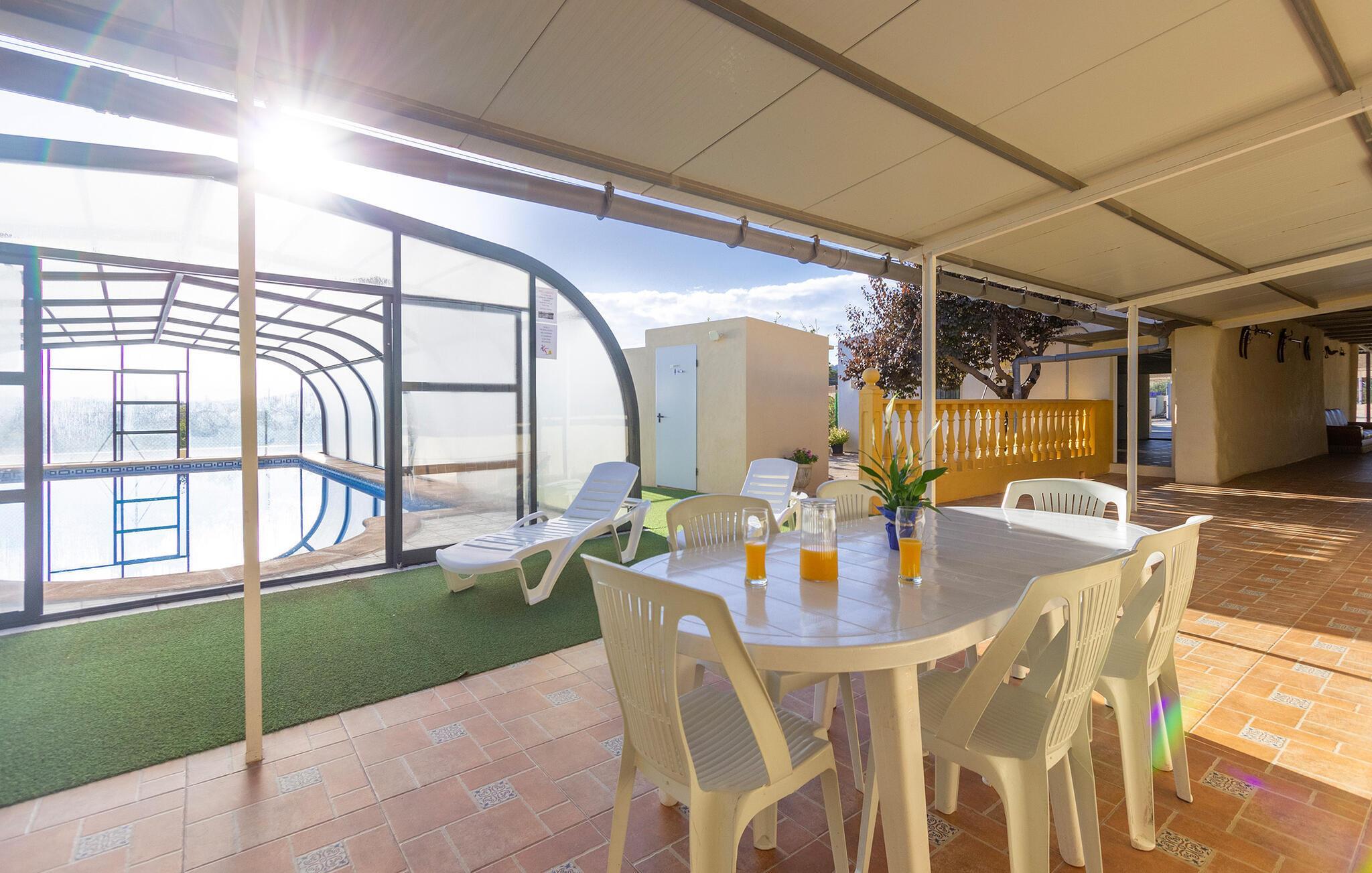 Freuen Sie sich auf entspannte Tage in diesem großzügigen Ferienhaus mit überdachter Terrasse und eigenem Hallenbad.