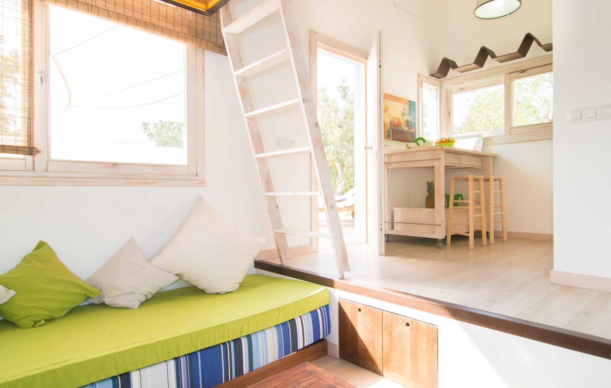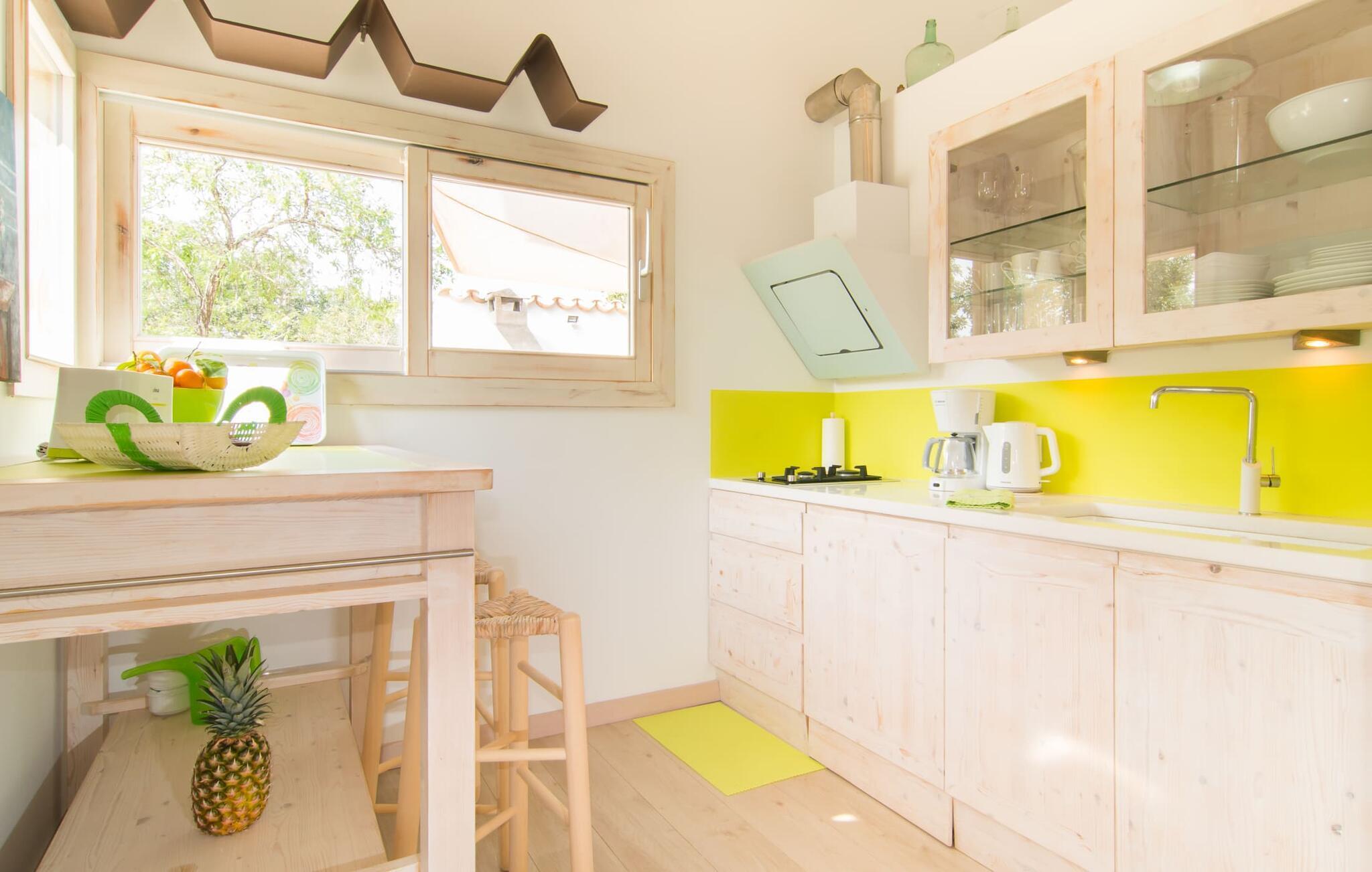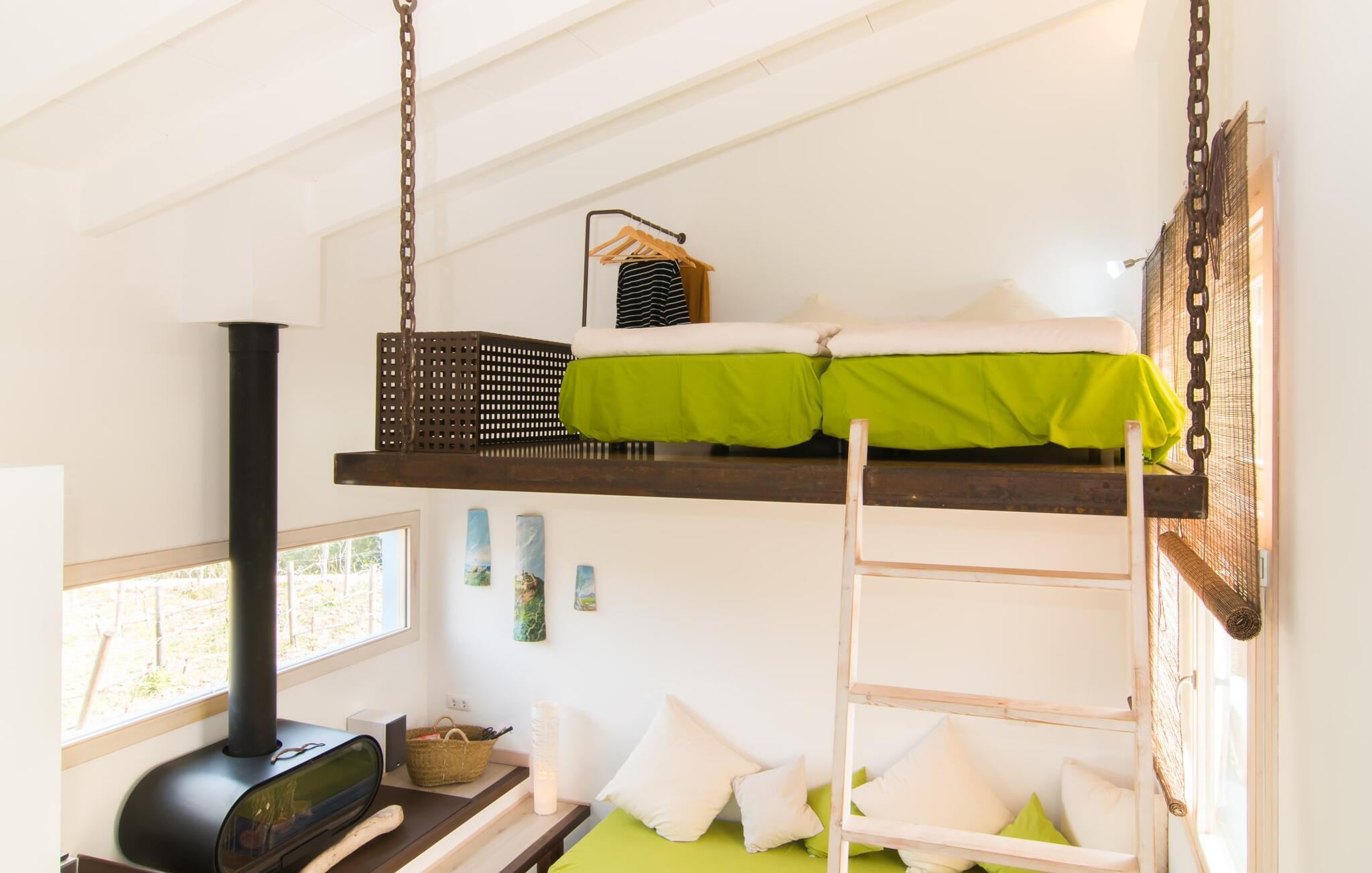 Sie haben sich bei der Größe der Wohnfläche dieser superschönen Studio-Villa, die ein tolles Ambiente auf wenig Platz bietet, nicht geirrt. Dieses kleine, lichtdurchflutete Zimmer bietet ein freundliches und dennoch absolut geschmackvolles Interieur, angenehm minimalistisch, aber mit unzähligen praktischen Details. Alle Möbel sind maßgefertigt und überzeugen durch ihr helles Design. Es gibt eine voll ausgestattete Küche aus gebeiztem Holz mit einem erhöhten Tisch und zwei eleganten Barhockern im gleichen Stil, die als Essbereich genutzt werden können. Lebhafte apfelgrüne Akzente ziehen sich durch die Küche und den Wohnbereich. Der Vorraum liegt nur ein paar Stufen tiefer als die Küche. Eine um die Ecke aufgestellte Sitzgruppe (auf Wunsch) bietet einen zusätzlichen Schlafplatz für Kinder. In den kühleren Monaten wird das Studio über den ovalen Kamin beheizt. Sie werden das Gefühl haben, auf Wolken zu schlafen, da der Schlafbereich buchstäblich über dem Wohnraum „schwebt“ und über eine Leiter zugänglich ist. Dort finden Sie zwei separate Matratzen, die ein bequemes Nest bilden – perfekt für verliebte Paare oder auf dem Weg dorthin. Das moderne Badezimmer mit ebenerdiger Dusche und einem Waschbecken auf einem Holzregal liegt auf der gleichen Ebene wie die Küche. Besonders praktisch ist in diesem Fall die Außendusche am Pool, die Sie im milden, warmen Klima gerne nutzen. Wir halten diese Villa für ein kleines Schloss, wie der Name schon sagt, und für ein beispielloses Meisterwerk in der Wohnraumnutzung, das dem Eigentümer hervorragend gelungen ist. Hier in diesem kleinen Wohnraum werden Sie sich besonders frei fühlen und merken, wie Sie mitten in der Natur zu Ihren Wurzeln zurückkehren können.