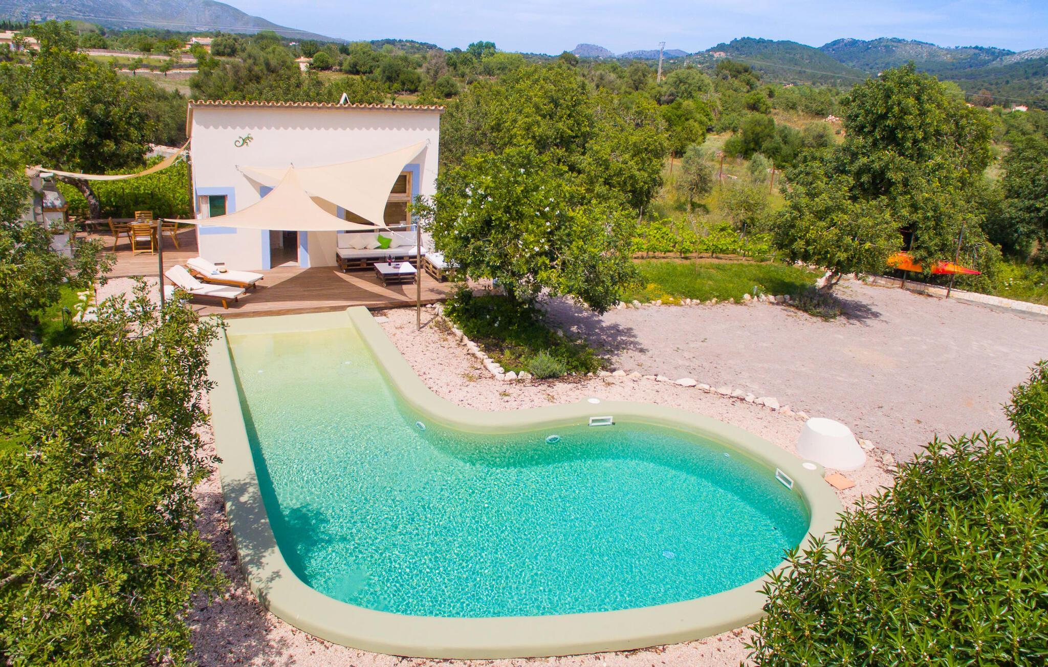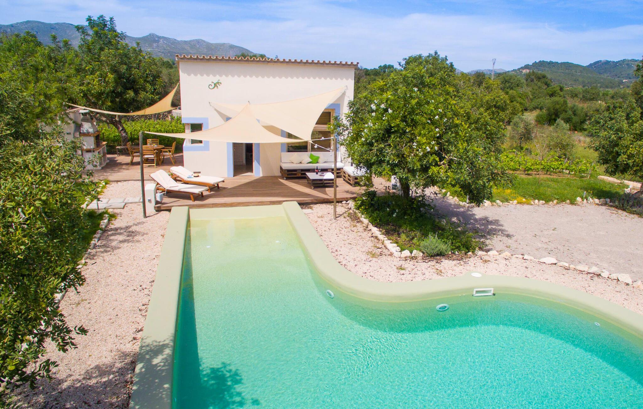 Die Schönheit der Villa „Petit Chateu“ sieht man auf den ersten Blick und Sie werden sich bestimmt in sie verlieben. Das kompakte Häuschen mit den blau umrandeten Fensterflächen liegt in herrlich ländlicher Alleinlage inmitten eines oasenartigen Gartens an der Ostküste Mallorcas. Die umliegenden sanften Hügel der Region, die das ganze Jahr über grün sind, umschmeicheln dieses Juwel. Das Ensemble aus einem zierlichen Baukörper mit vorgelagerter Terrasse ist komplett nach Süden ausgerichtet. Gleiches gilt für den Pool, den man von der mit Markisen überdachten Terrasse aus direkt über einen flachen Einstieg betritt. Es herrscht ein absolut einzigartiges Strandflair, das durch die bequemen Holzliegen und die im Garten aufgestellten Hängematten unterstrichen wird. Der sehr schön angelegte Garten mit riesigen Bäumen und unzähligen Blütenpflanzen verfügt sogar über einen eigenen Weinberg. Es gibt zwei holzüberdachte Terrassen: die Grillecke, wo vor der gemauerten Grillstation eine Essecke eingerichtet wurde, und die große Holzterrasse direkt vor dem Haus. Neben dem bereits erwähnten Sonnenbereich für die Liegen gibt es auch eine mit trendigen Palettenmöbeln ausgestattete Lounge für absolute Entspannung bei einem erfrischend kühlen Sundowner.