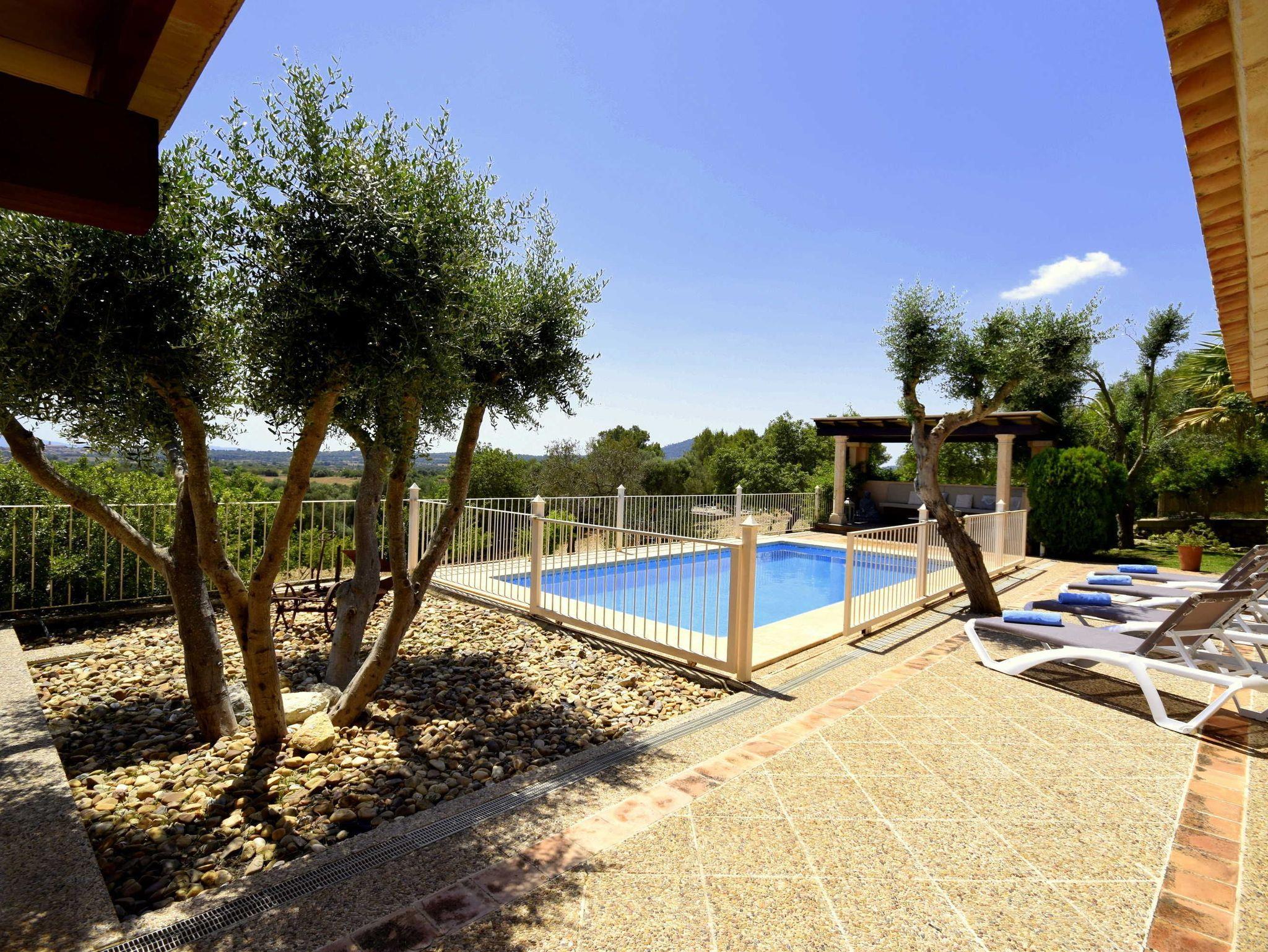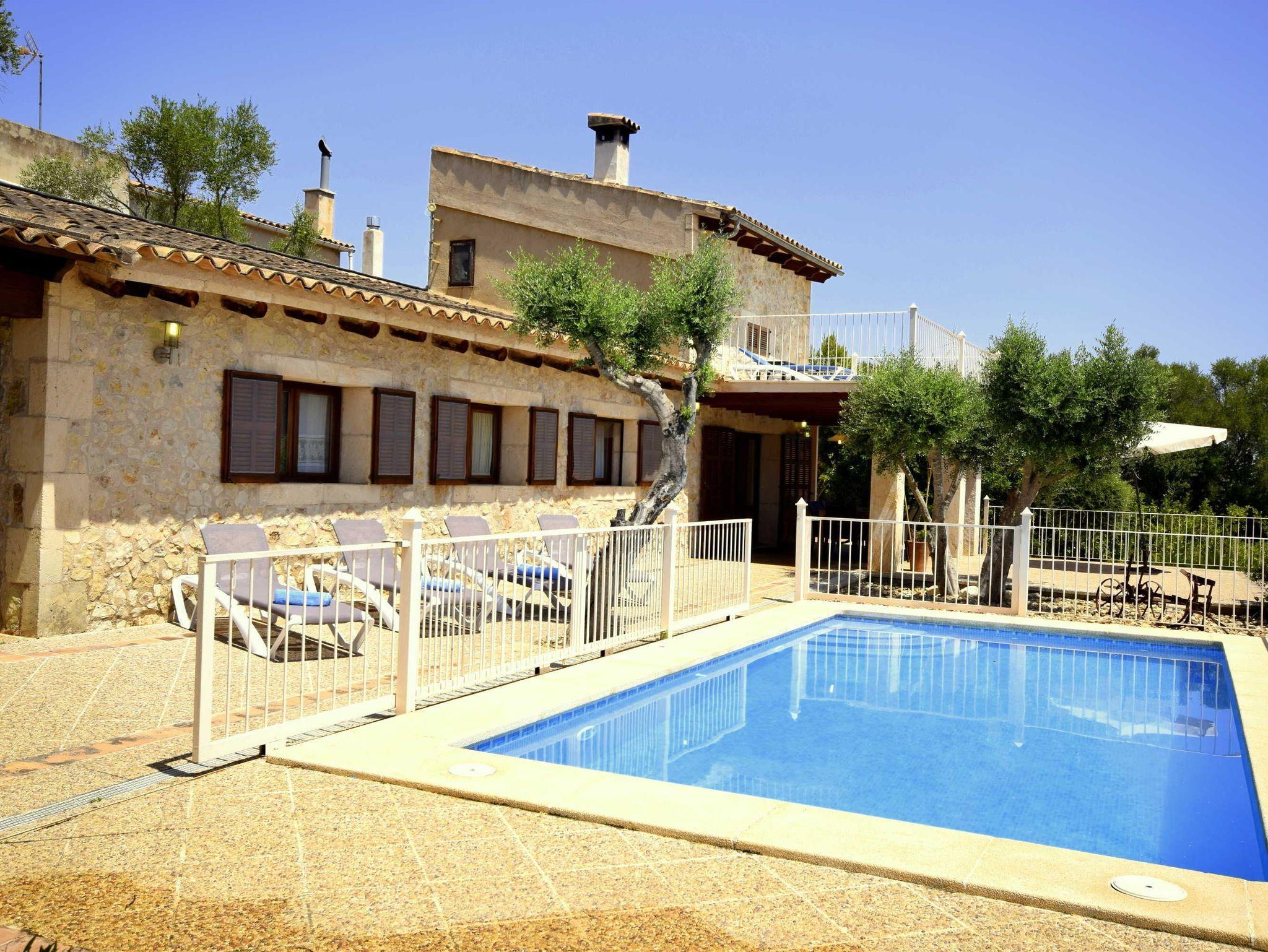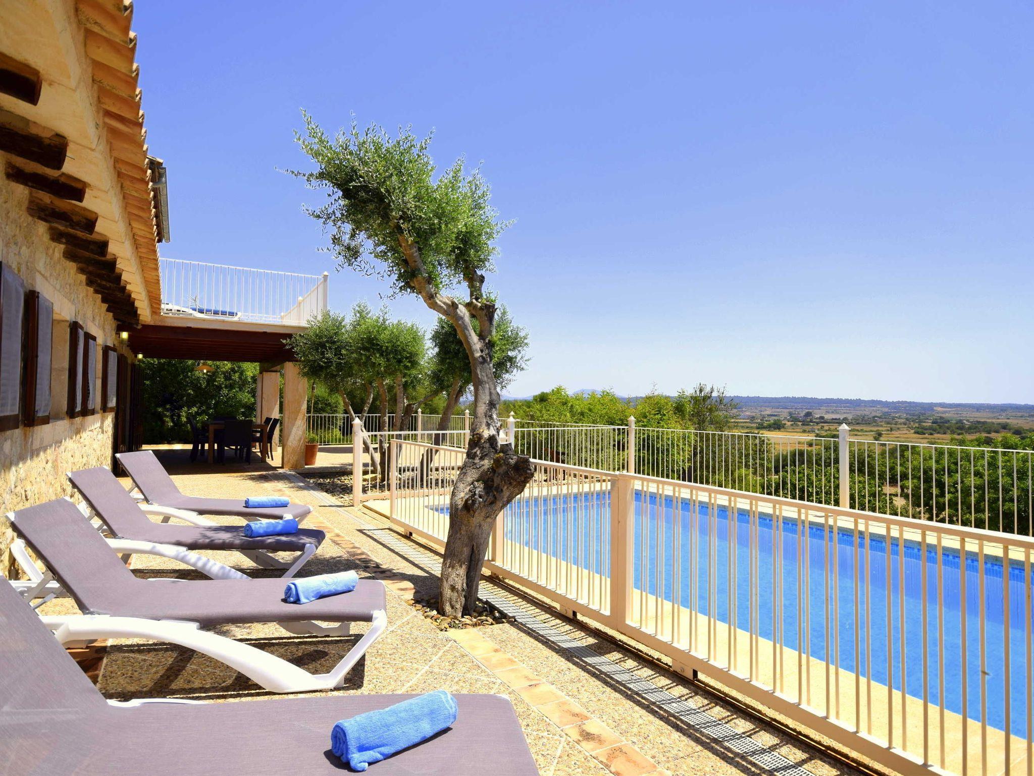 Sehr ruhig gelegene Finca Sa Font bei Petra, Pool Panoramaweitblick, Ortsnah.3 Schlafzimmer, eines davon klimattisiert, 2 Bäder, 1 x en Suite, Pool kindersicher abgeteilt, 6 Pers.Dieses typische, sehr gepflegte mallorquinische Landhaus wurde von den Eigentümern mit viel Liebe zum Detail restauriert und modernisiert. Durch die leicht erhöhte Lage des Hauses,bietet sich von den teilweise überdachten Terrassen ein wunderschöner Weitblick auf Petra und die dahinter liegende Insel. Im Inneraum setzt sich die gestalterische Linie mit mediteranen Flair fort. Vom großen Wohn-/Esszimmer mit Kamin und Kaminofen gelangt man in die Küche, die ebenfalls einen Terrassenzugang hat. Eines der Bäder liegt in einem Flur im EG zwischen 2 Schlafzimmern, wovon eines ebenfalls direkten Terrassenzugang hat. Eine Treppe führt aus dem Wohnzimmer zum 3. klimatisiertem Schlafzimmer mit Bad en Suite und eigener Terrasse. Die Qualität und Verarbeitung der materialien, die erhabene Lage geben hier vom ersten Moment an das Gefühl der Geborgenheit und Ruhe. Der Pool ist kindersicher eingezäunt. Selbstverständlich gibt es einen Aussengrill sowie Spielflächen im Garten und den angrenzenden Grünflächen.