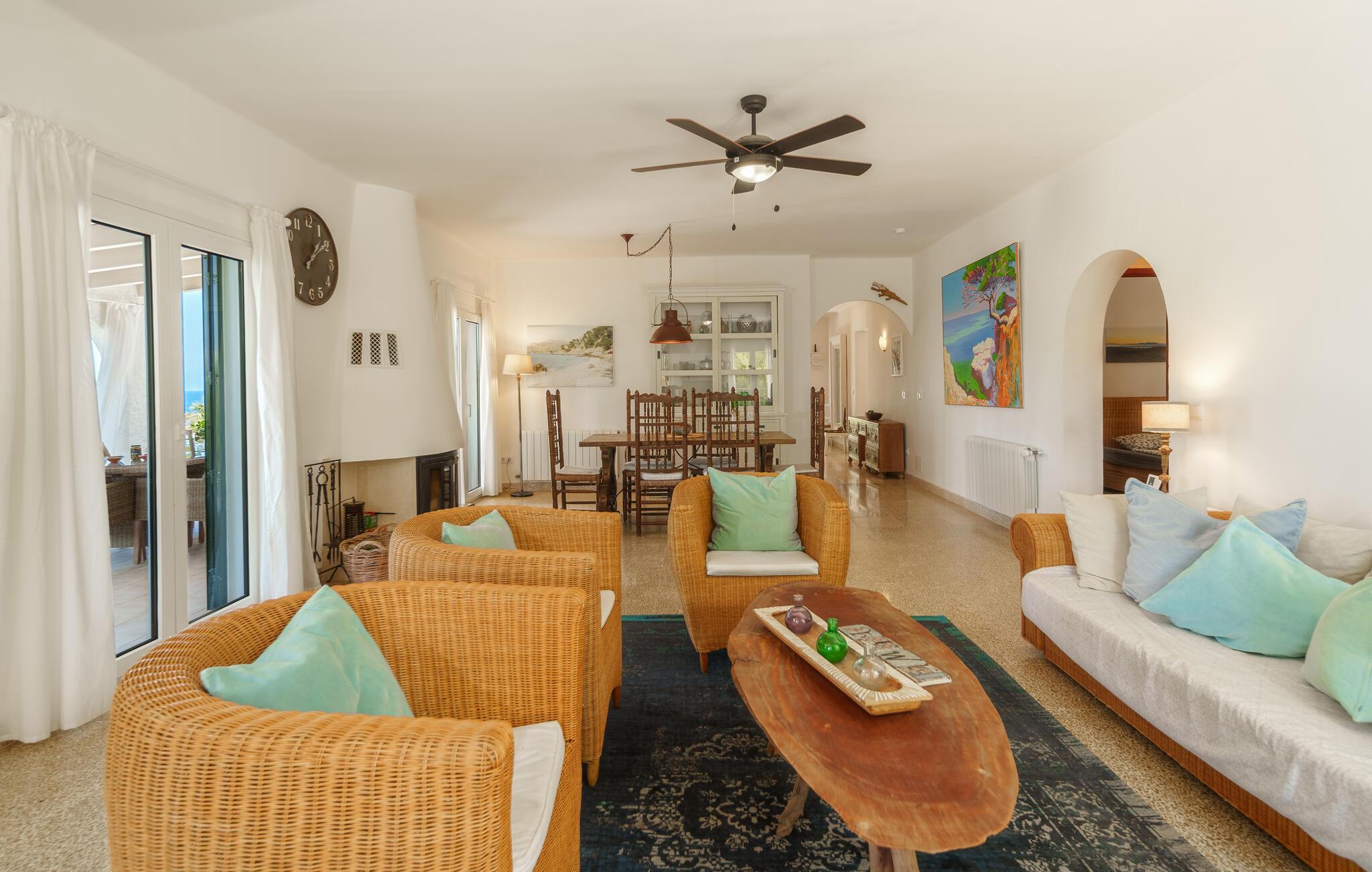 Dank der großen Fenster können Sie auch im Inneren der Villa viel Sonnenlicht genießen, wodurch ein unvergleichlicher, insgesamt heller und freundlicher Innenraum entsteht. Einige antike Holzmöbelstücke, wie eine Kommode, an der Sie Ihre Postkarten schreiben können, harmonieren wunderbar mit der Korbsitzgruppe, und schöne Einzelstücke wie der rustikale Wohnzimmertisch aus Holz sorgen für ein natürliches Gefühl. Im Wohn- und Esszimmer können Sie nicht nur den Blick auf den zentral positionierten Kamin genießen, sondern auch einen wunderbaren Filmabend genießen oder auch ein köstliches Essen am soliden und gediegenen Holztisch genießen. Schicke Bodenteppiche sorgen für angenehme Gemütlichkeit. Auf den Barhockern in der modernen Küche nebenan können Sie Ihren ersten Kaffee schlürfen oder ein Müsli genießen, um neue Energie für einen wundervollen Tag zu tanken. Von hier aus gelangen Sie auch in den herrlichen Außenbereich. Auf dieser Etage befinden sich auch die drei Doppelzimmer und zwei Badezimmer. Wie Sie auf den Fotos sehen können, geht seine zeitlose, schlichte Eleganz mit ansprechenden Naturbildern an den Wänden einher. Auch die Badezimmer sind neu renoviert. Das eine Etage höher gelegene Turmzimmer ist ein absolutes Highlight der Villa und ein Ort, an dem Sie bequem auf einer Couch entspannen oder im Schaukelstuhl ein gutes Buch lesen können, während die Dachterrasse nur einen Schritt entfernt ist.