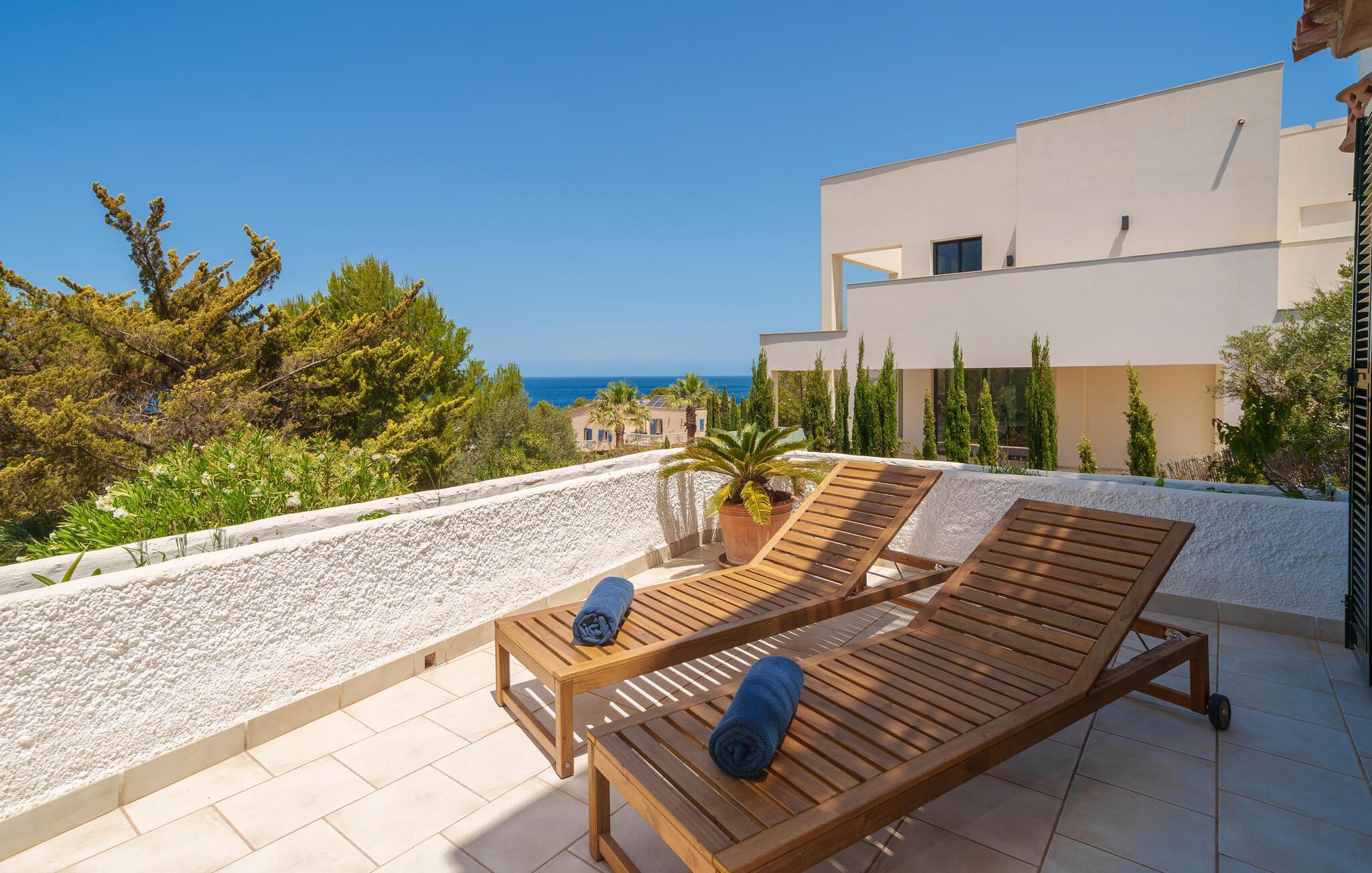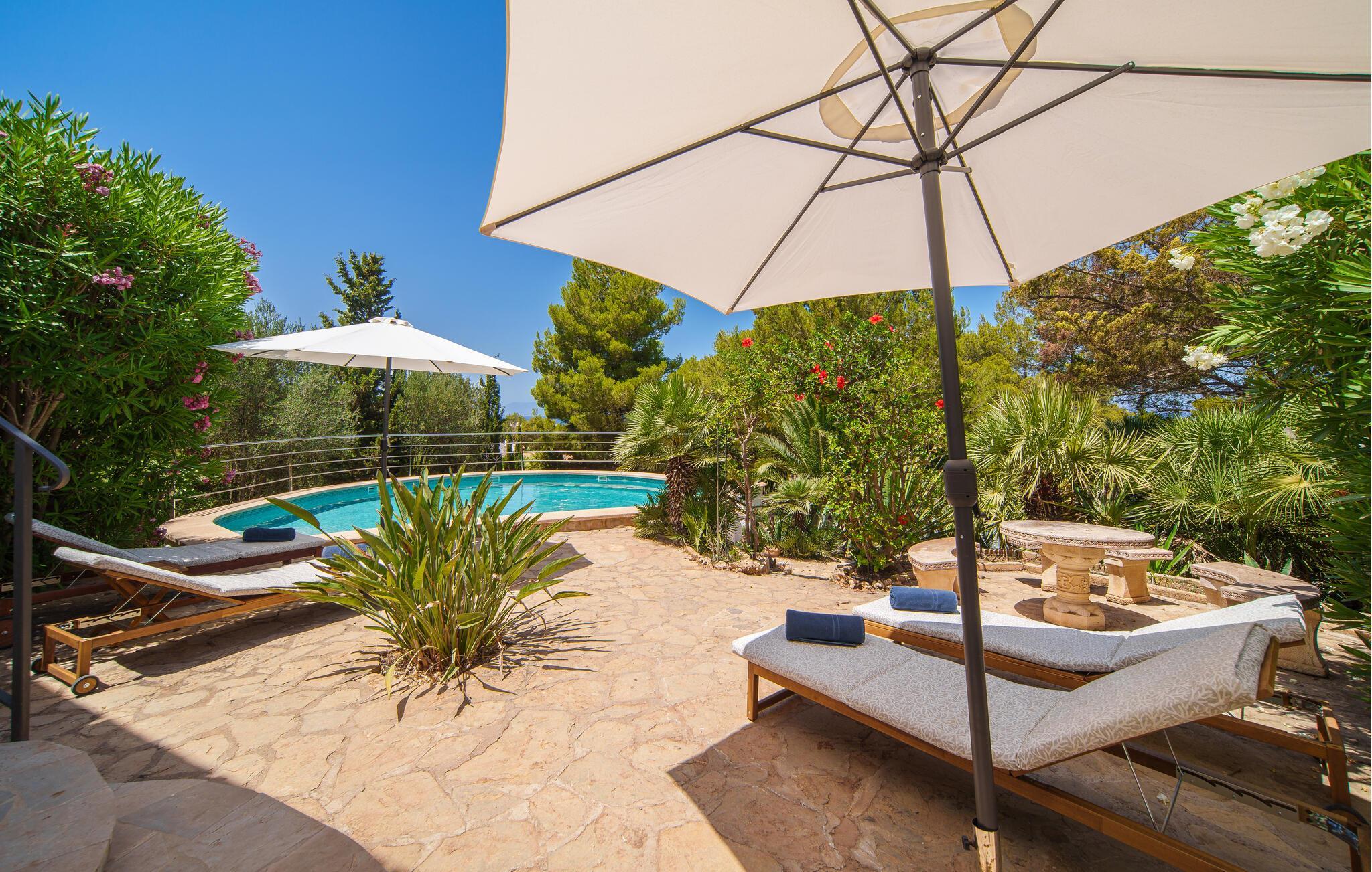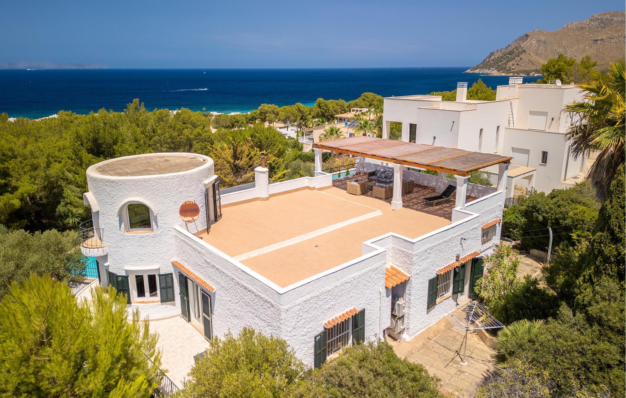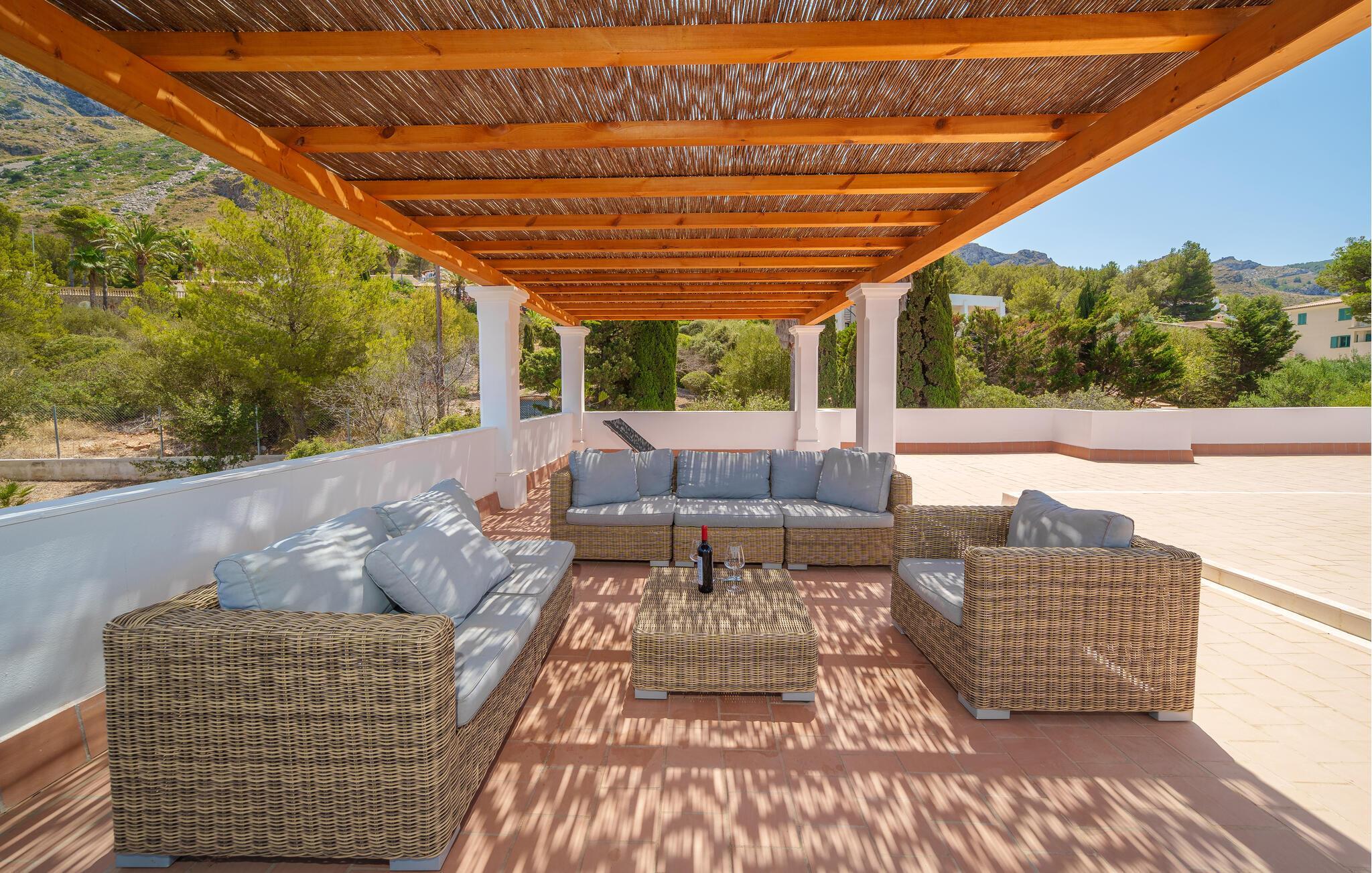 Sie können sich nicht zwischen den Bergen und dem Meer entscheiden? Wenn Sie sich für diese Villa entscheiden, müssen Sie das nicht tun: Im Hintergrund ragen die typischen Hügel der unberührten nordmallorquinischen Landschaft in den Himmel und bieten ein so natürliches Bild, dass es Sie nicht überraschen würde, eine Herde wilder Pferde vorbeigaloppieren zu sehen. Und wenn Sie auf der herrlichen überdachten Terrasse Ihren Blick um 180 Grad drehen, können Sie die Unermesslichkeit des Meeres genießen. Ohne Zweifel ist diese Dachterrasse mit ihren großzügigen Sitz- und Liegebereichen ein idealer Ort, um an Ihrer Bräune zu arbeiten und dabei die milde Brise um Sie herum wehen zu lassen. Wenn Sie möchten, können Sie den türkisfarbenen Pool genießen. Mit ein wenig Fantasie kann man sich durch die abwechslungsreiche Vegetation des Gartens wie in einem kleinen Dschungelsee fühlen. Bringen Sie Ihre Bräunung auf den gemütlichen Rattanliegen auf die nächste Stufe – oder spielen Sie eine Runde Karten am Steintisch in einer lauschigen Ecke des Gartens. Eine Treppe führt Sie zu einer weiteren, etwas höher gelegenen Terrasse, auf der Sie auch Tische finden, falls Sie Lust auf ein Barbecue haben. Auf der Terrasse mit Blick aufs Meer grillen – ein besonderes Erlebnis, an das Sie sich noch lange erinnern werden. So wie eine unvergessliche morgendliche Yoga-Sitzung auf dem Dach, während die aufgehende Sonne die Landschaft in goldenes Licht taucht.