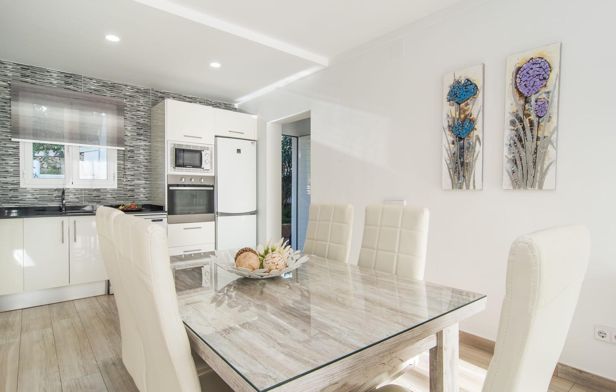Ihre großzügige Ferienwohnung hat neben dem Meerblick noch viel mehr zu bieten: Der Innenbereich ist wunderbar hell, modern und freundlich. Es wurde mit viel Liebe zum Detail eingerichtet und dezent dekoriert, um einen Ort zum Wohlfühlen zu schaffen. Neben der mit hochwertigen Geräten ausgestatteten Küche, in der Sie kulinarisch kreativ werden können, gibt es einen offenen Wohn- und Essbereich zum gemütlichen Zusammensitzen, für Fernsehabende oder das gemeinsame Frühstück. Wenn Sie sich zurückziehen möchten, begeben Sie sich in eines der beiden ansprechend und geschmackvoll gestalteten Schlafzimmer, die nicht nur über bequeme Betten, sondern auch über ausreichend große Kleiderschränke für Ihre Urlaubsgarderobe verfügen. Besonders praktisch: Zu jedem Schlafzimmer gibt es ein schickes En-Suite-Badezimmer, sodass Sie hier maximale Privatsphäre genießen können. Die Ferienwohnung „Playa D’Or“ punktet mit einer echten Top-Lage in Cala D’Or im Süden Mallorcas: Nur etwa 700 m Fußweg von Ihrer Wohnung bis zur wunderschönen kleinen Cala Esmeralda. Und nicht nur der Strand, sondern auch der nächste Supermarkt sind über die akustisch wahrnehmbare Straße bequem zu Fuß zu erreichen. Die schicke Wohnung mit Balkon und Meerblick liegt in einer gepflegten Anlage mit großem Gemeinschaftspool.