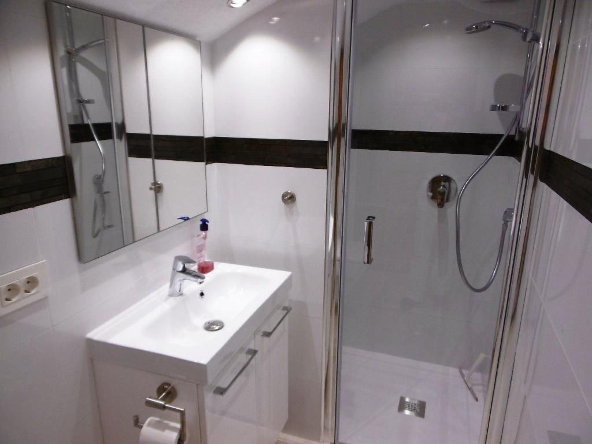 Gegenüber der Küche befindet sich ein Schlafzimmer mit 2 Einzelbetten sowie ein weiterer SAT-TV. Das zugehörige renovierte Bad ist mit einer Dusche, Waschbecken mit Unterschrank sowie Spiegelschrank und einem WC ausgestattet.