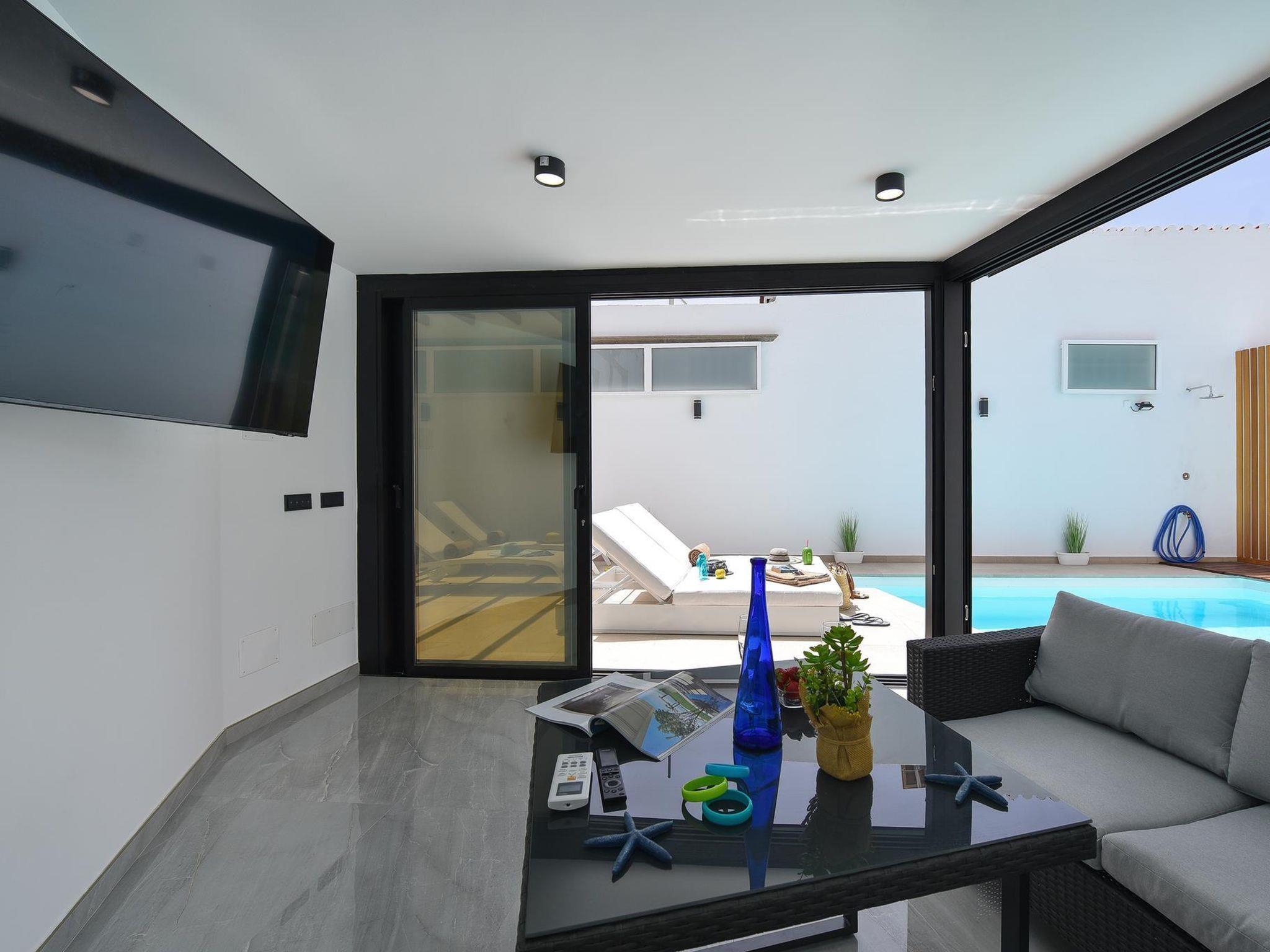 Moderne, komfortable Villa "Villa Aisha". Im Ortszentrum von Playa del Inglés, zentrale, belebte Lage. Zur Alleinbenutzung: Grundstück (eingezäunt), Schwimmbad (4 x 4 m, 150 - 150 cm tief, saisonale Verfügbarkeit: 01.Jan. - 31.Dez.). Aussendusche. Im Hause: Klimaanlage. Öffentliche Parkplätze auf der Strasse. Einkaufsgeschäft, Supermarkt 200 m, Bushaltestelle "Shopping Center Cita" 10 m. Der Besitzer akzeptiert keine Jugendgruppen. Bitte beachten: Flugplatz 35 km vom Haus. Die Nachbarschaft ist sehr lärmempfindlich. Ruhe und gutes Benehmen wird erwartet.