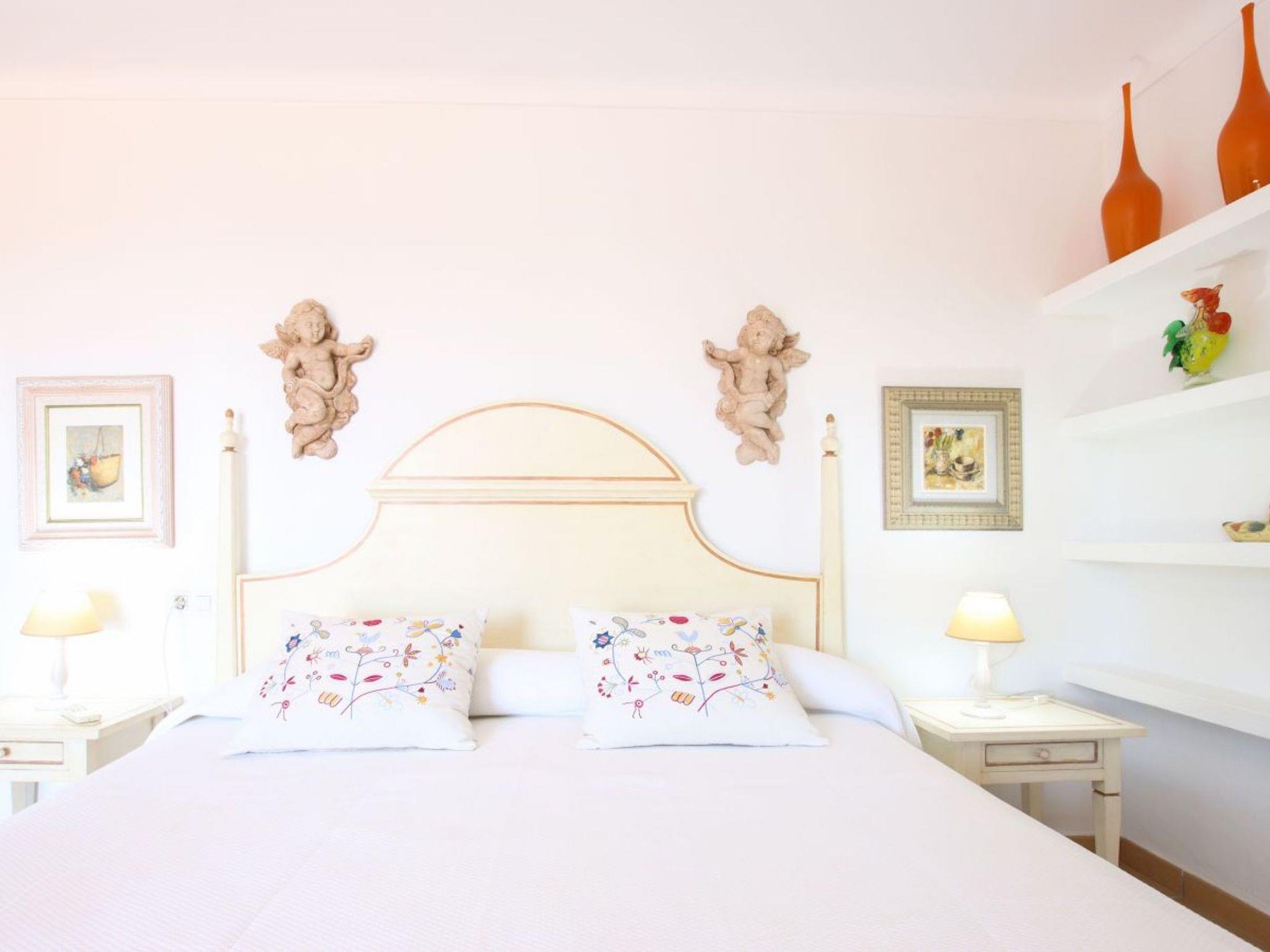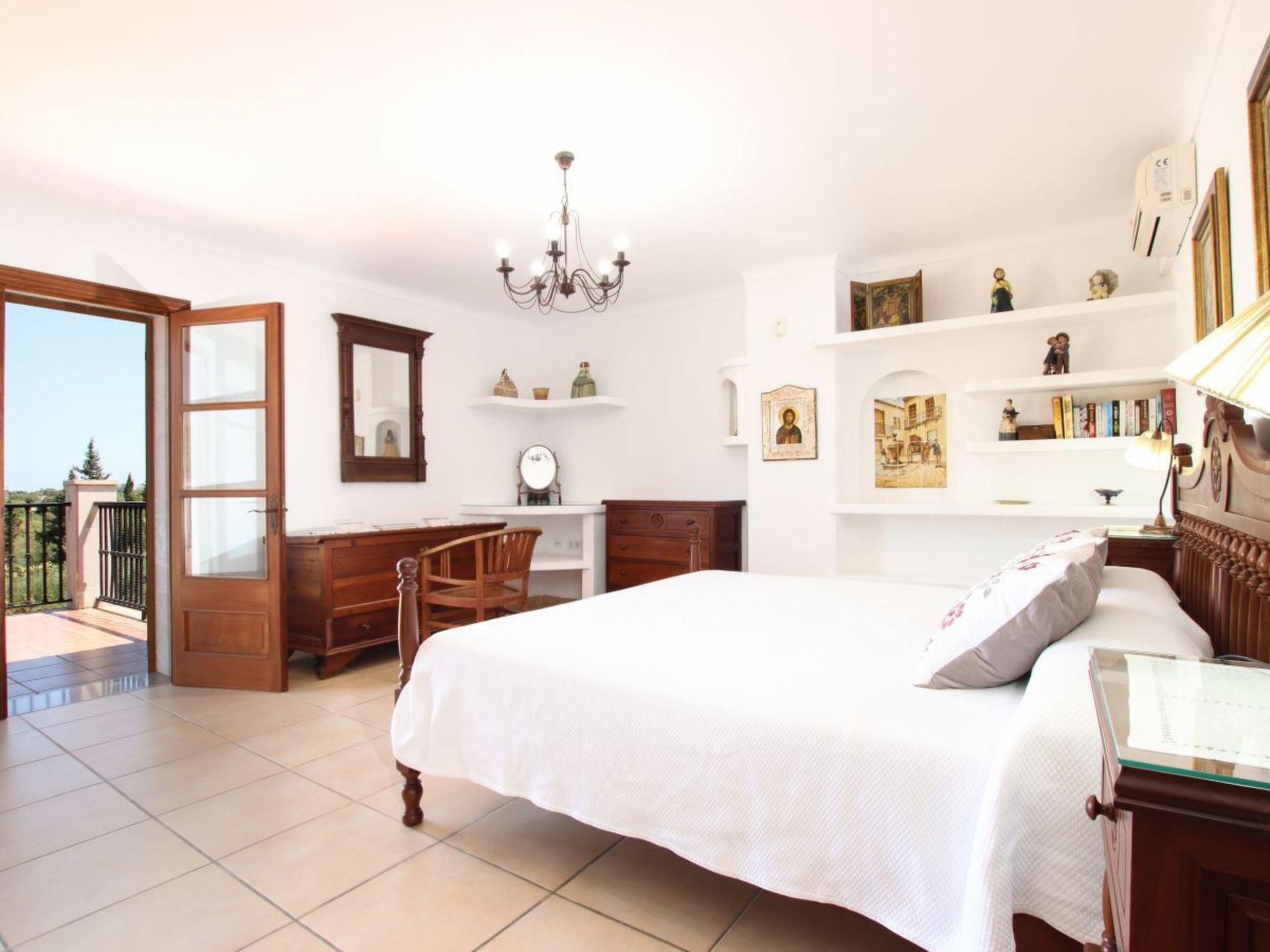 Im Obergeschoss befindet sich das Hauptschlafzimmer mit einem Kingsize-Mahagonibett, einem individuell geschnitzten Kopfteil und Einbauschränken. Dieses Zimmer hat ein wunderschönes en-suite Badezimmer und eine private, möblierte Sonnenterrasse mit weitem Meer- und Bergblick. Das zweite Schlafzimmer verfügt ebenfalls über ein weiß gestrichenes Kingsize-Bett mit geschnitztem Kopfteil und Einbauschränken, ein eigenes Bad und eine eigene möblierte Sonnenterrasse, die zum Entspannen einlädt, während man den Blick auf den Sonnenuntergang genießt. Das dritte Schlafzimmer, ein Superior-Doppelzimmer, verfügt über Teakholzbetten und Einbauschränke, ein komplettes Badezimmer und eine eigene möblierte Terrasse mit Blick auf den Pool. Das vierte Schlafzimmer verfügt ebenfalls über zwei Teakholzbetten und Einbauschränke, ein komplettes Badezimmer und eine private Sonnenterrasse mit weitem Meer- und Bergblick. Alle Schlafzimmer sind klimatisiert. Um Energie zu sparen und die Effizienz zu steigern, verfügt diese Villa über eine programmierte Klimaanlage, die während der Mittagszeit und in der Nacht genutzt werden kann.