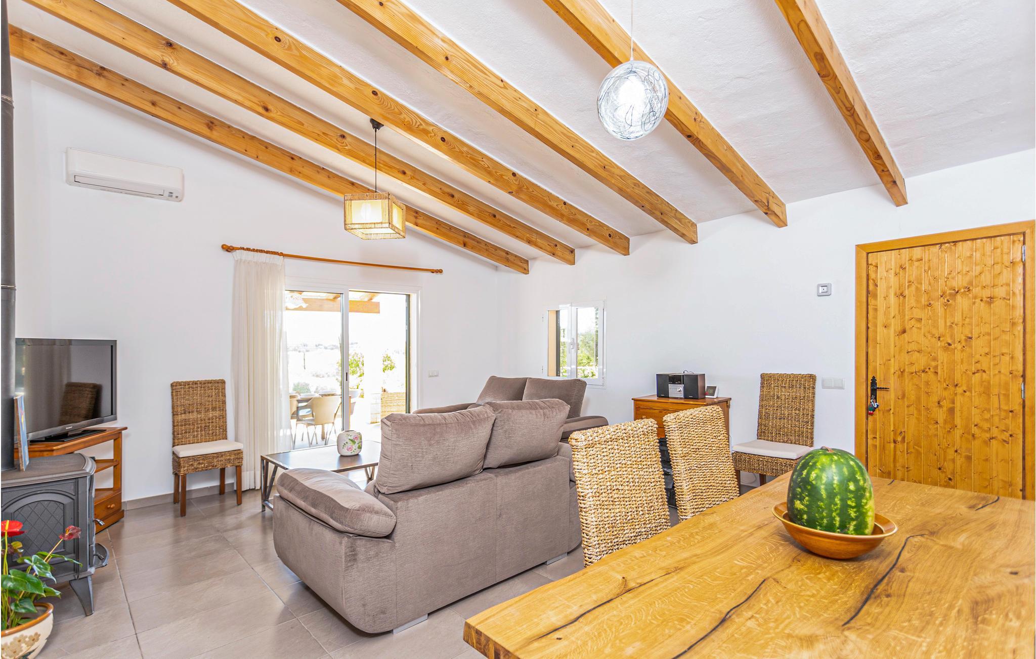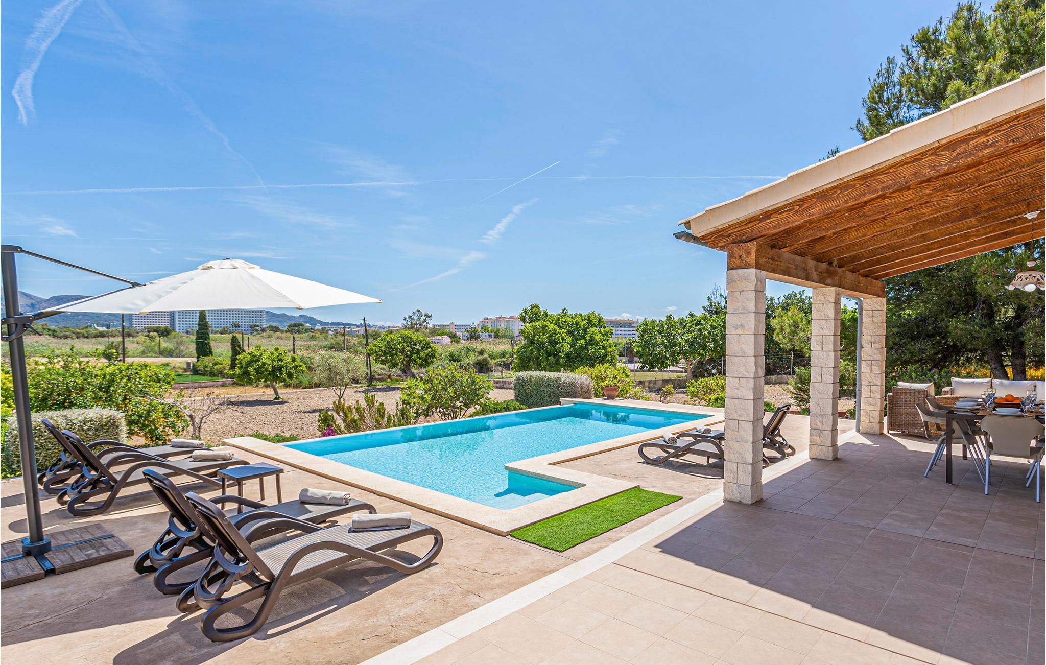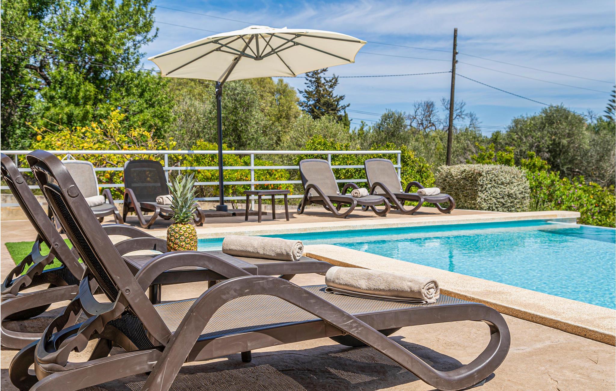Eine praktische, ebenerdige Finca mit freier Sicht über die weiten Felder und auf die eindrucksvolle Bergkette der Tramuntana. Mit dieser schönen Weitsicht genießen Sie Ihre Mahlzeiten auf der gemütlichen Terrasse beim modernen Infinity-Pool. Dieser ist durch die schonende Osmose-Aufbereitung leicht salzhaltig und besonders hautfreundlich. Einer der längsten und schönsten Sandstrände der Insel liegt nur 2 km entfernt. Vorwiegend in der Hochsaison geht es dort recht quirlig zu und Sie finden viele Restaurants, Bars und Einkaufsmöglichkeiten. Der Eigentümer hält einige Hühner auf der Rückseite des Grundstücks. Gruppen (ausgenommen Familien und Pärchen ü30) auf Anfrage und mit Spezialkaution.