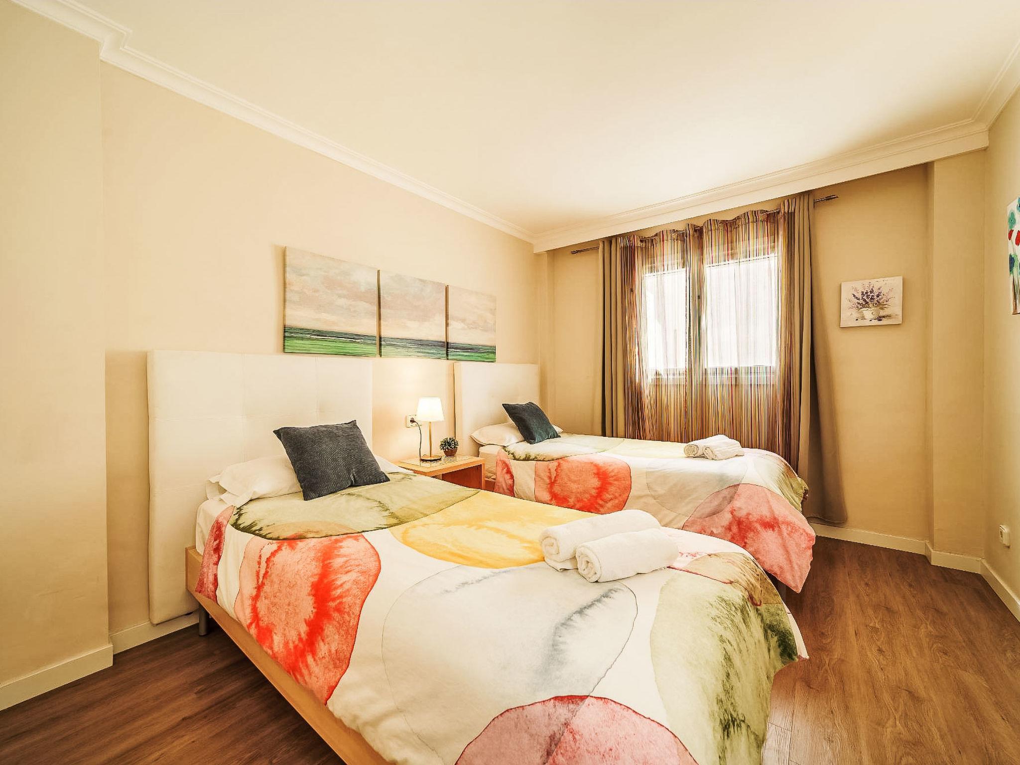"Mariners 4", 4-Zimmer-Wohnung 110 m2 im 4. Stock. Geräumig und hell, komfortabel und gemütlich eingerichtet: Wohn-/Esszimmer mit offenem Kamin, Esstisch, Digital-TV, Flachbildschirm, Klimaanlage und Warmluftheizung. 1 Doppelzimmer mit 1 franz. Bett (180 cm, Länge 200 cm), Klimaanlage und Warmluftheizung. Ausgang zum Balkon. 2 Doppelzimmer, jedes Zimmer mit 2 Betten (90 cm), Klimaanlage und Warmluftheizung. Grosse Küche (Backofen, Geschirrspüler, 3 Glaskeramikplatten, Mikrowelle, Tiefkühler, elektrische Kaffeemaschine). 2 Duschen/WC. Balkon 10 m2. Balkonmöbel. Eingeschränkte Sicht auf das Meer. Zur Verfügung: Waschmaschine, Bügeleisen, Kinderhochstuhl, Babybett bis 2 Jahre, Haartrockner. Internet (WLAN, gratis). ETVPL12598