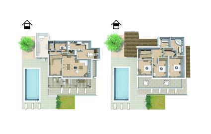 Wenn Ihr Körper vollständig im erfrischenden Pool auf der Terrasse eingetaucht ist, Sie ein paar Runden geschwommen sind und den Blick von den schattigen Bäumen auf die Bucht genossen haben, werden Sie vielleicht vor Staunen über diesen wunderschönen Ausblick aus der Adlerperspektive aufatmen. Ob Sie den Panoramablick auf die Boote genießen möchten, die in Richtung des nahegelegenen Yachthafens steuern, oder sich für ein kleines Nickerchen auf die Holzliegen zurückziehen möchten, bleibt ganz Ihnen überlassen. Die wellenförmigen Sonnenliegen aus Holz sind so geformt, dass sie die Wellen des Meeres imitieren. Je nach Jahreszeit ist die überdachte Terrasse von grünen Kletterpflanzen umgeben, die zusammen mit dem kleinen Rasenstück und vielen weiteren Pflanzen neben dem Haus ein sehr naturnahes Ambiente schaffen. Dies ist der perfekte Ort, um in guter Gesellschaft den Nachmittag zu beginnen und Pläne für Ausflüge in die Umgebung zu schmieden. Der große Balkon im Obergeschoss ist ein weiterer toller Ort, um die Sonne und die frische Luft in vollen Zügen zu genießen.