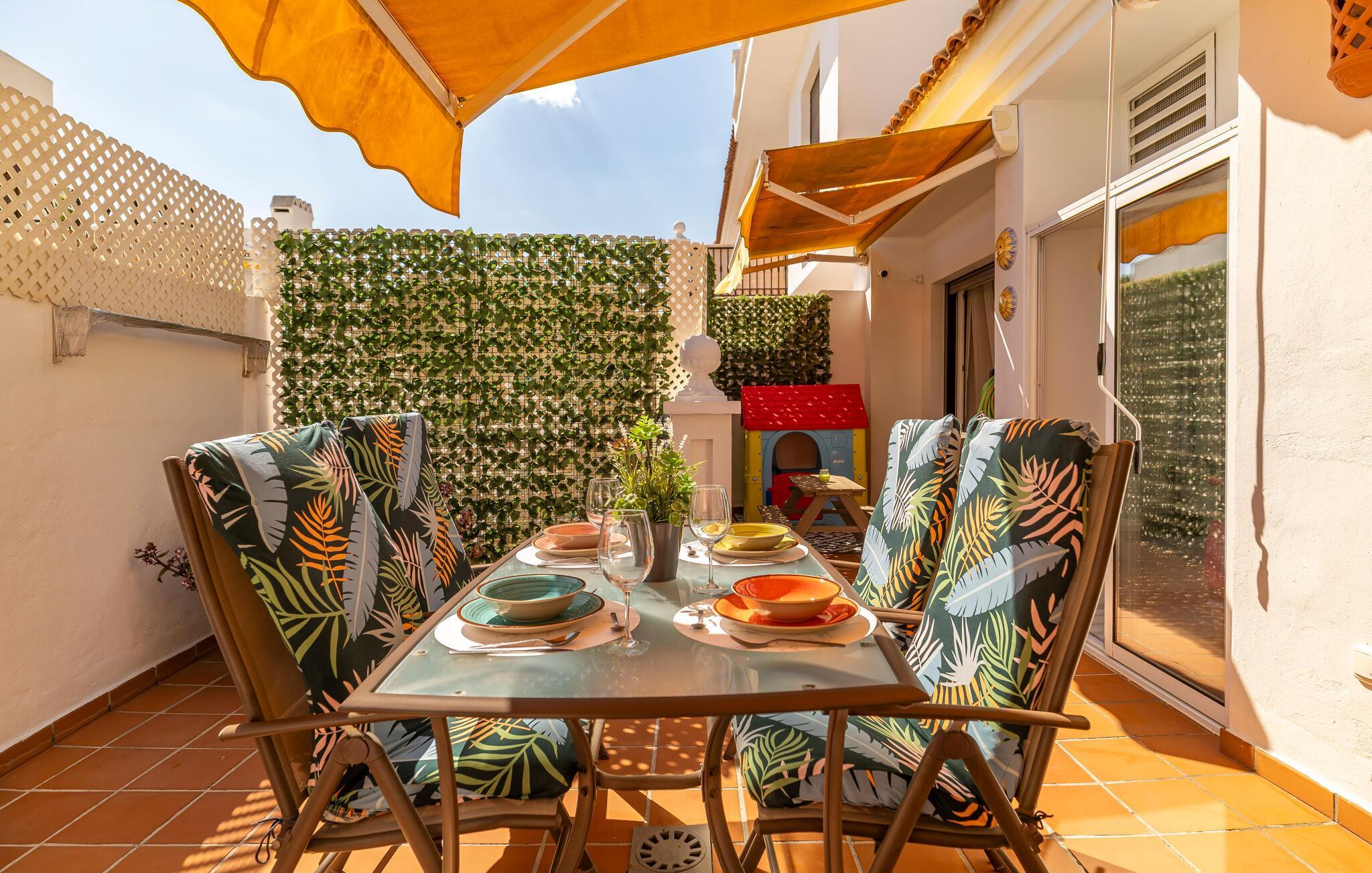 Auf Ihrer blickgeschützten Terrasse können Sie entspannt mit einem ausgedehnten Frühstück in den Tag starten oder sich im Schatten der Markise in ein gutes Buch vertiefen, während sich der Rest der Familie am großen Gemeinschaftspool austobt und Sonne tankt.