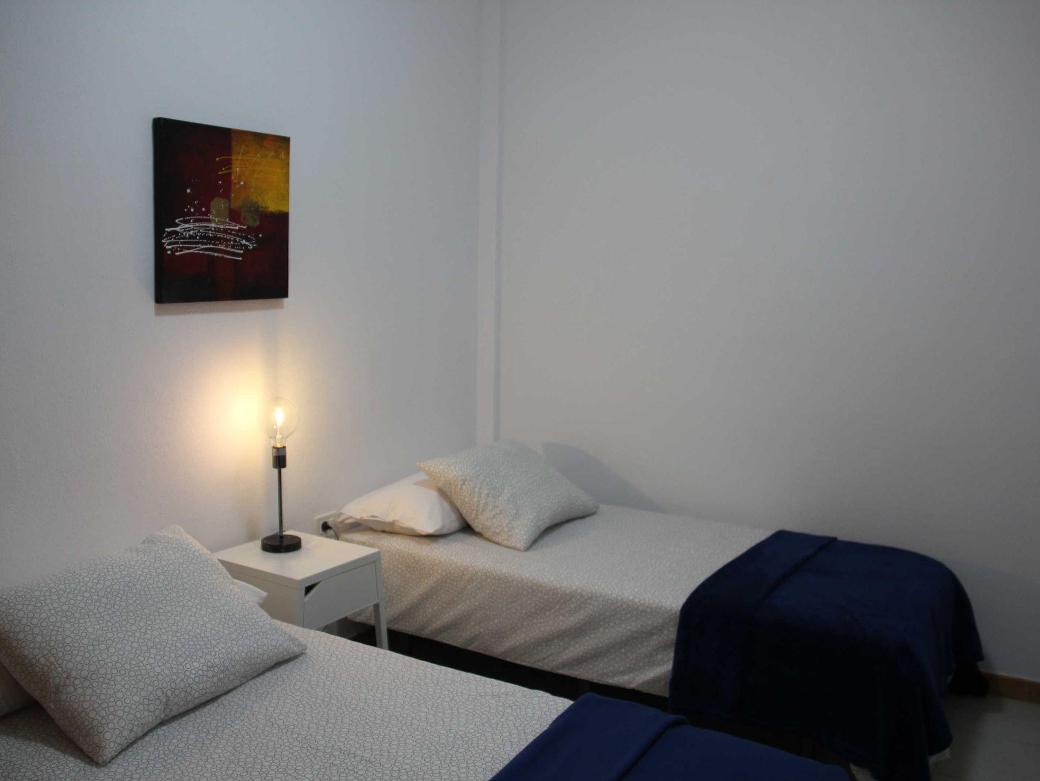 Am Ende des Flurs liegt das zweite Schlafzimmer, ebenfalls mit 2 Einzelbetten, großem Einbaukleiderschrank sowie Nachttisch nebst Lampe. Auch hier geht das Fenster in den Patio und es verfügt, ebenso wie das andere über einen Verdunkelungsvorhang samt schöner Gardine oben drüber.