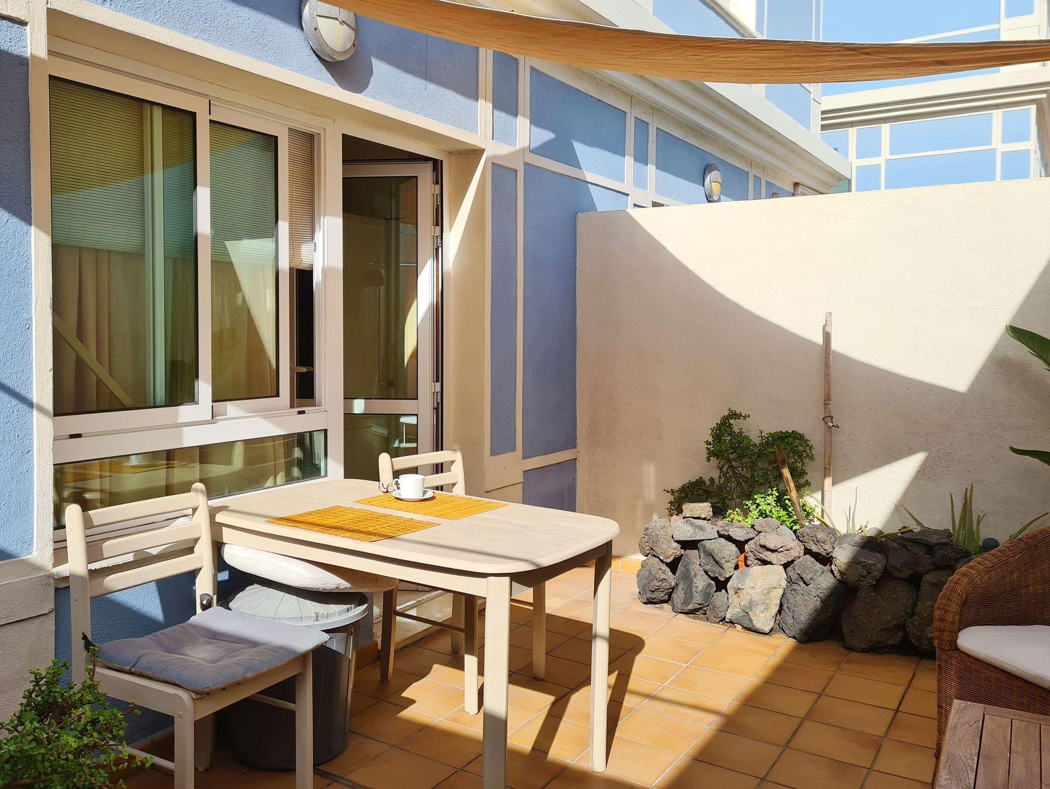 Das ebenerdige Apartment hat zwei Terrassen, eine vorne raus zum Meer und eine im Patio, zur entgegengesetzten Seite. Beide sind möbliert und bepflanzt und bieten je nach Sonnenstand Schatten oder Wärme. Meerblick von der vorderen Terrasse hat man nur im Stehen, aber die Promenade ist direkt gegenüber.