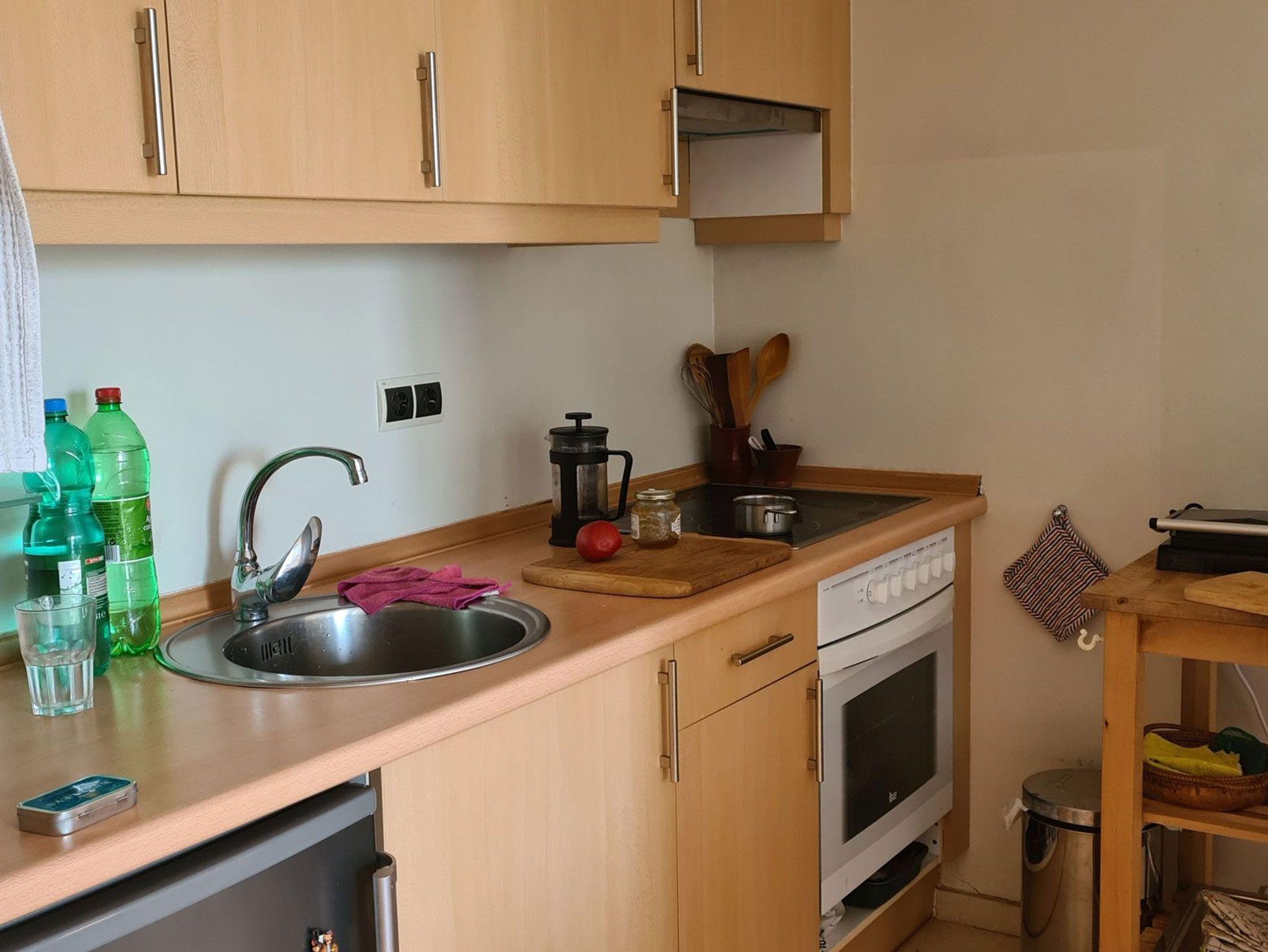 • Küchenzeile mit Ceran (4 Felder), Backofen, Dunstabzug, Kaffeemaschine, Cafetera, Toaster, Kühlschrank mit Gefrierfach, Stabmixer, Wasserkocher