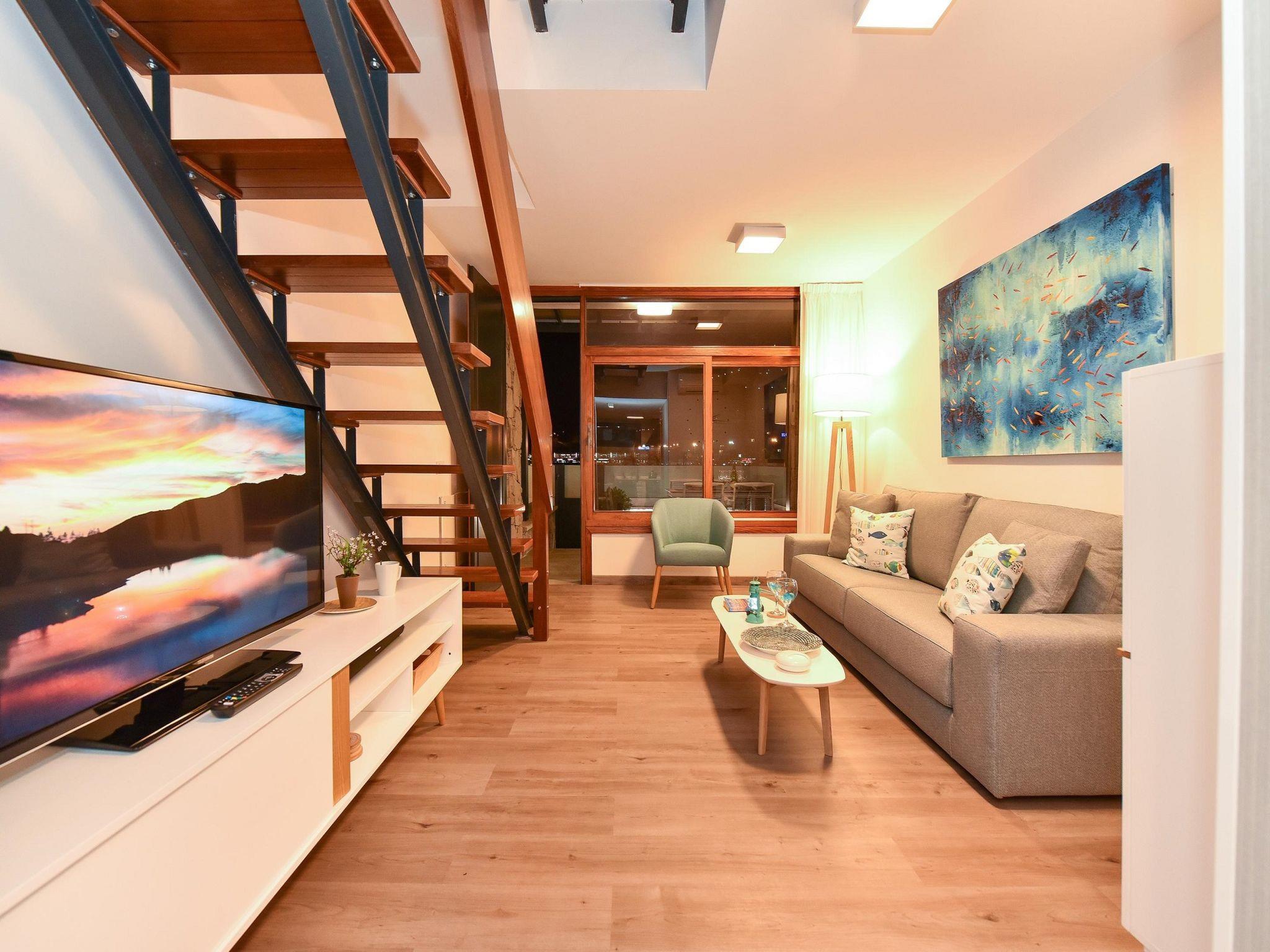 "Morea Suites 1", 3-Zimmer-Maisonette-Wohnung. Objekt geeignet für 4 Erwachsene. Hell, komfortabel und gemütlich eingerichtet: Wohnzimmer mit TV, Flachbildschirm und Klimaanlage. Ausgang zum Gartensitzplatz. Offene Küche (Backofen, Geschirrspüler, 4 Glaskeramikplatten, Toaster, Wasserkocher, Mikrowelle, Tiefkühler, elektrische Kaffeemaschine). Bad. Obergeschoss: (steile Treppe) 1 Zimmer mit 1 Doppelbett (150 cm, Länge 200 cm), TV und Flachbildschirm. Ausgang zum Balkon. 1 Zimmer mit 1 Doppelbett (150 cm, Länge 200 cm), Klimaanlage. Bad/WC. Parkettboden. Gartensitzplatz. Liegestühle (4). Sehr schöne Sicht auf das Meer. Zur Verfügung: Waschmaschine, Wäschetrockner, Safe, Bügeleisen, Kinderhochstuhl, Babybett bis 2 Jahre, Haartrockner. Internet (WLAN, gratis). Bitte beachten: geeignet für Familien. Nichtraucher-Unterkunft. 2024-T27874