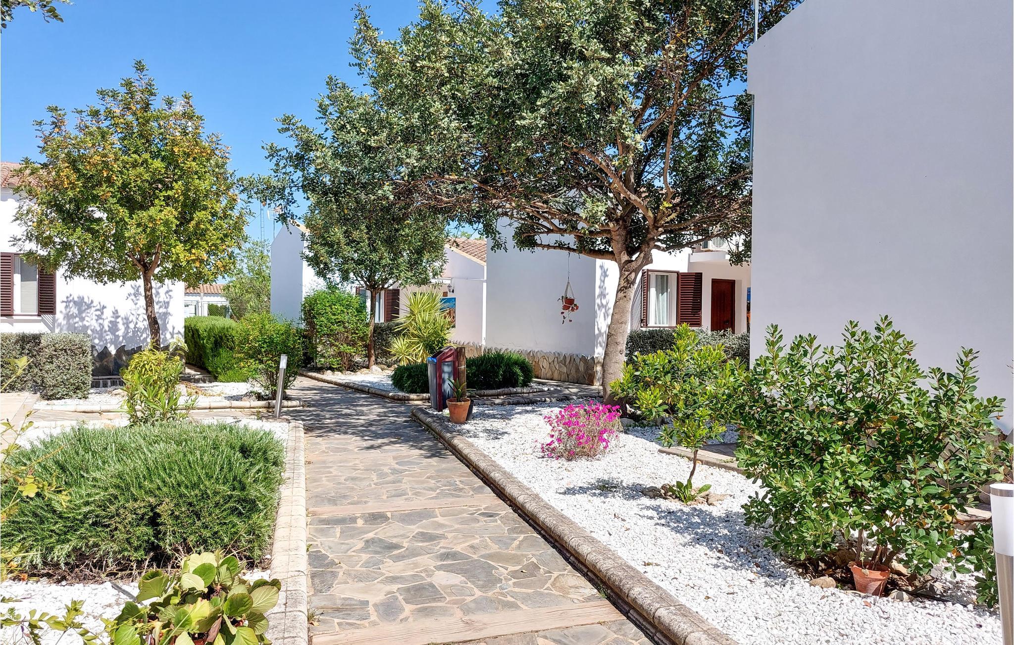 Ein Ferienhaus in einem Touristenkomplex mit Gemeinschaftspool und privatem Garten.