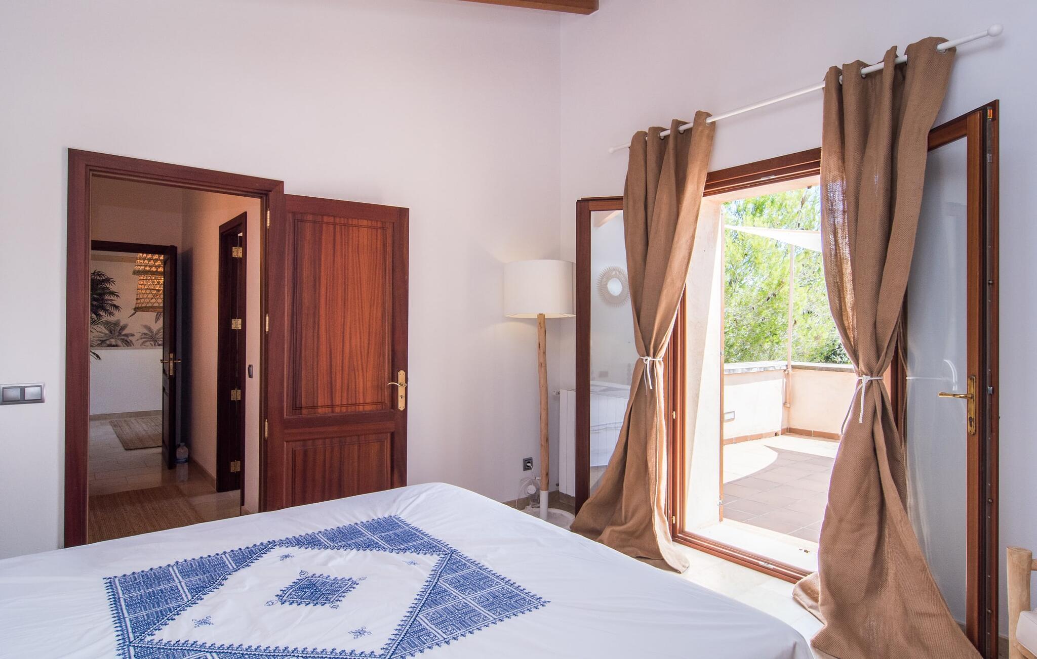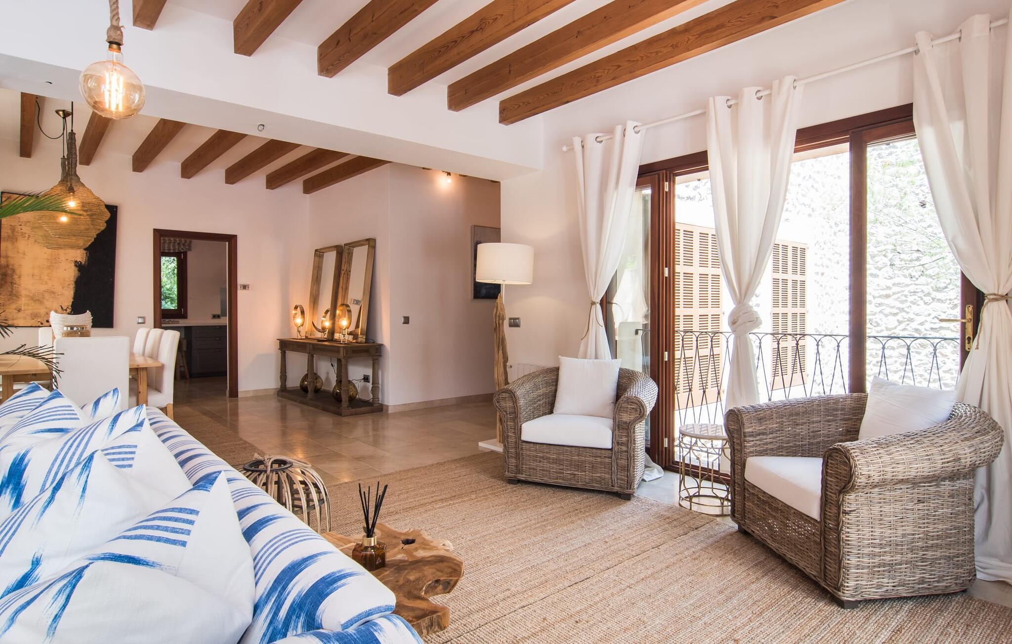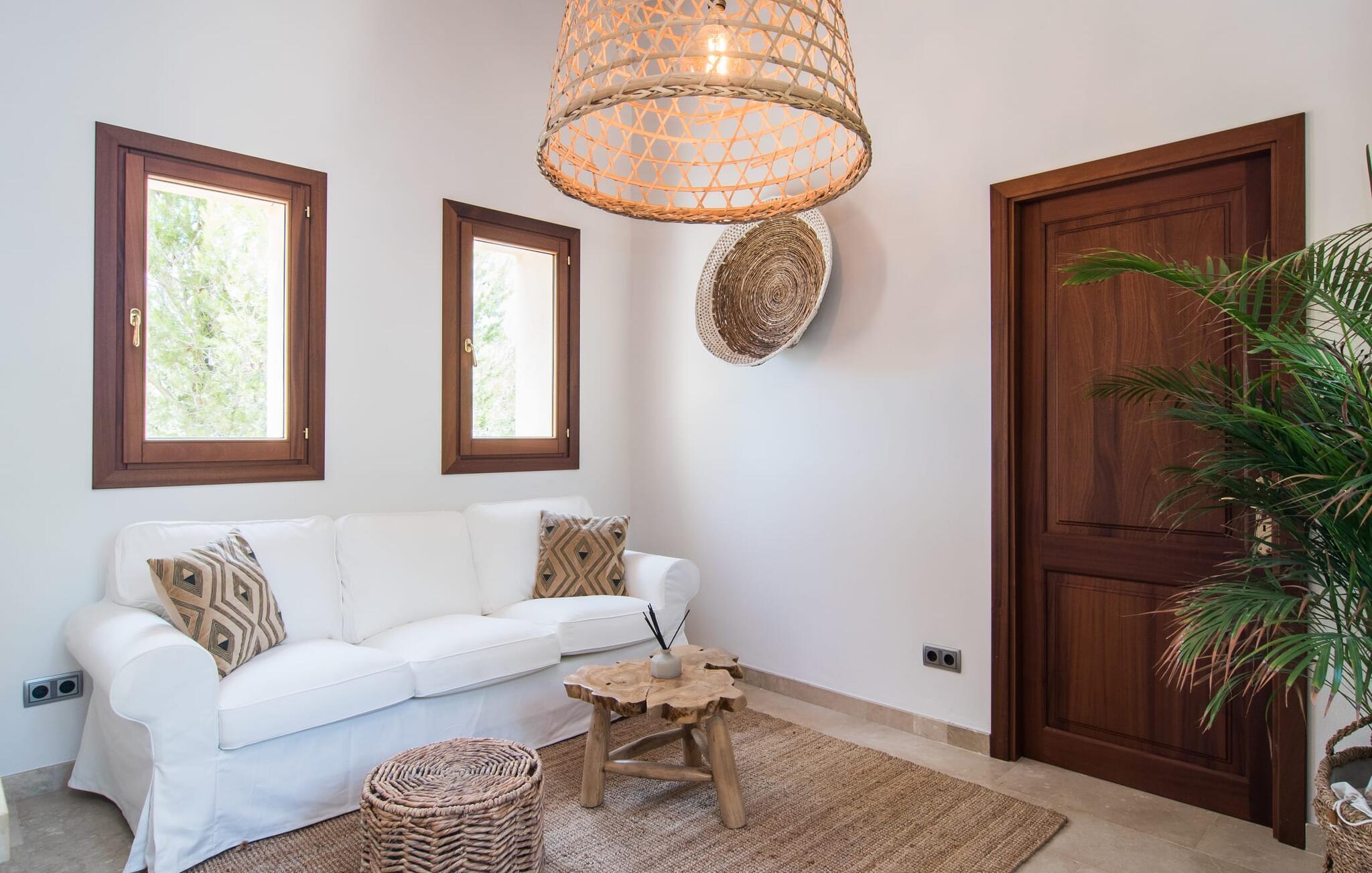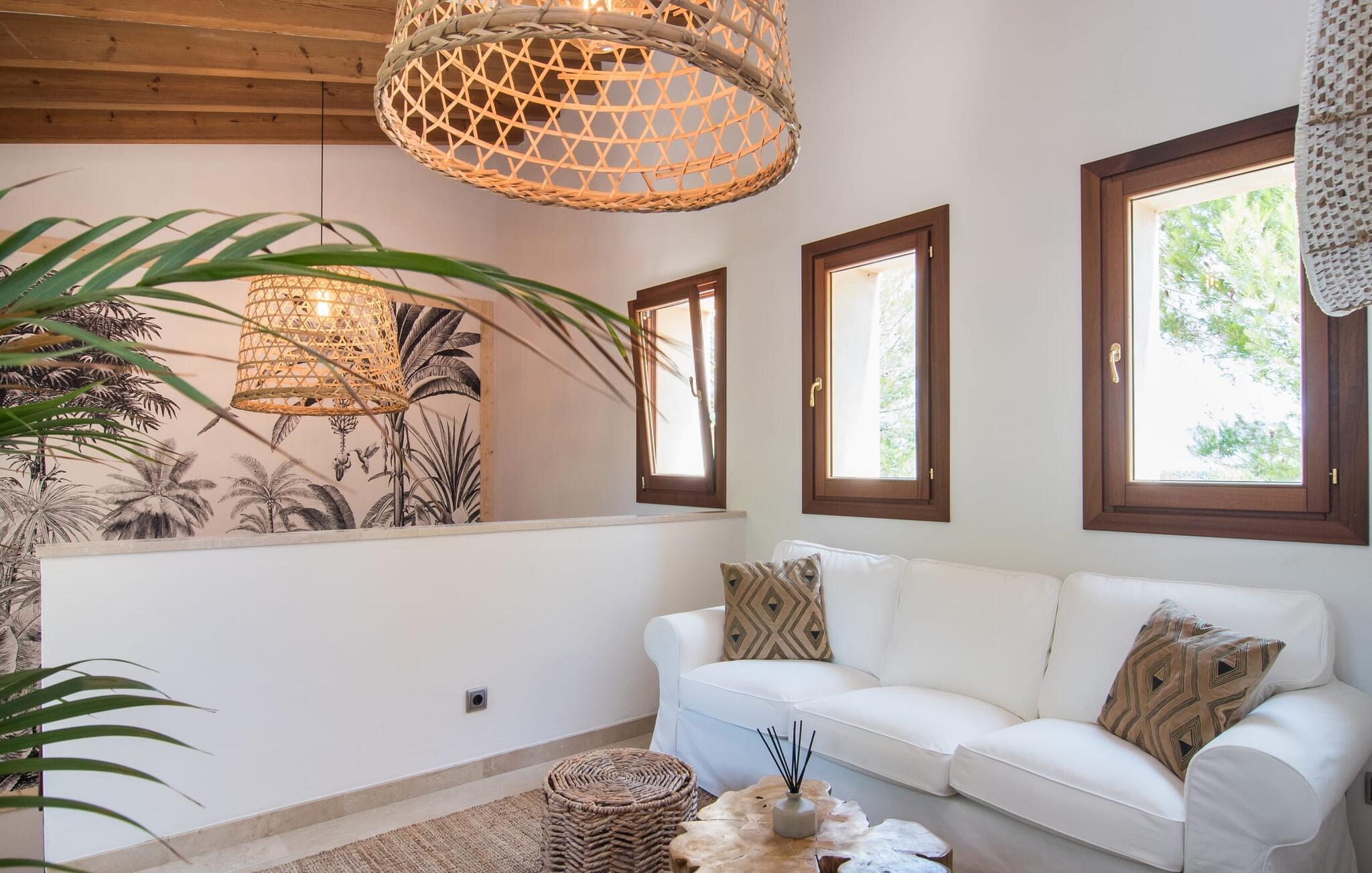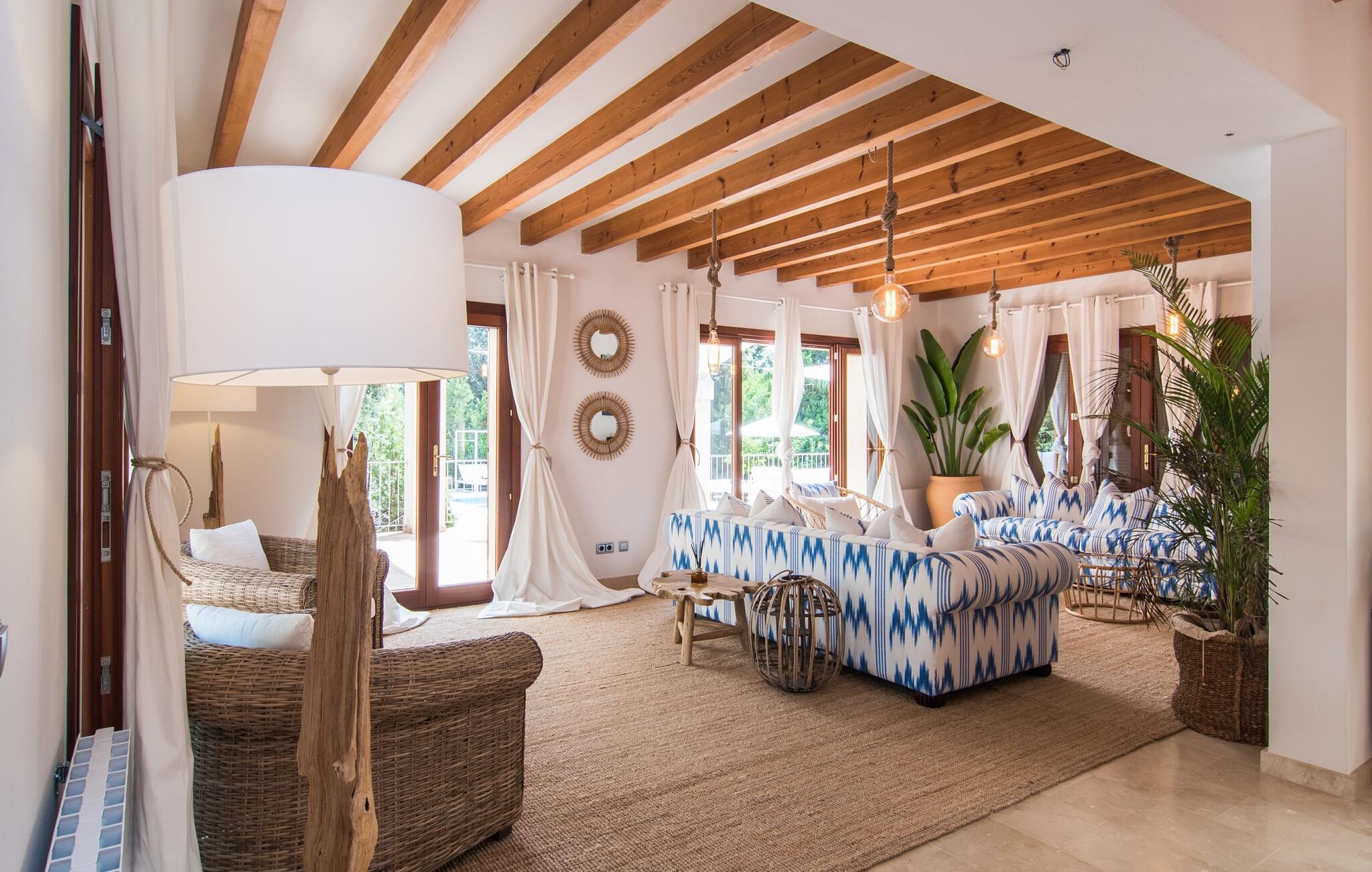 Die detaillierte Gestaltung lässt unser Herz höher schlagen – das gilt uneingeschränkt sowohl für den Außen- als auch für den Innenbereich. Helle, dezente Farben wie warme Braun- und Beigetöne sowie natürliche Materialien wie Bast, Holz und Korbgeflecht vereinen sich zu einem geschmackvollen Einrichtungsstil. Auf den bequemen Sofas finden sich mallorquinische Elemente wie Teixit de Lliggos – eine Leinwand mit einem Muster, das an flackernde Flammen erinnert. Auf einer weißen, mit der traditionellen Farbe Blau bedruckten Oberfläche verleihen sie dem Wohnbereich eine maritime Leichtigkeit. Der angrenzende Essbereich wurde vor den bodentiefen Fensterelementen zur Terrasse hin platziert. Die Einrichtung der komplett ausgestatteten, steingrauen Landhausküche setzt den modernen Komfort fort, auf den Sie im Urlaub nicht verzichten möchten (selbstverständlich können Sie Ihre Mahlzeiten aber auch mit Leckereien vom Grill ergänzen). Apropos Komfort: Das gilt auch für die drei Schlafzimmer, die durch insgesamt drei trendige Badezimmer mit begehbarer Dusche ergänzt werden – so profitieren Sie von absoluter Privatsphäre, auch wenn Sie mit einer weiteren Familie reisen. Gezielt ausgewählte Accessoires wie Lampen, Spiegel und Bilder in Bildern im Fototapeten-Stil runden das ausdrucksstarke Ensemble ab. Bei „Pula One“ kommen selbst Design-Liebhaber bei der Ausstattung auf ihre Kosten – aber überzeugen Sie sich am besten selbst.