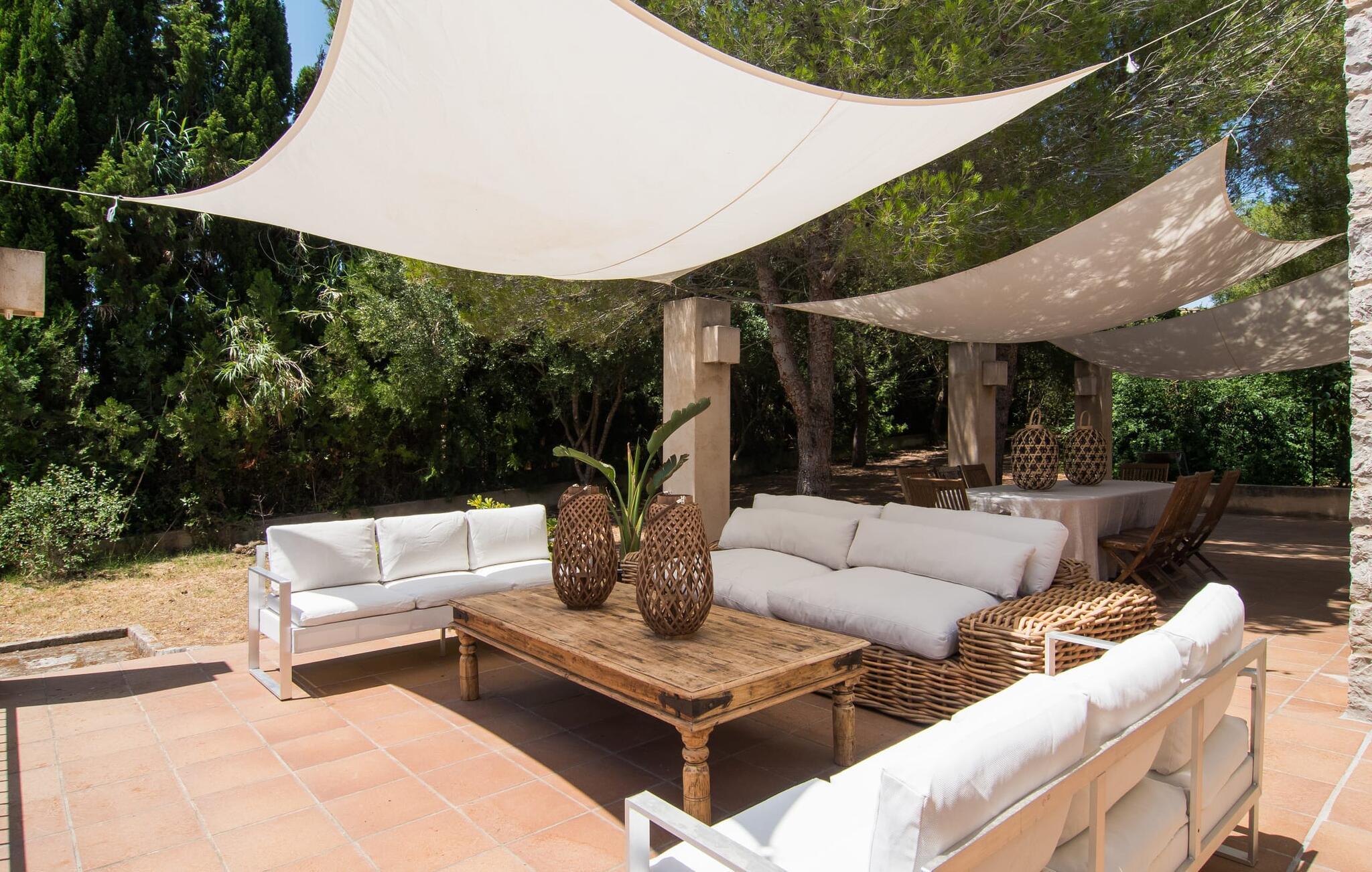 Mit seinem stolzen Namen verrät „Pula One“ bereits ein wenig von der Einzigartigkeit dieser Immobilie, die uns trotz unserer langjährigen Erfahrung immer noch beeindruckt. Die von Pinien verborgene Villa (passend, da die nächstgelegene Stadt Costa dels Pins ist) begeistert Besucher mit ihrem aufwendig gestalteten Außenbereich. Dazu trägt der völlig uneinsehbare, mit blauen Mosaikfliesen verzierte Pool bei. Umrahmt wird es von einem umlaufenden Loungebereich, in dem luxuriöse Entspannungsliegen im natürlichen Schatten oder unter den Sonnenschirmen platziert werden können. Im Sommer laden die beiden Daybeds im Bali-Stil nicht nur zur Mittagssiesta ein, sondern bieten auch einen attraktiven Platz für eine laue Sommernacht unter dem Sternenhimmel. Die Terrasse liegt direkt über dem Poolbereich. Die Korbmöbel wirken auf den ersten Blick grob, wurden aber elegant mit filigranen, bequemen Outdoor-Sofas aus Metall zusammengesetzt. Die beiden Sitzbereiche und der Esstisch sind in natürlichen Farben und Materialien gehalten. Sogar der Sonnenschirm besteht aus luftigen Segeln, die nicht nur Schatten spenden, sondern auch den gesamten Wohnbereich mit der Veranda verbinden. Dieser Raum offenbart den schlichten Wunsch nach hochwertigem Wohnen!